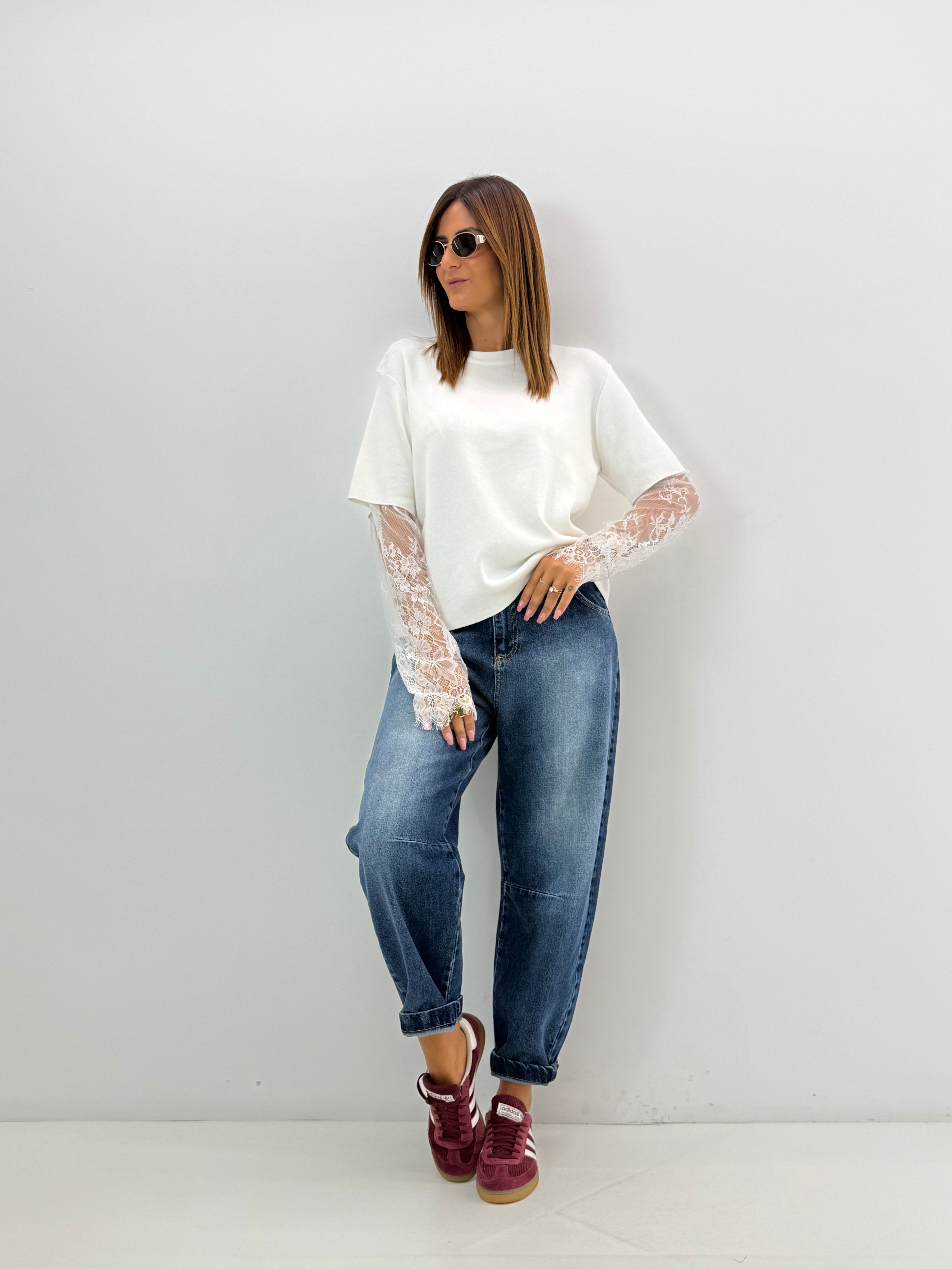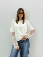 Maglietta a costine in viscosa, con maniche in pizzo.