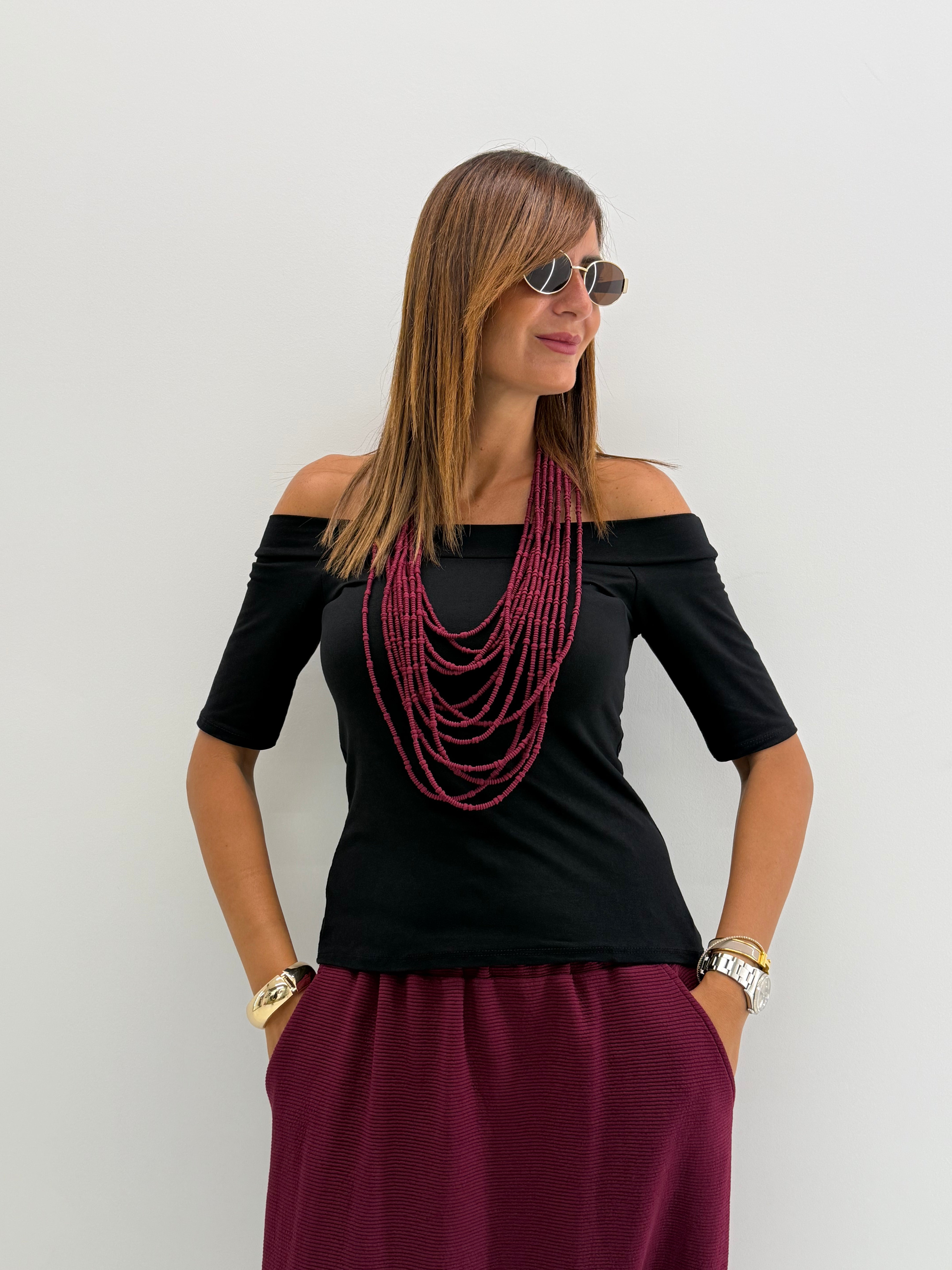 Maglia in misto viscosa, manica a 3/4 e scollo a barca.