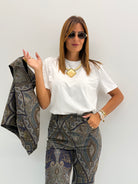 T-shirt in cotone, collo rotondo a costine e manica corta, taglia unica. Vestibilità leggermente over