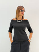 Maglia in cotone, manica a 3/4 e scollo a barca, orli a taglio vivo.