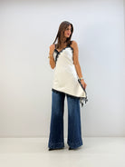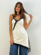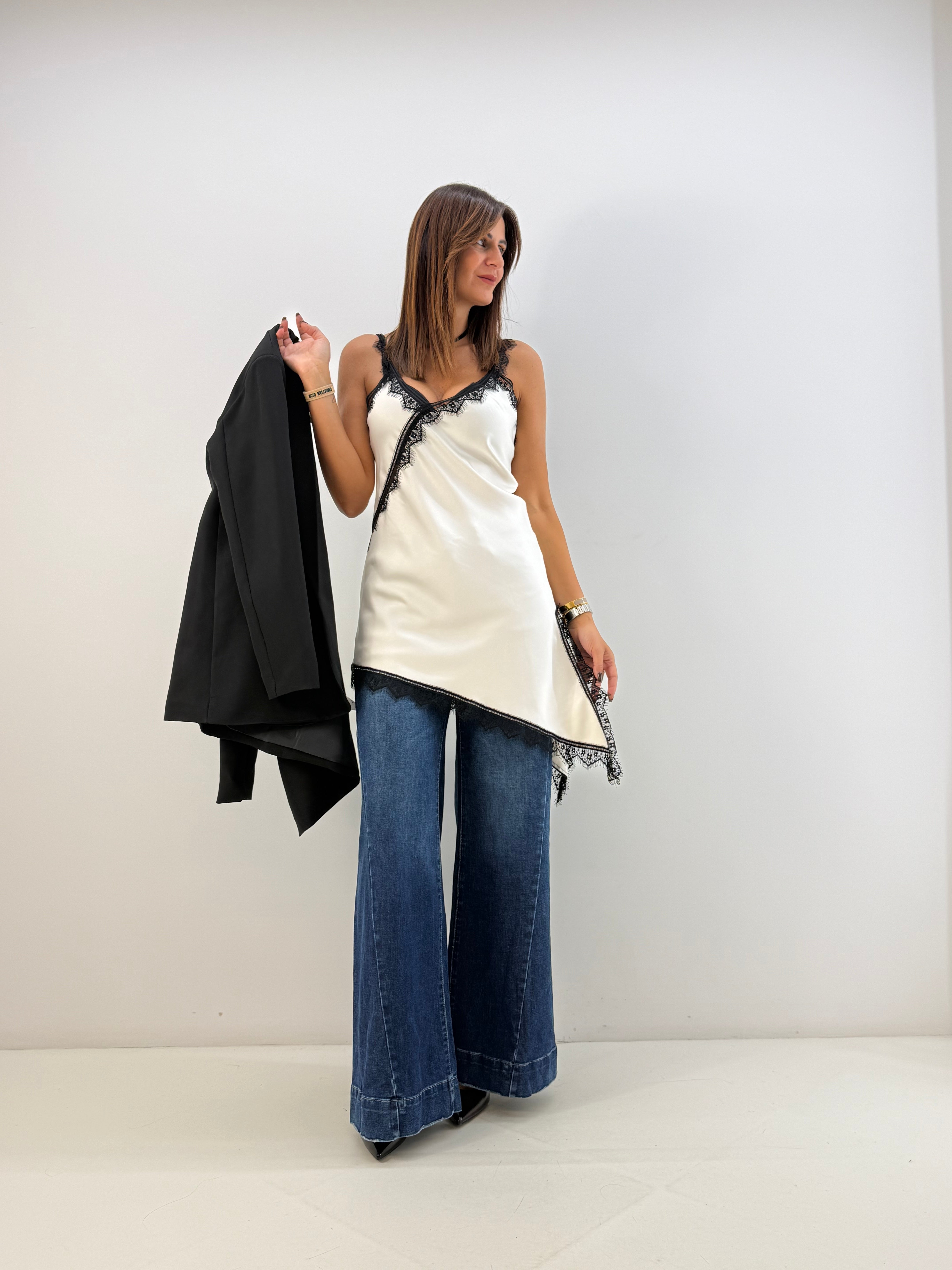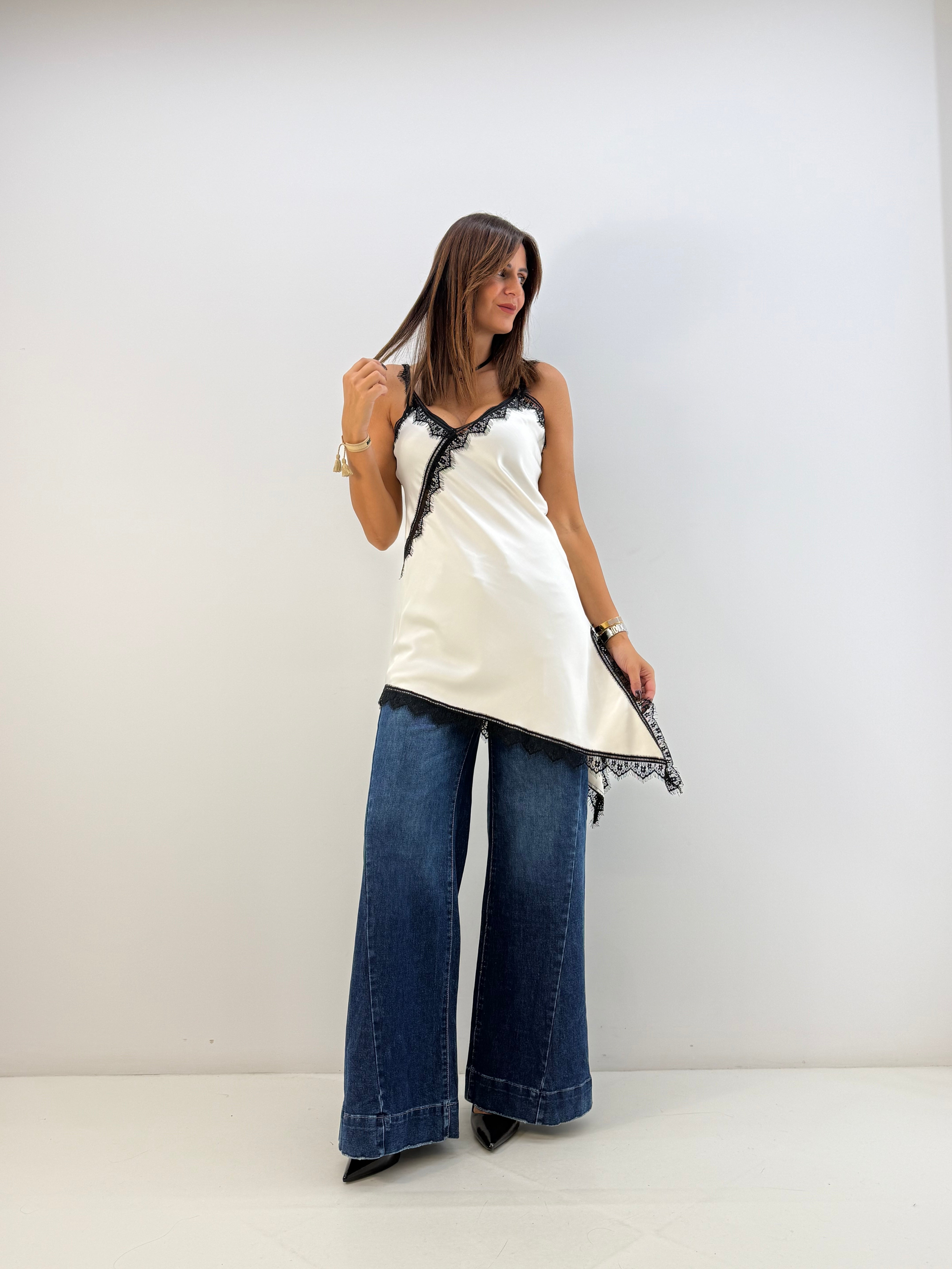Top/abito, effetto satin in viscosa e inserti in pizzo nero.