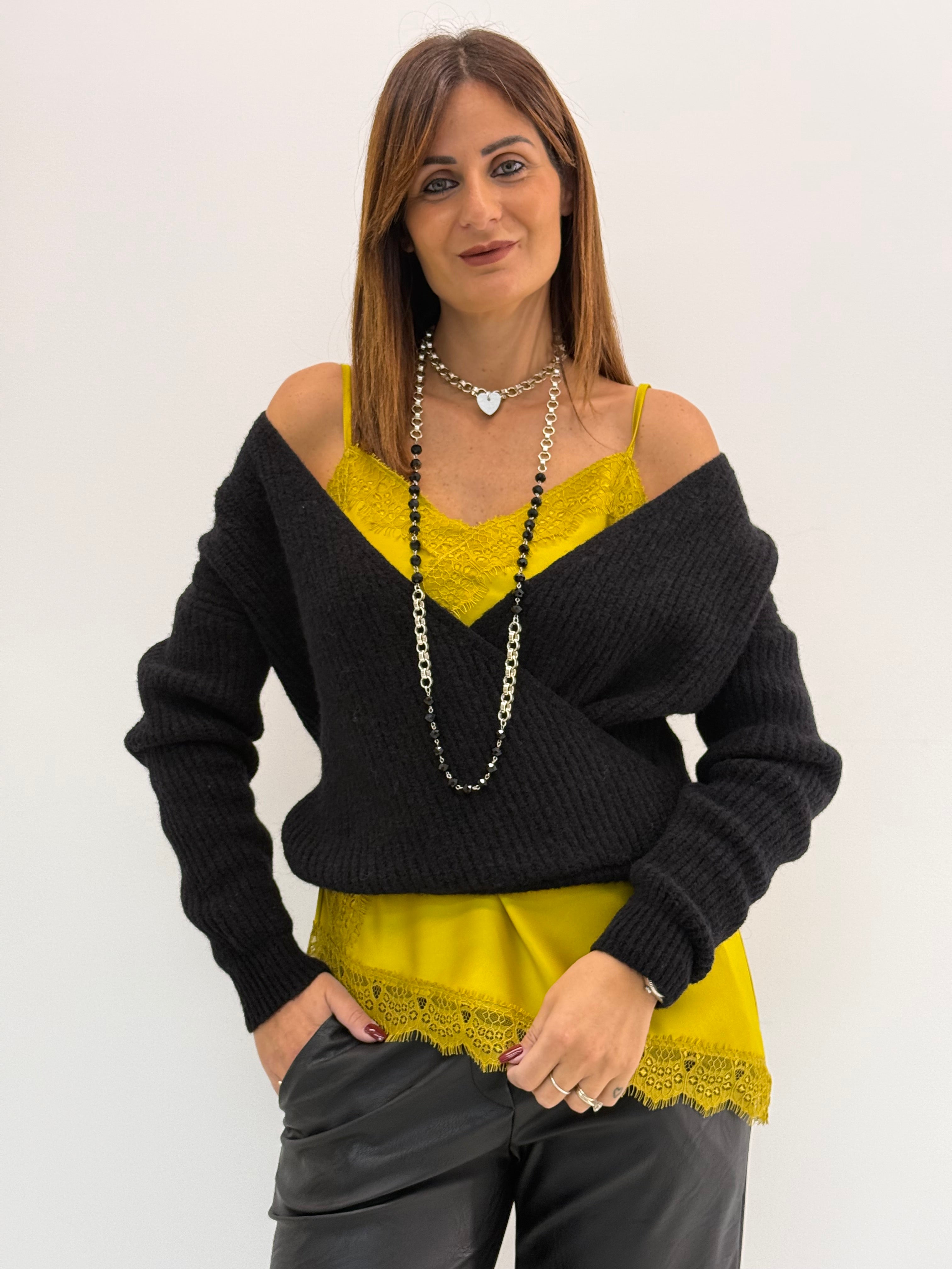 Top, effetto satin e inserti in pizzo, spalline regolabili, taglio asimmetrico.