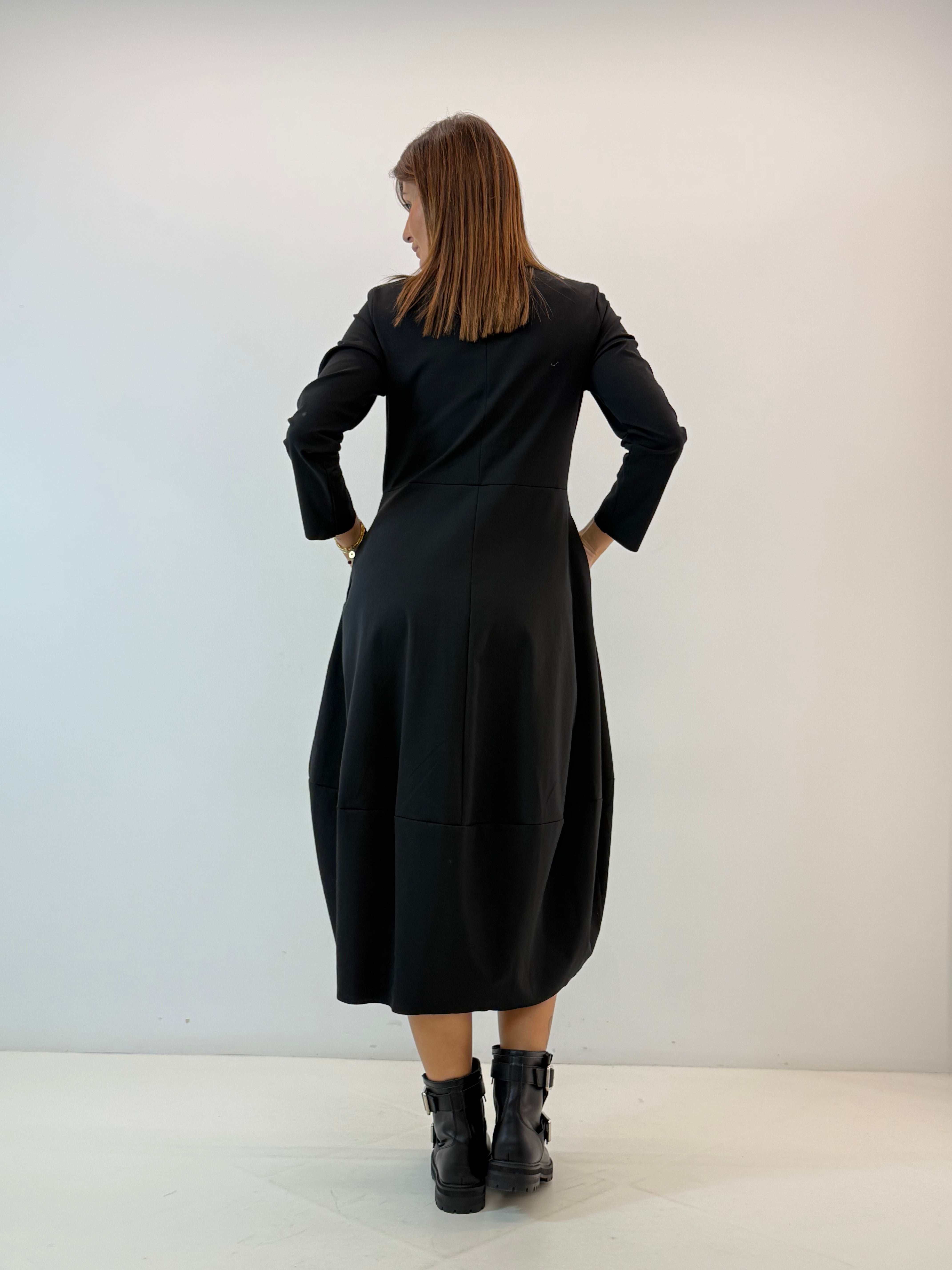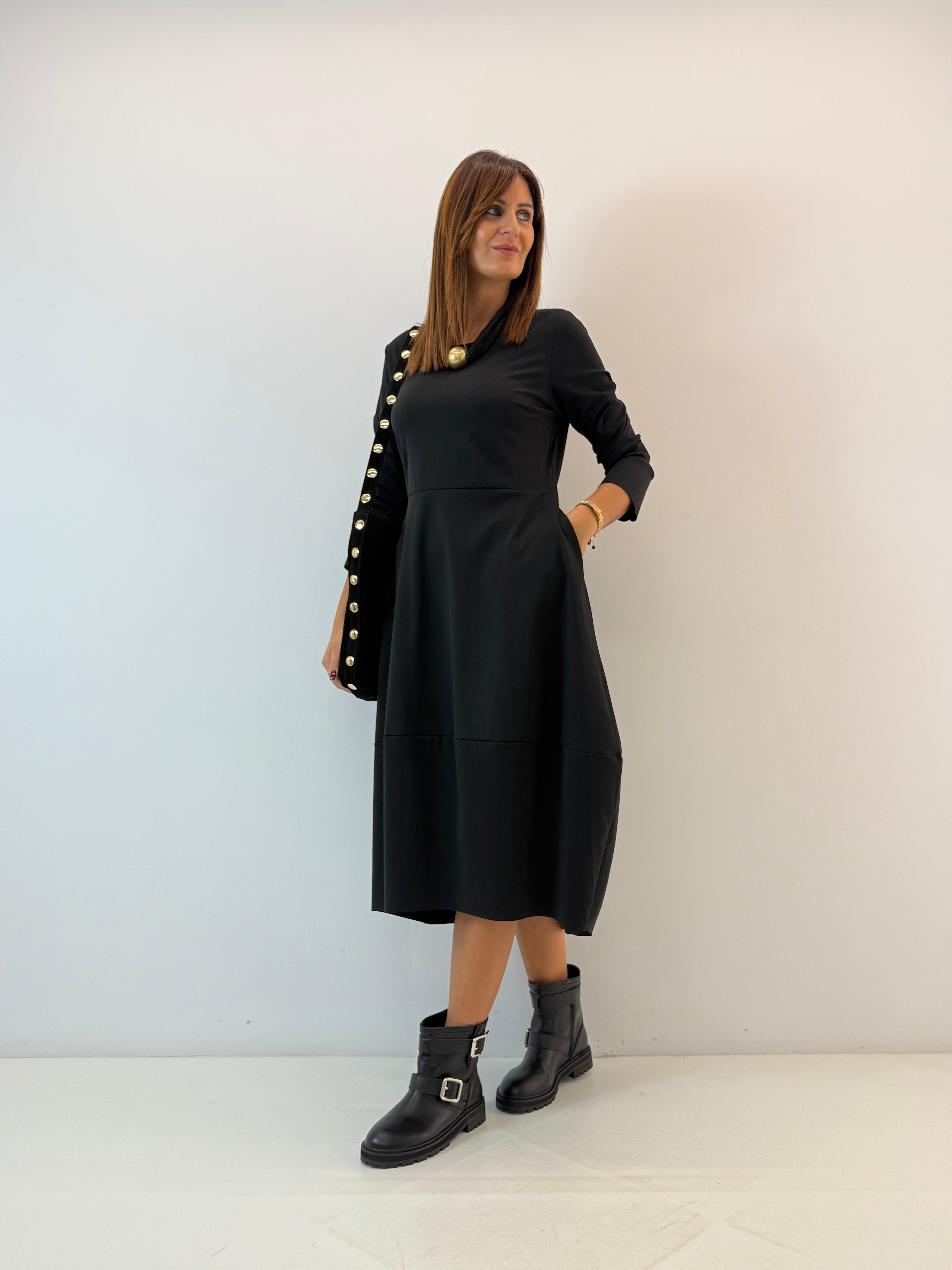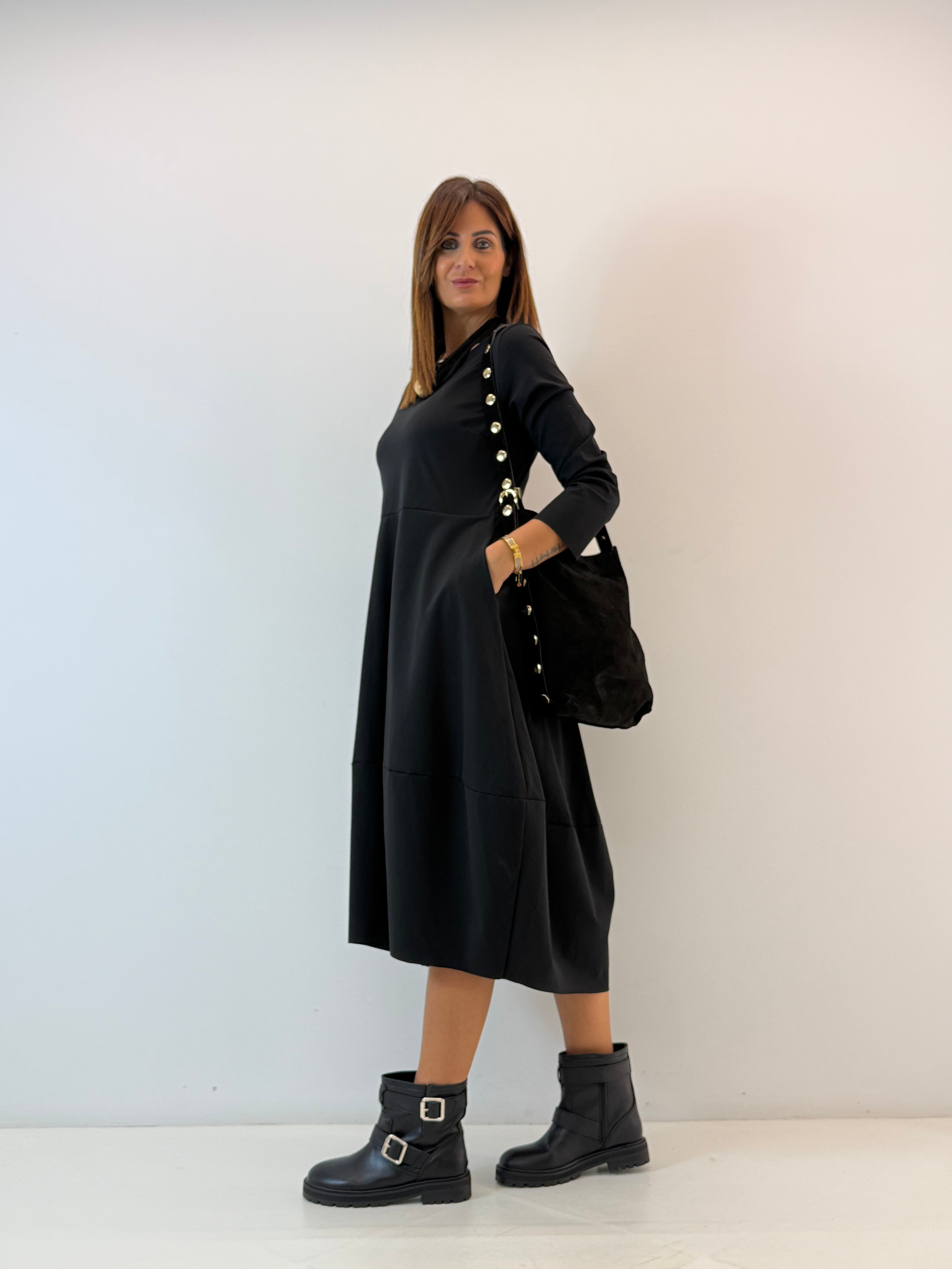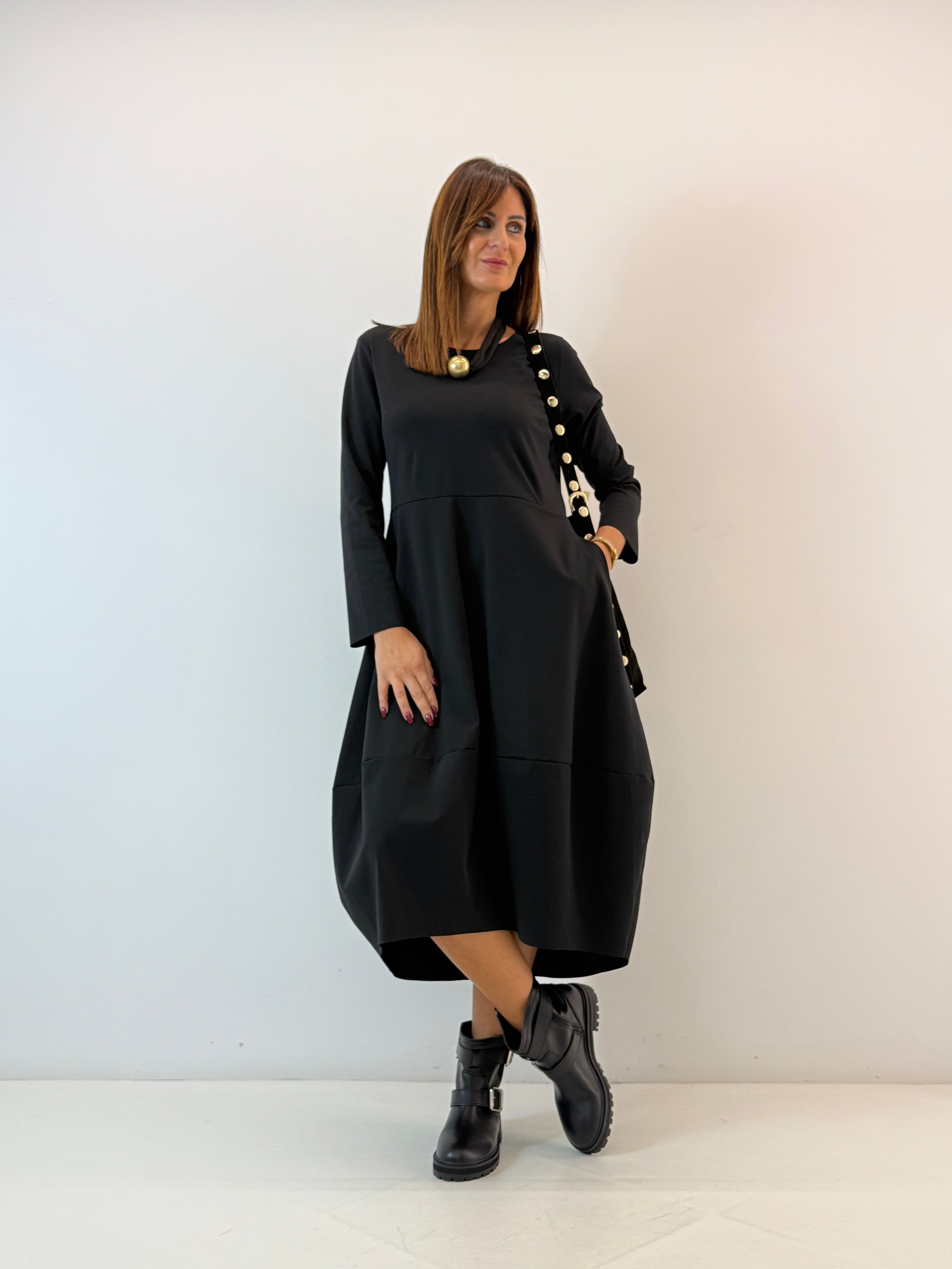 Abito in misto cotone. Scollo rotondo e maniche lunghe . Tasche laterali a scomparsa, taglio svasato dalla vita in giù. Vestibilità comoda e ampia.