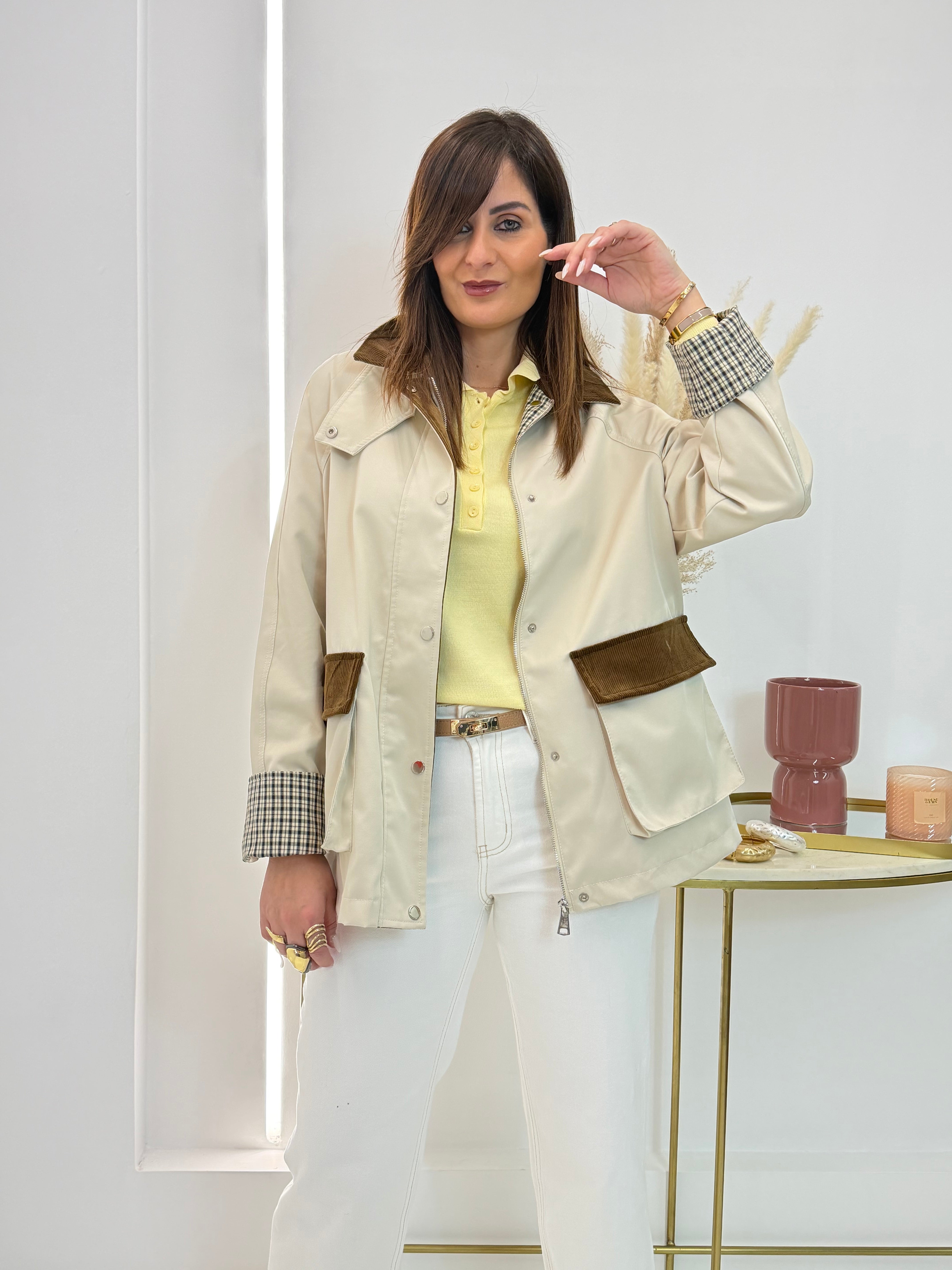 Giacca in stile British, in misto cotone con colletto in velluto a costine, chiusura con zip e bottoni, tasche davanti con patta in velluto a costine, fodera interna. Vestibilità a taglie.