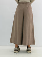 Pantalone, modello a gamba larga, elastico in vita dietro, tasche laterali a scomparsa, chiusura con zip e bottone, pinces davanti.