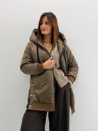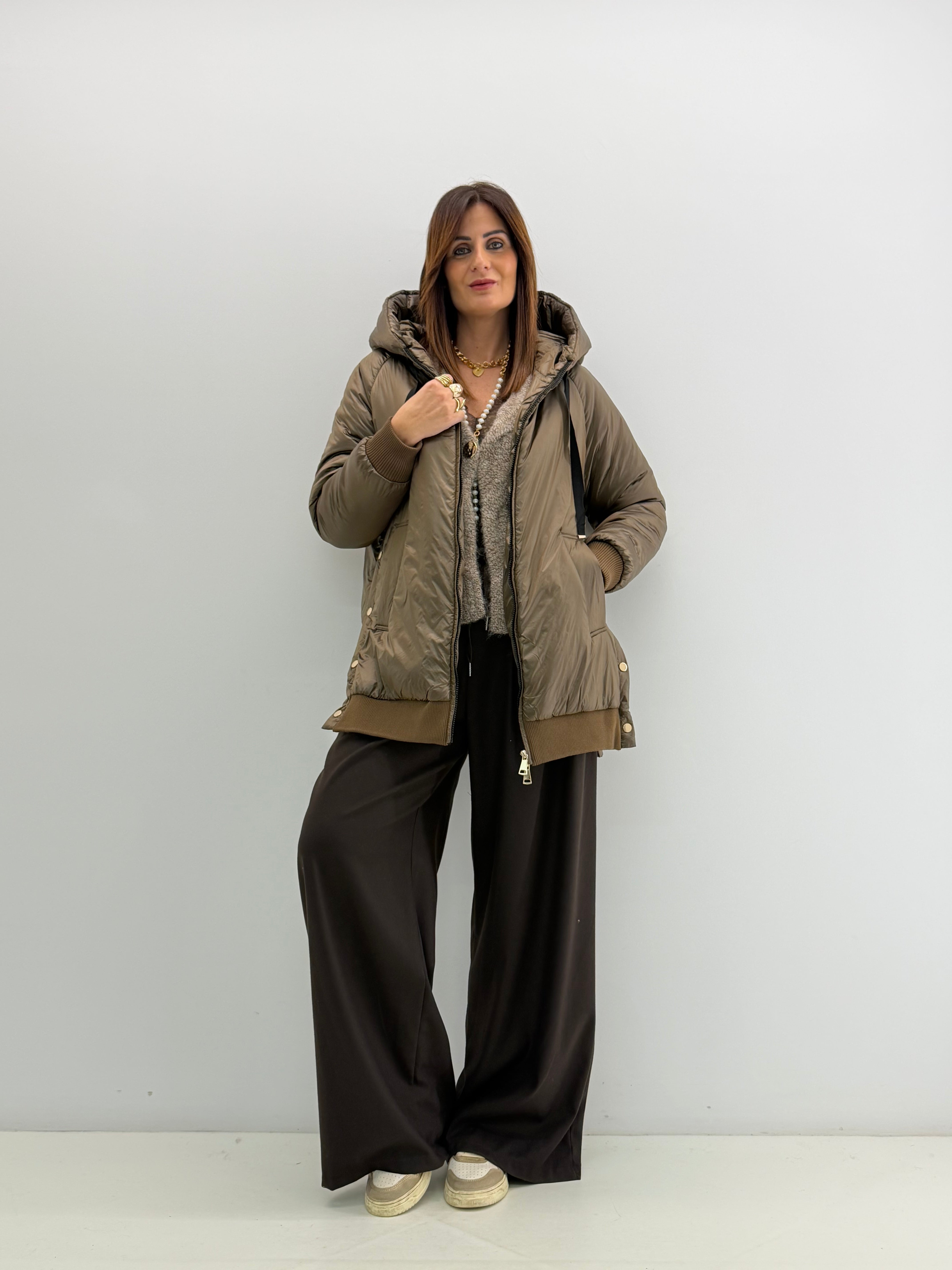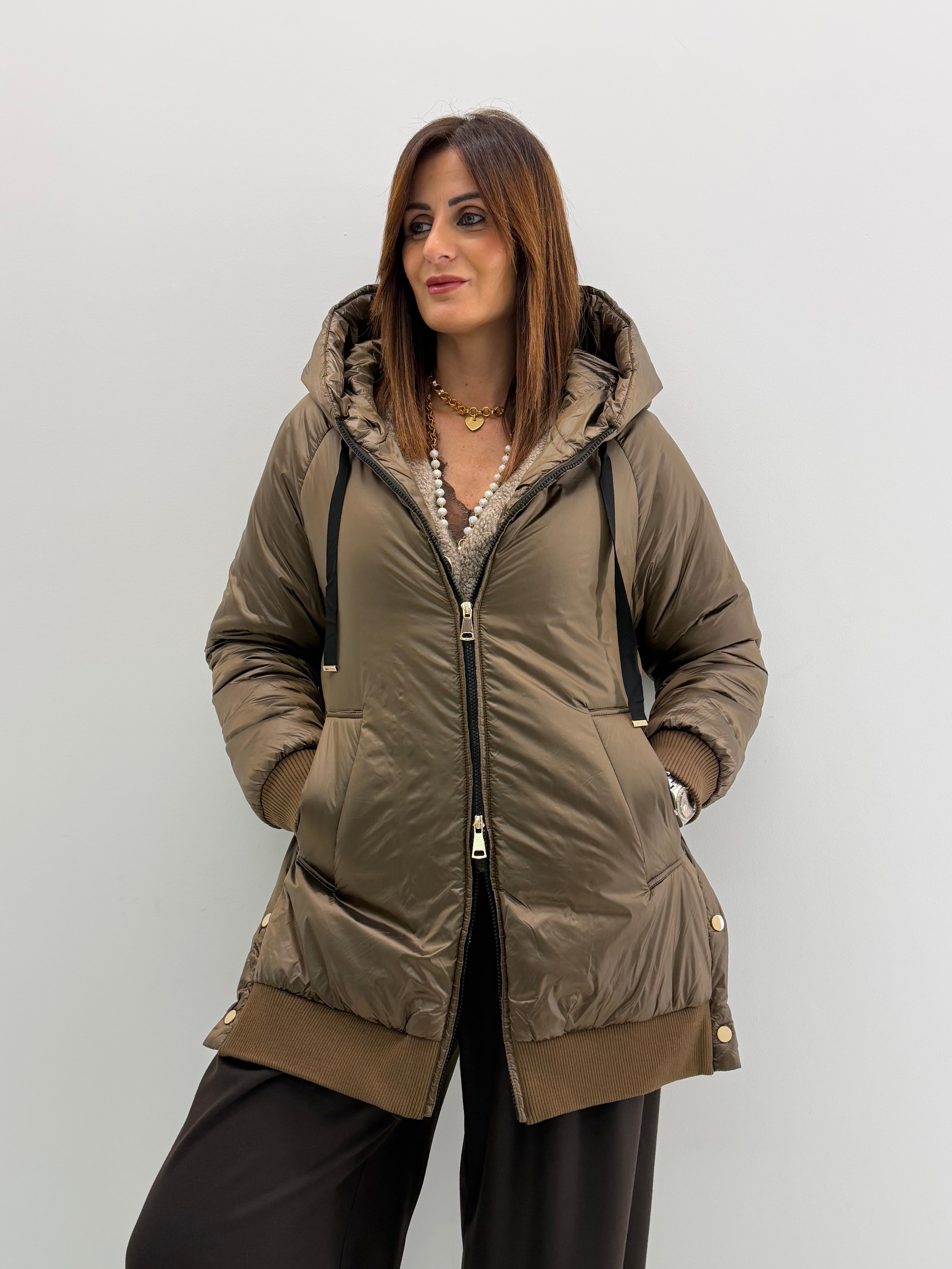 Piumino morbido, tasche laterali, elastico nella parte finale, dettaglio di bottoncini laterali. Chiusura con zip a doppio cursore.