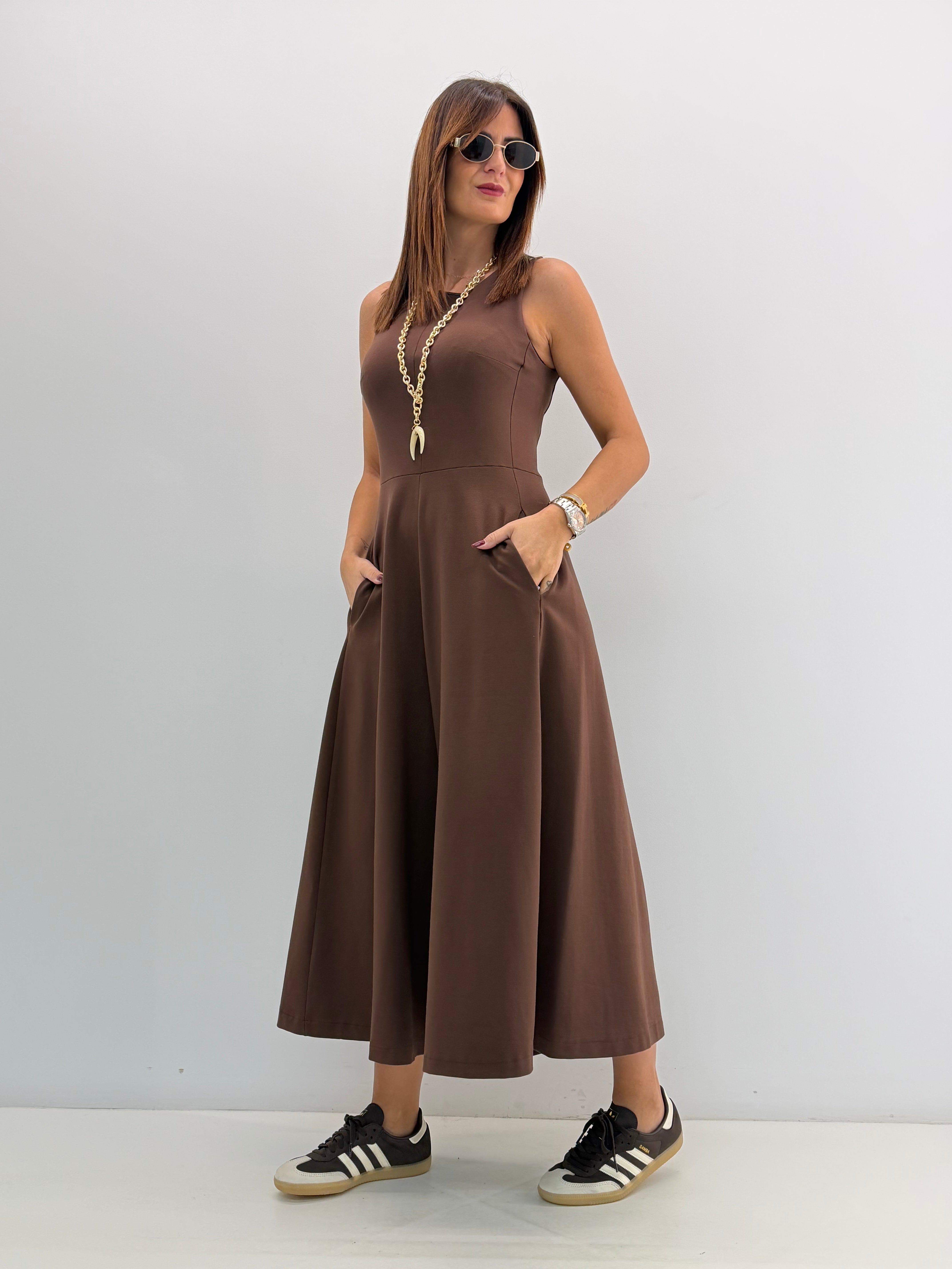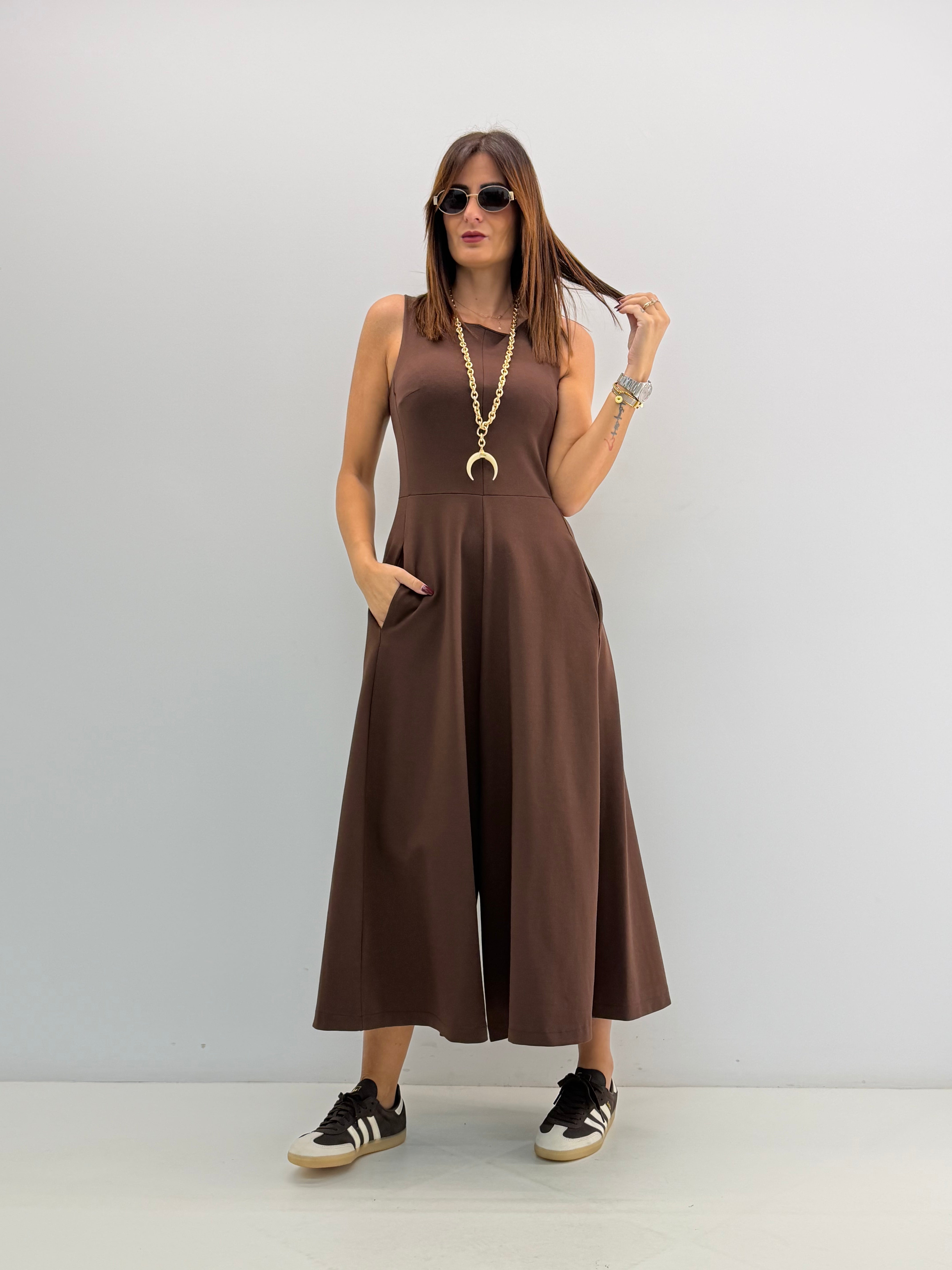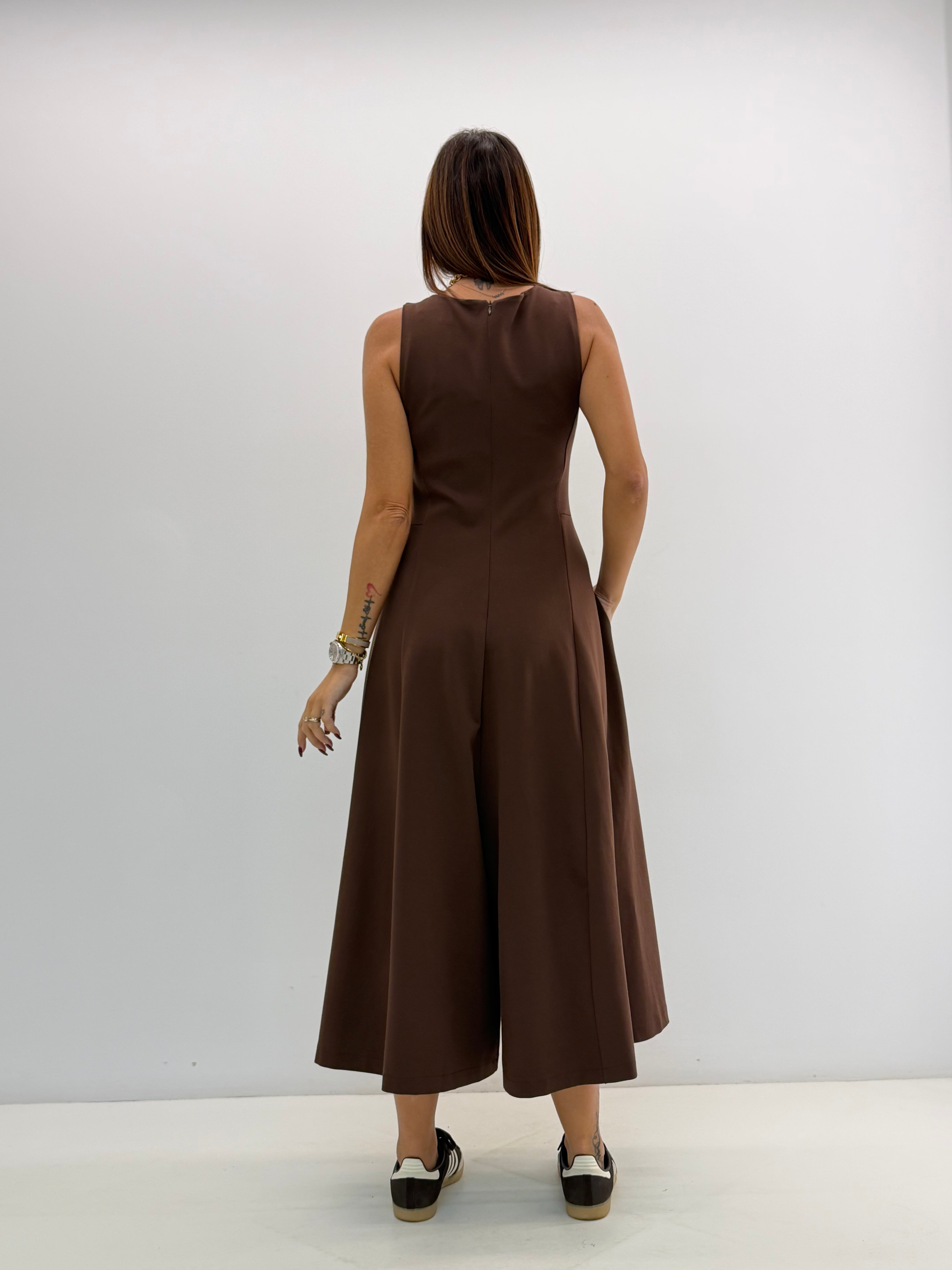 Tuta in punto Milano, asciutta nella parte superiore, gamba ampia a palazzo, cavallo morbido, senza maniche, scollo rotondo, chiusura con zip invisibile dietro, tasche laterali a scomparsa. Vestibilità a taglie.