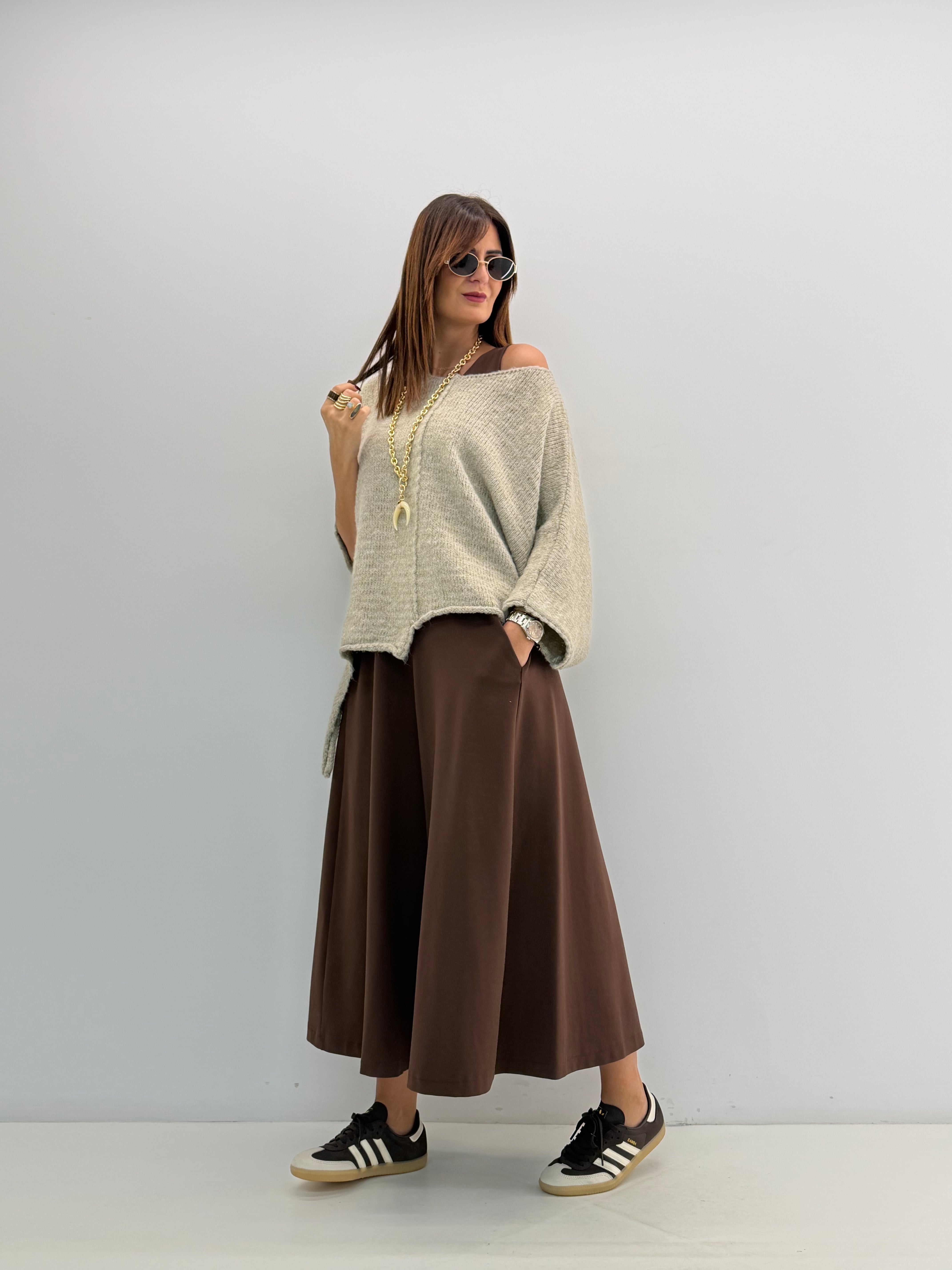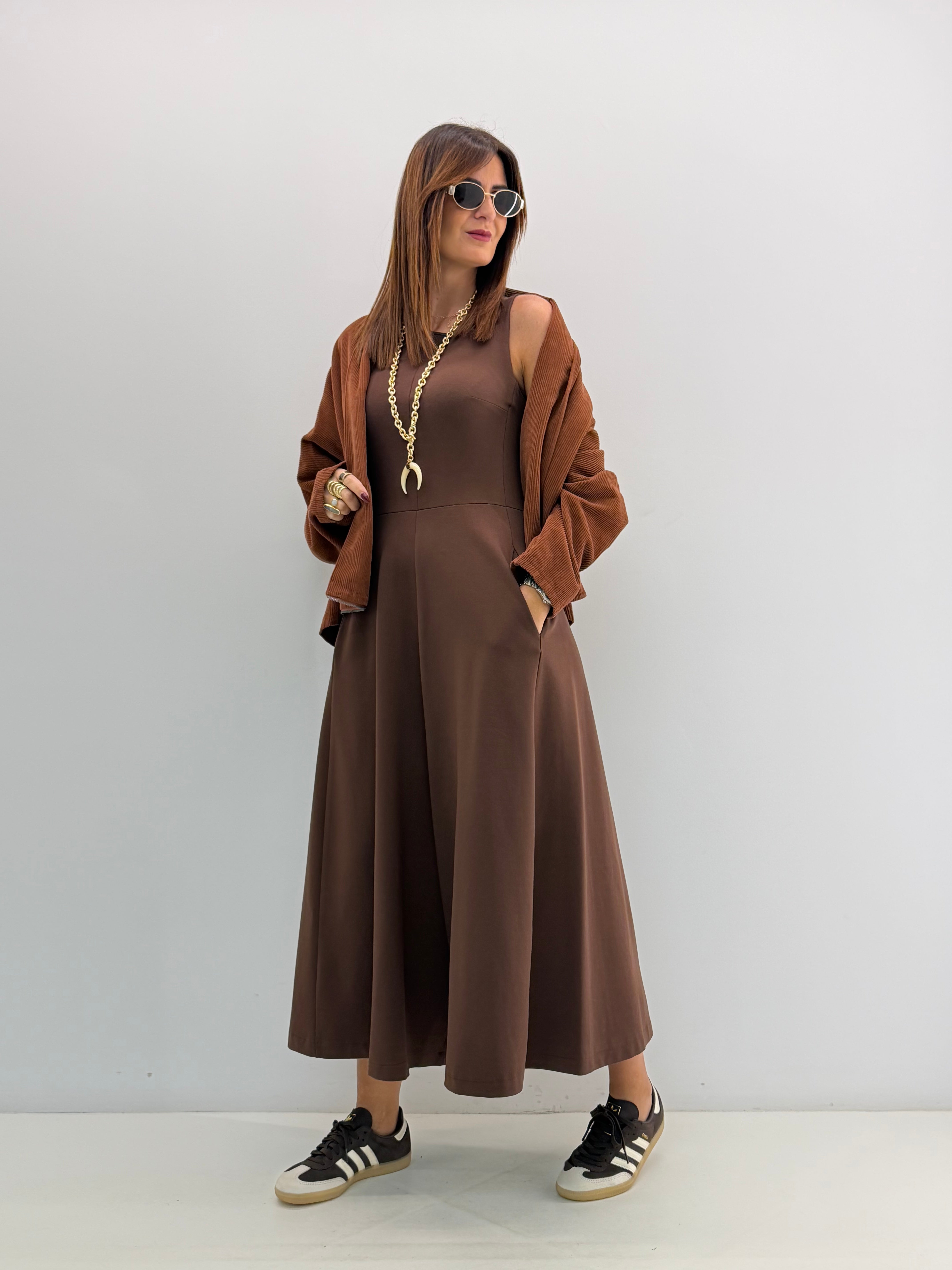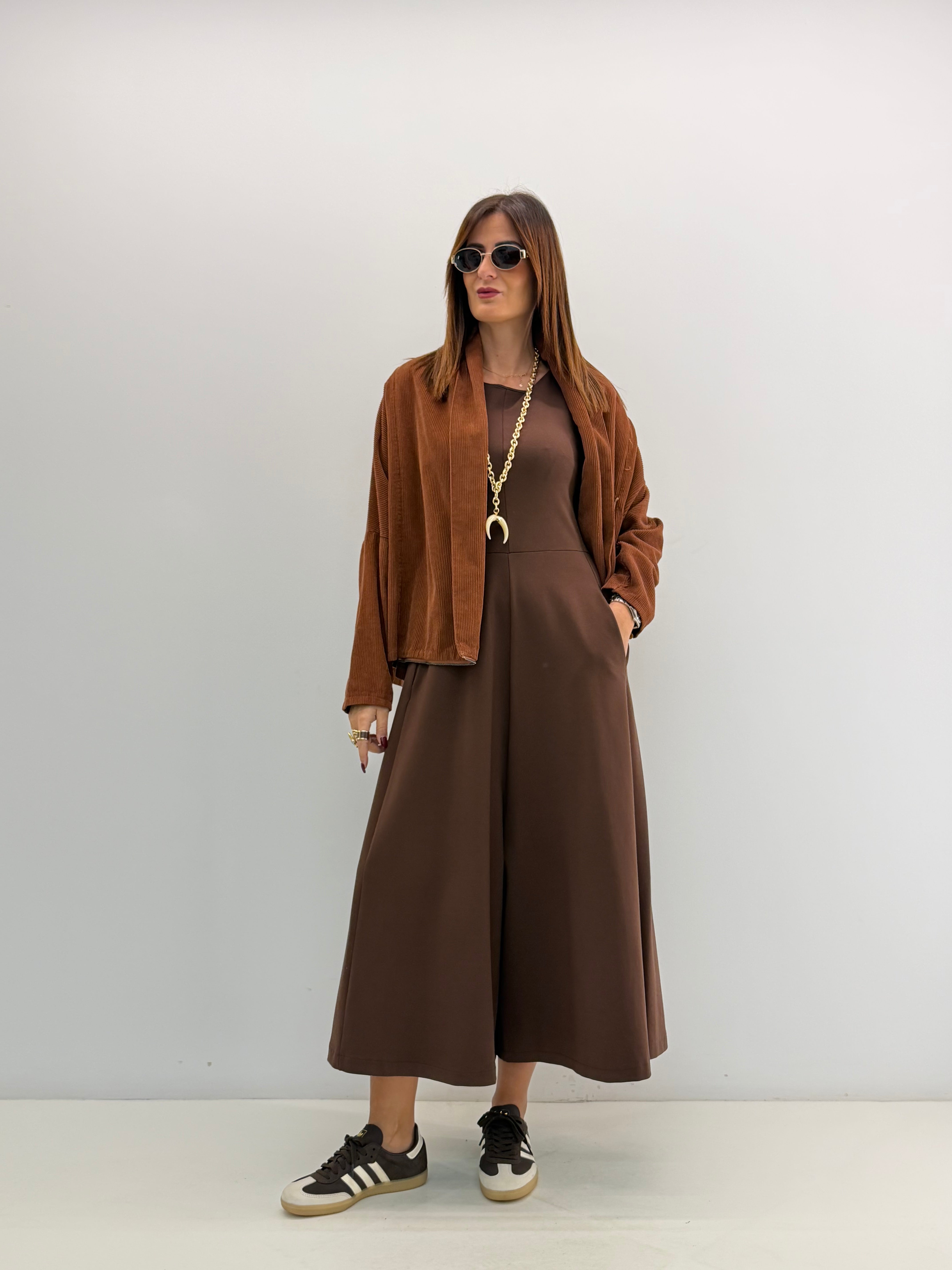 Tuta in punto Milano, asciutta nella parte superiore, gamba ampia a palazzo, cavallo morbido, senza maniche, scollo rotondo, chiusura con zip invisibile dietro, tasche laterali a scomparsa. Vestibilità a taglie.