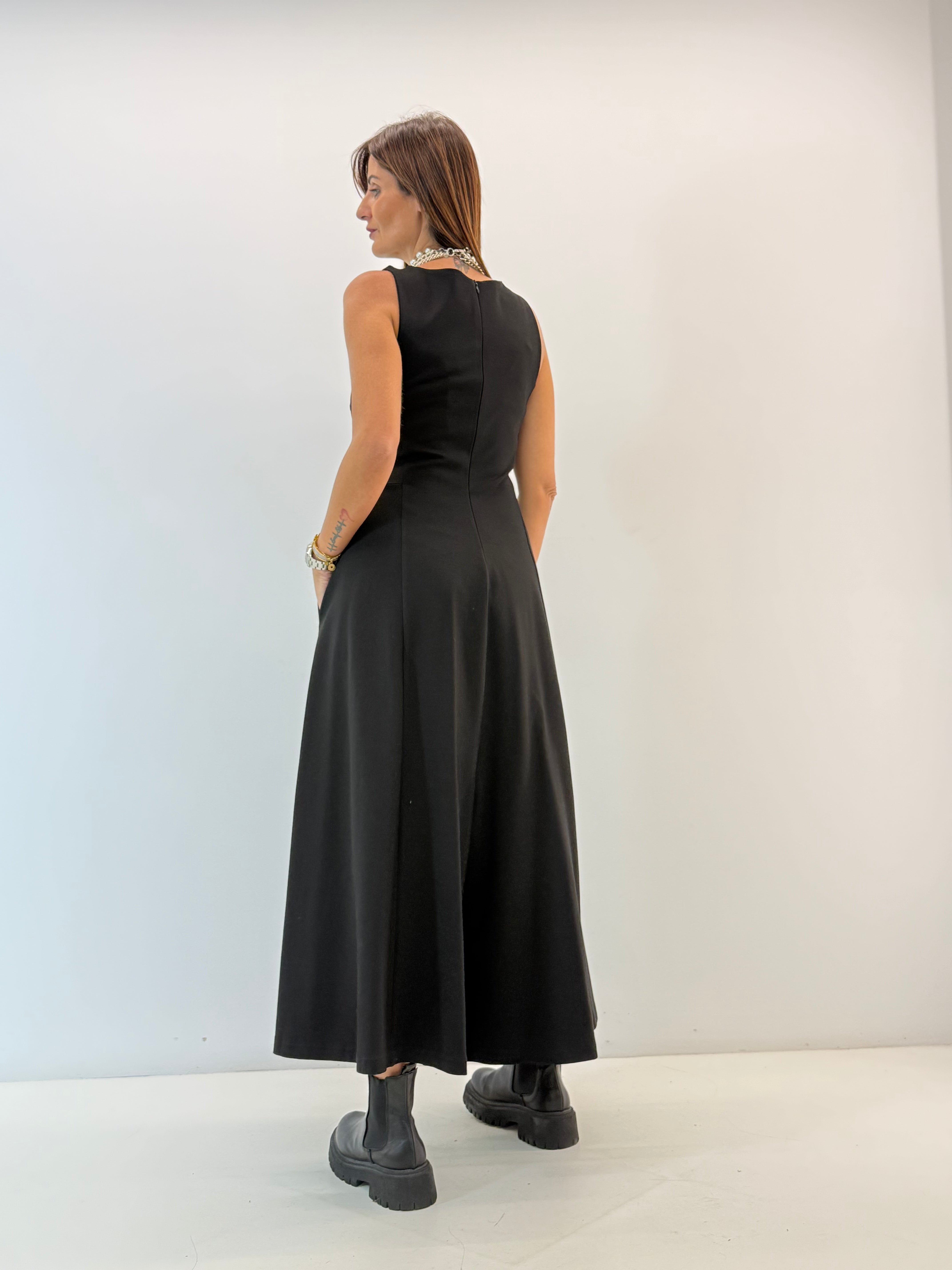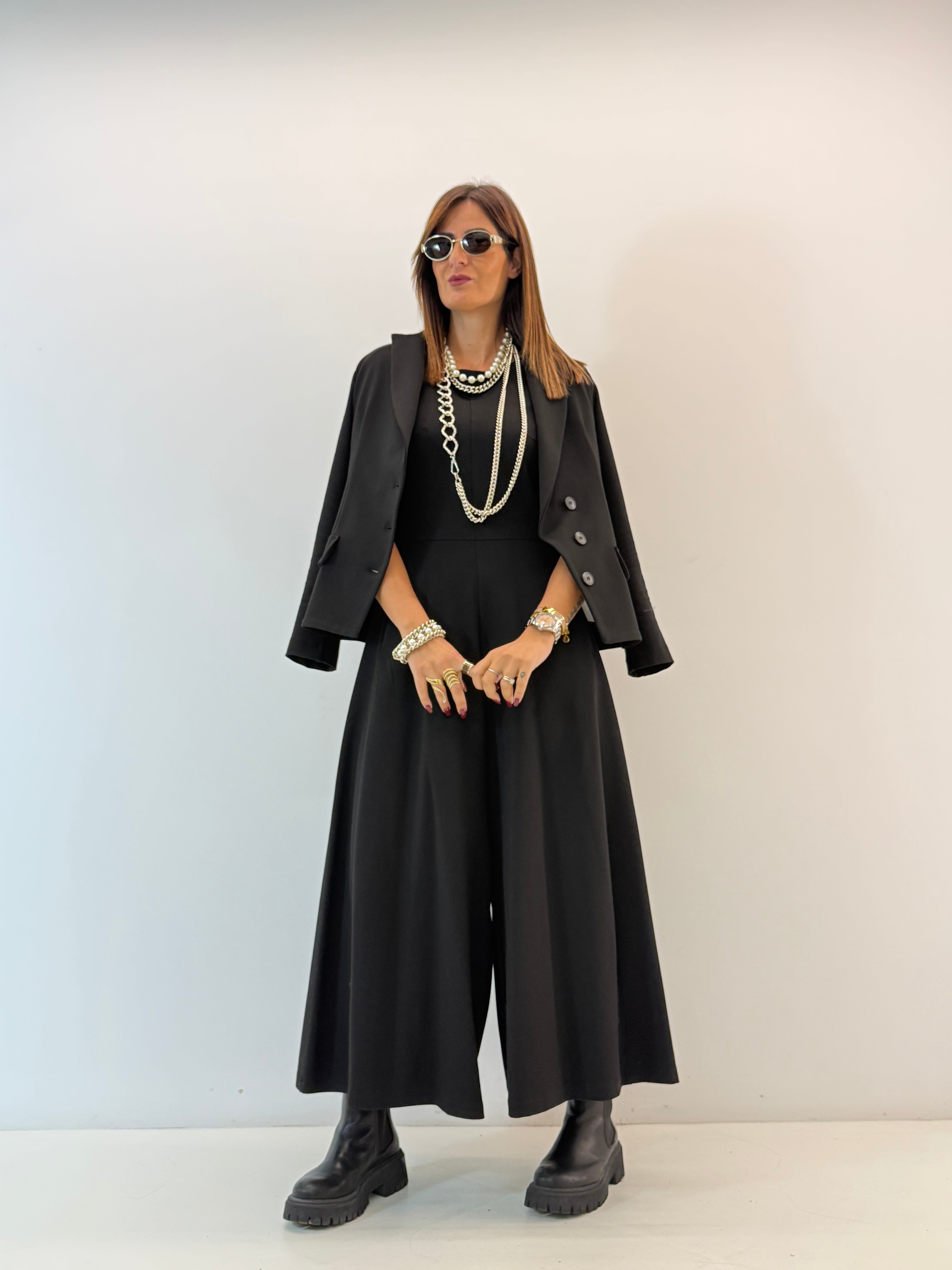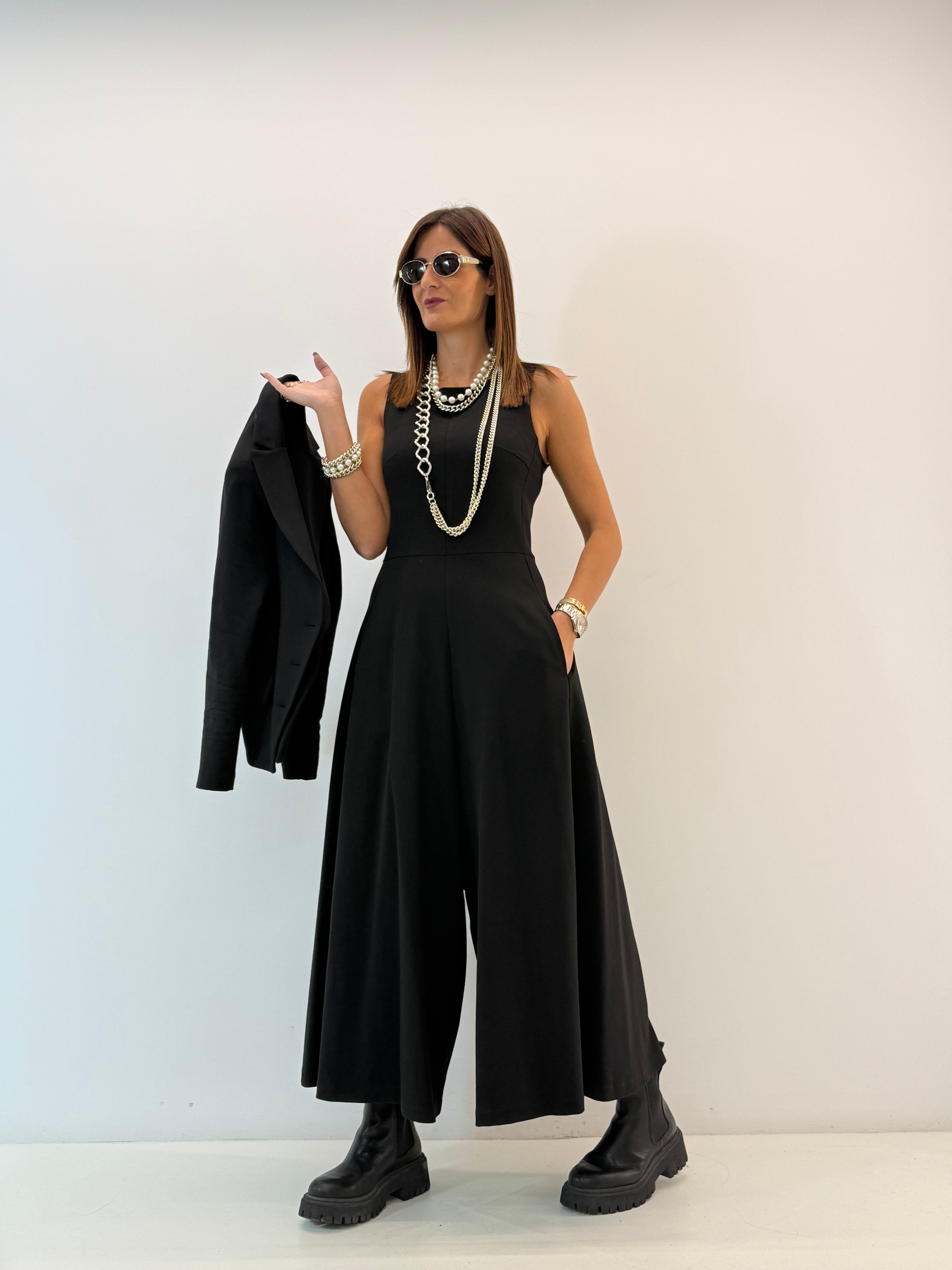 Tuta in punto Milano, asciutta nella parte superiore, gamba ampia a palazzo, cavallo morbido, senza maniche, scollo rotondo, chiusura con zip invisibile dietro, tasche laterali a scomparsa. Vestibilità a taglie.