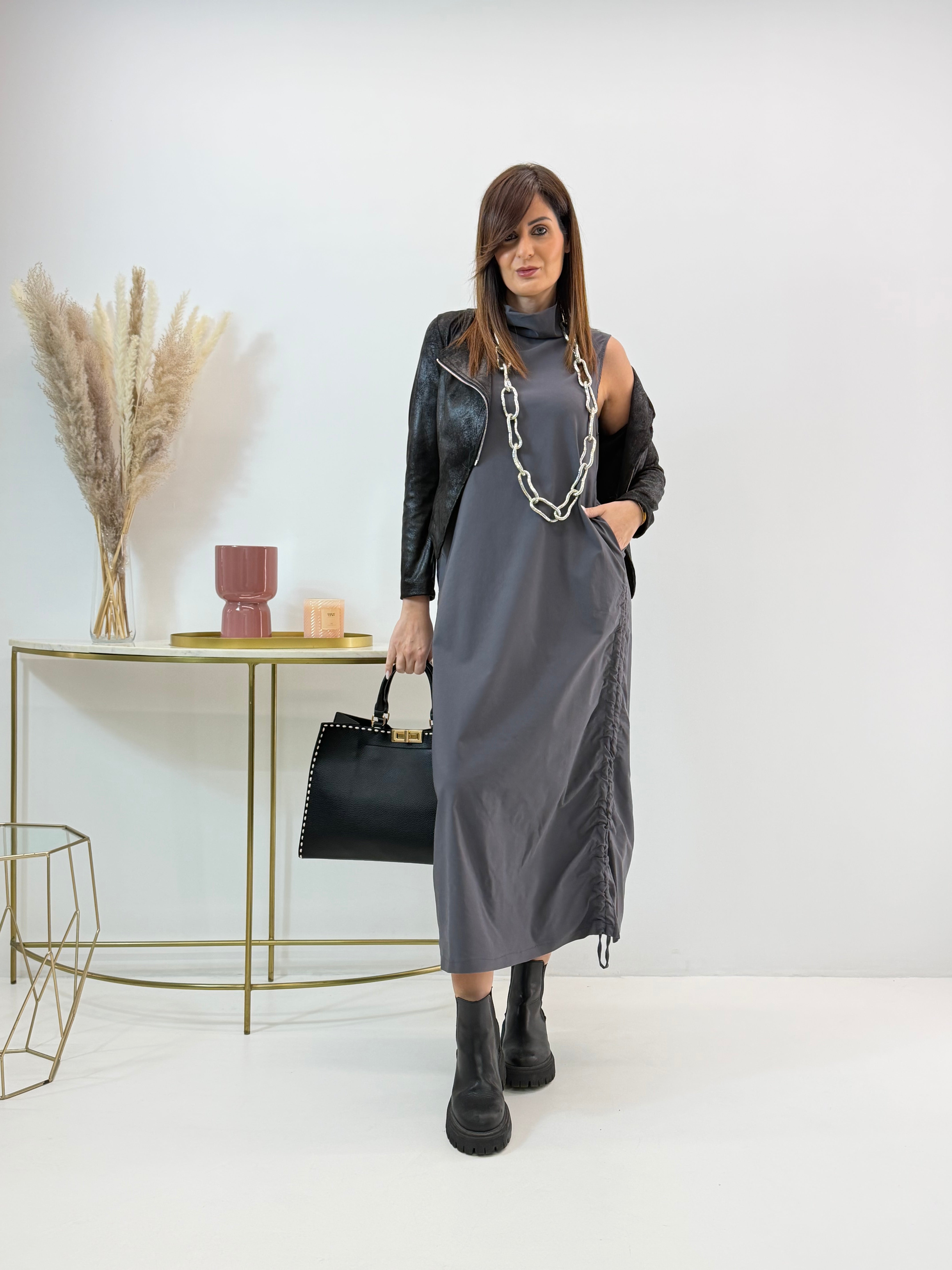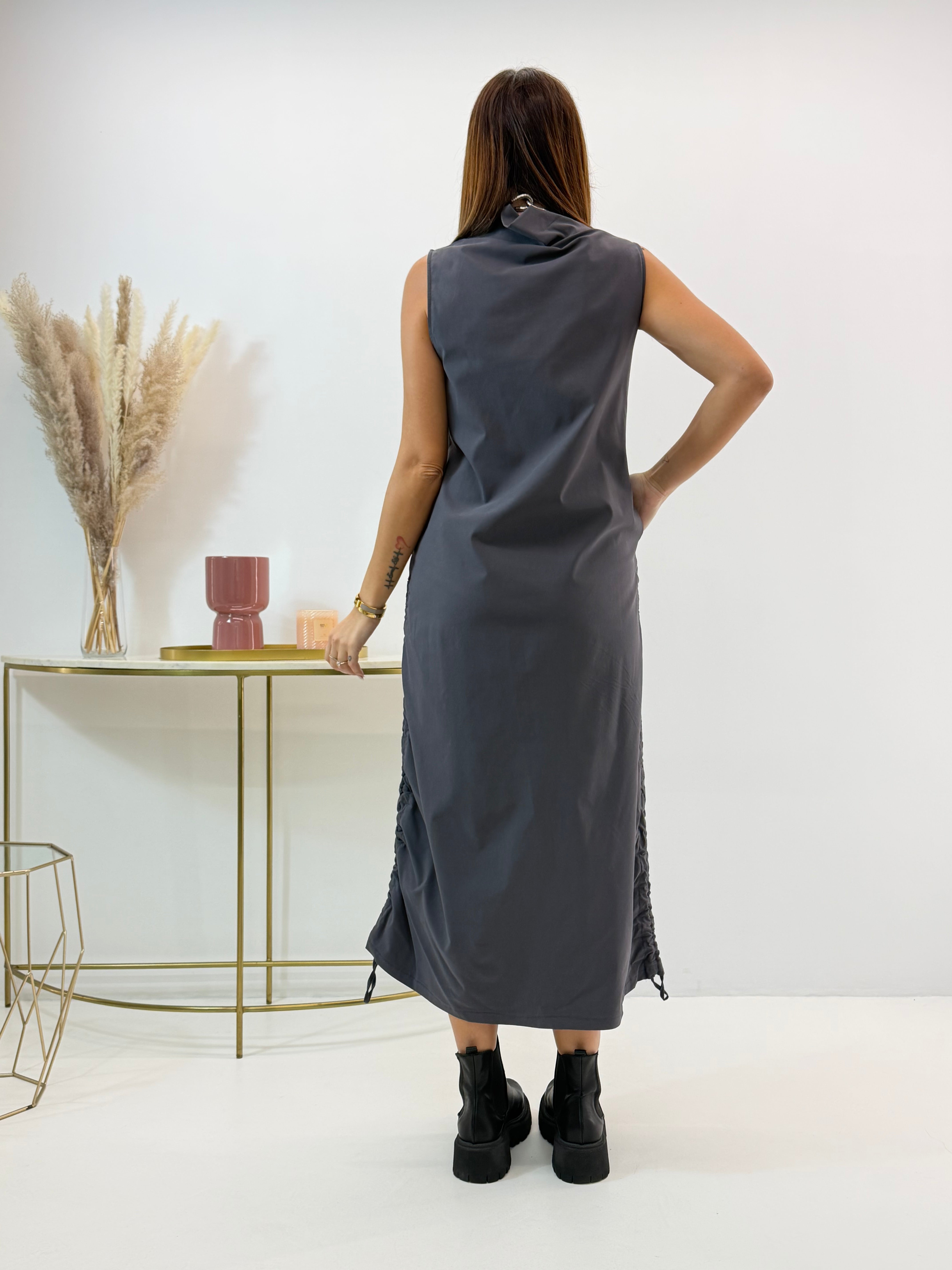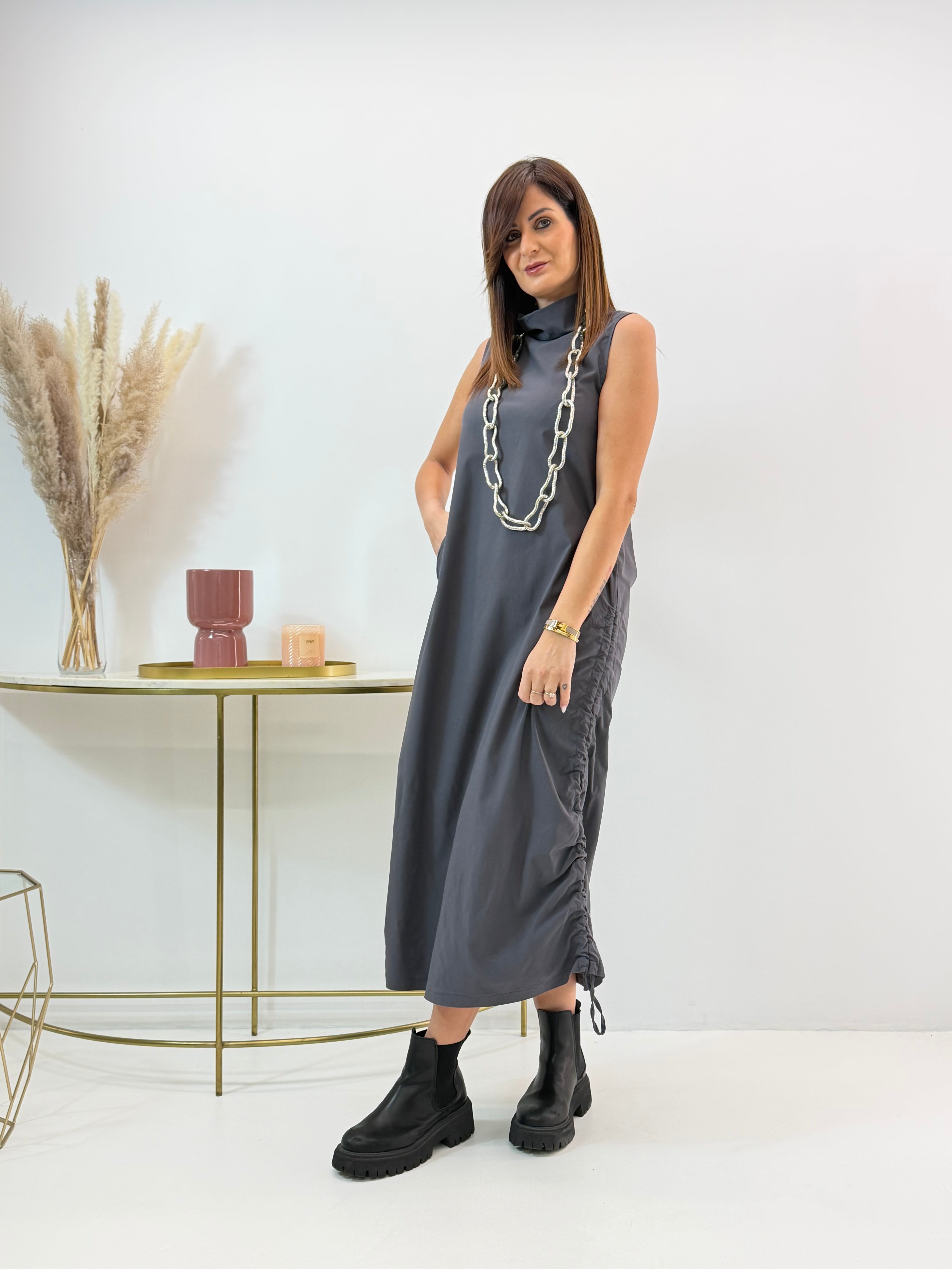 Abito in misto viscosa, elasticizzato, arricciatura regolabile sui lati, tasche laterali a scomparsa.