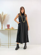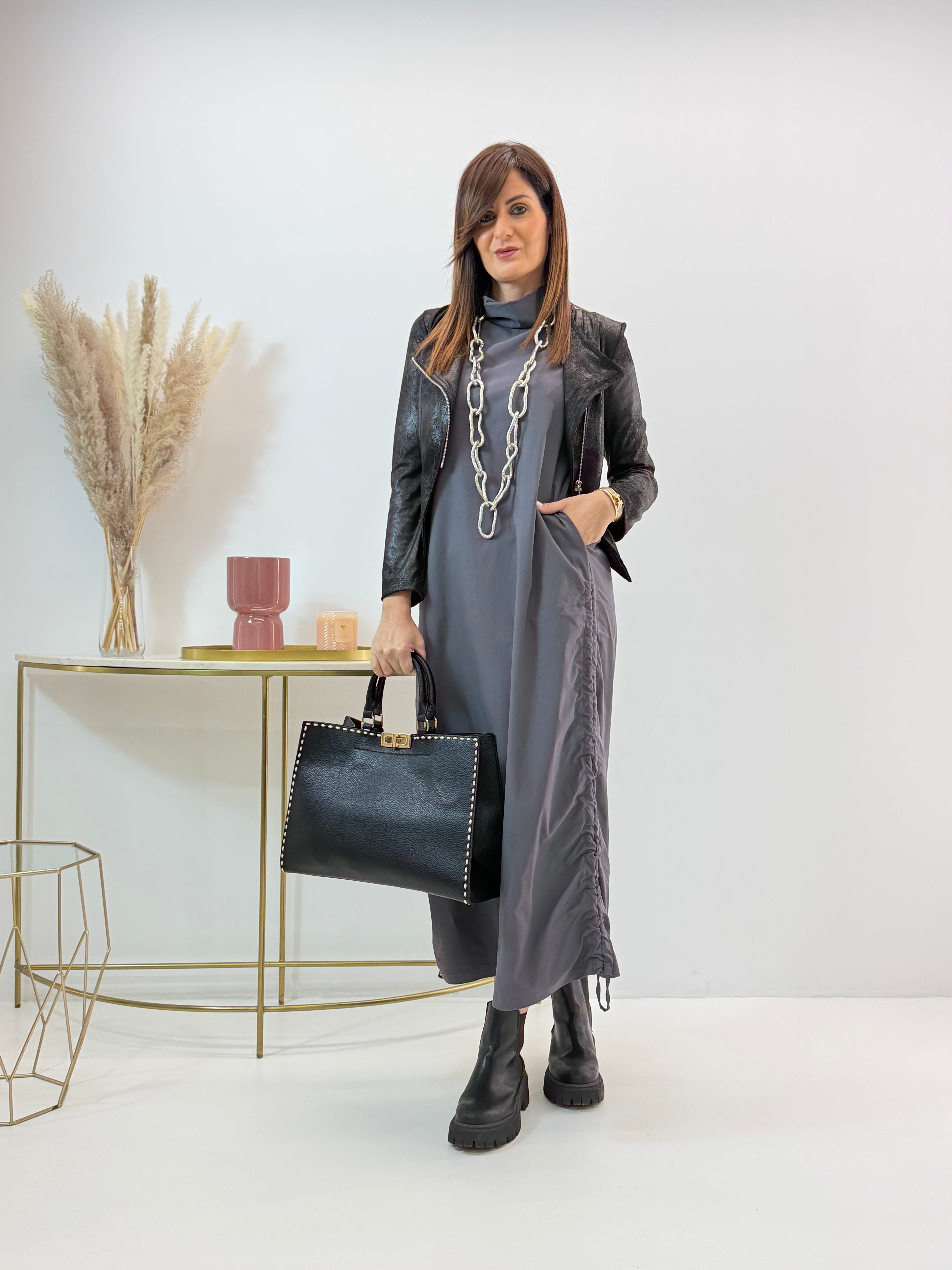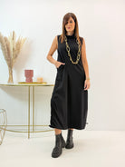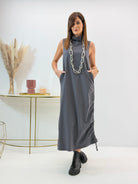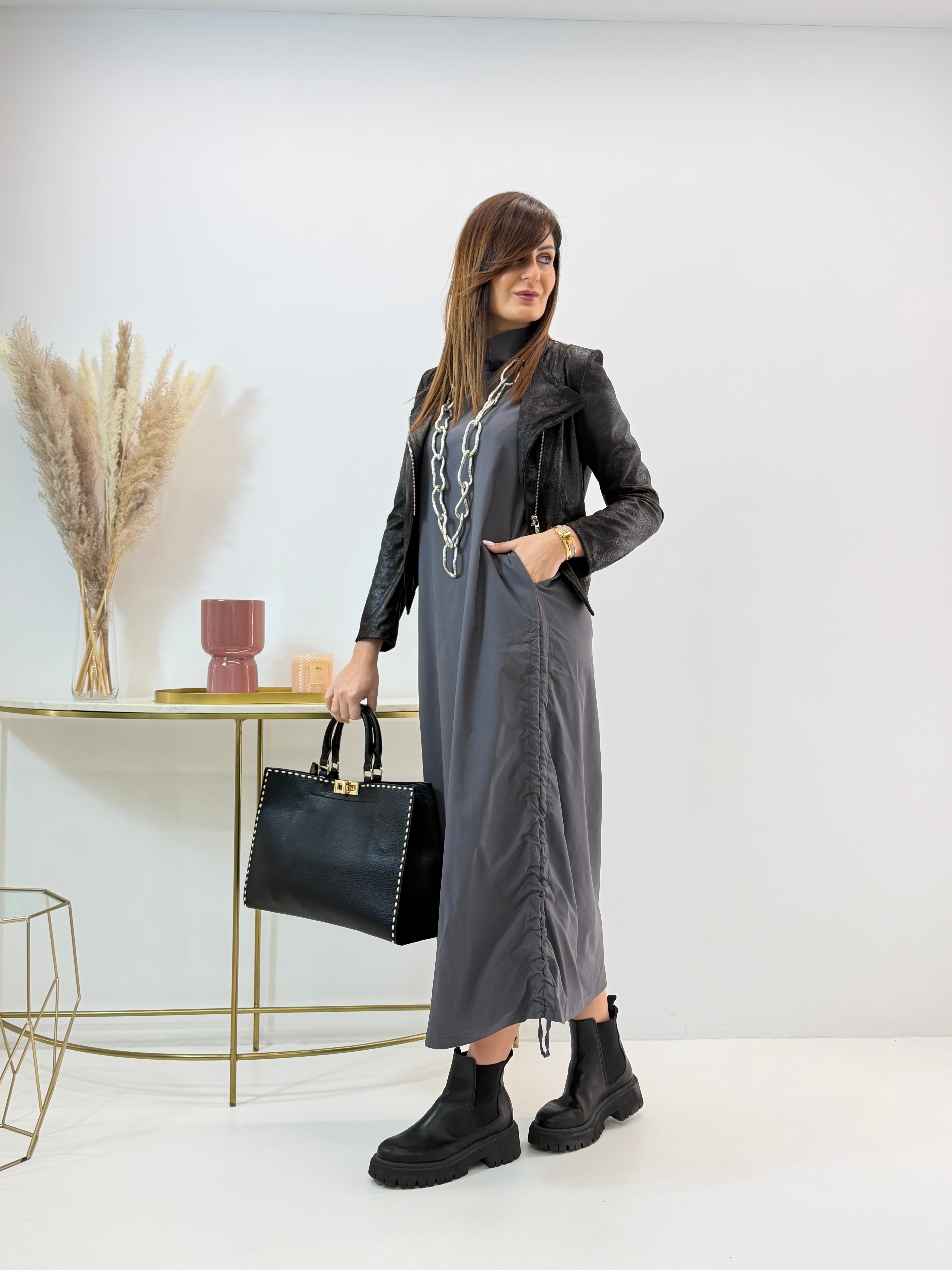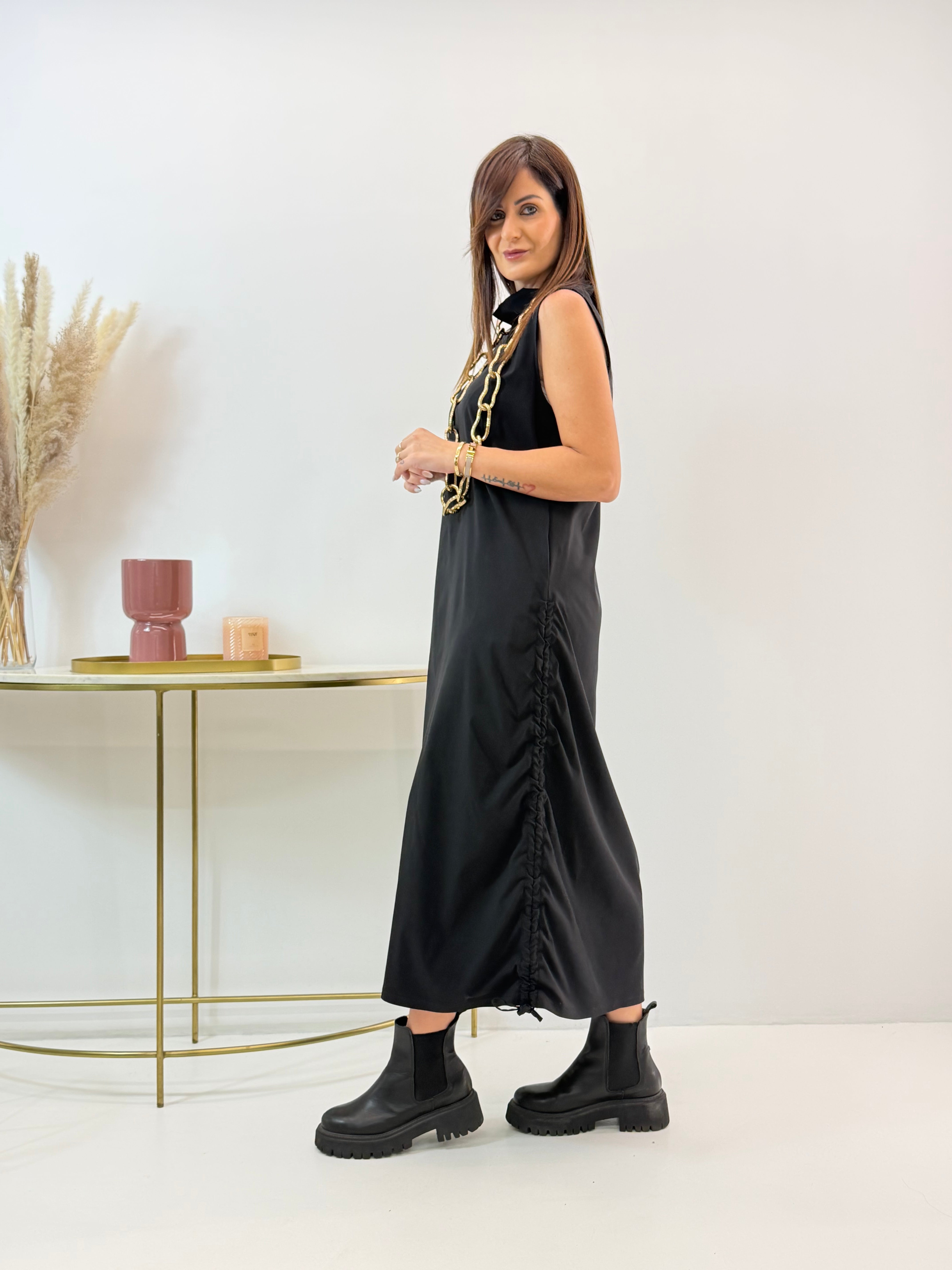 Abito in misto viscosa, elasticizzato, arricciatura regolabile sui lati, tasche laterali a scomparsa.