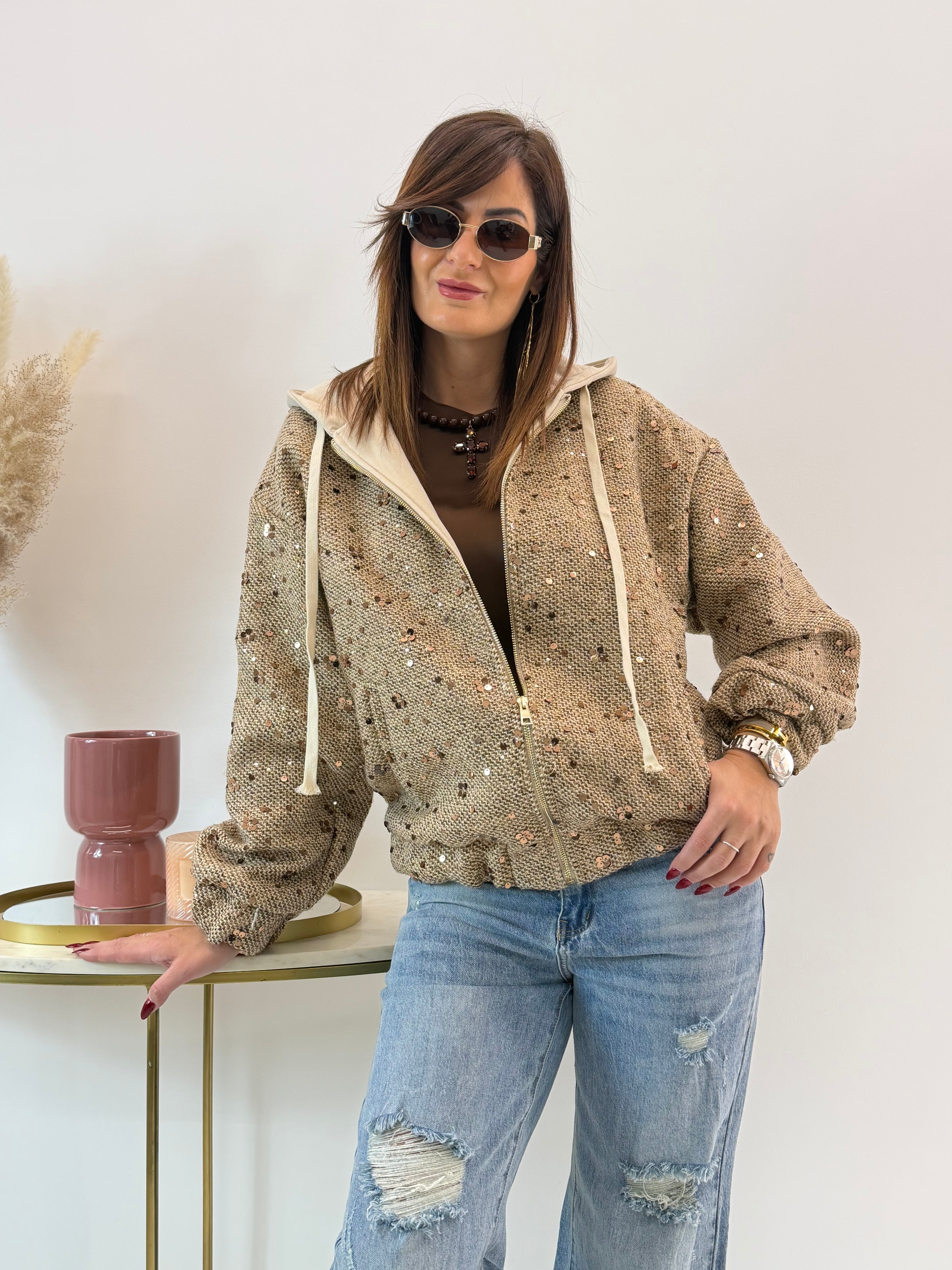 Bomber con cappuccio in felpa, in tweed leggero con base intrecciata. Applicazione di paillettes, chiusura con zip. Foderato all'interno ed elastico sull'orlo