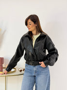 Bomber in ecopelle, foderato all'interno, tasche laterali, chiusura con zip ed elastico sull'orlo.