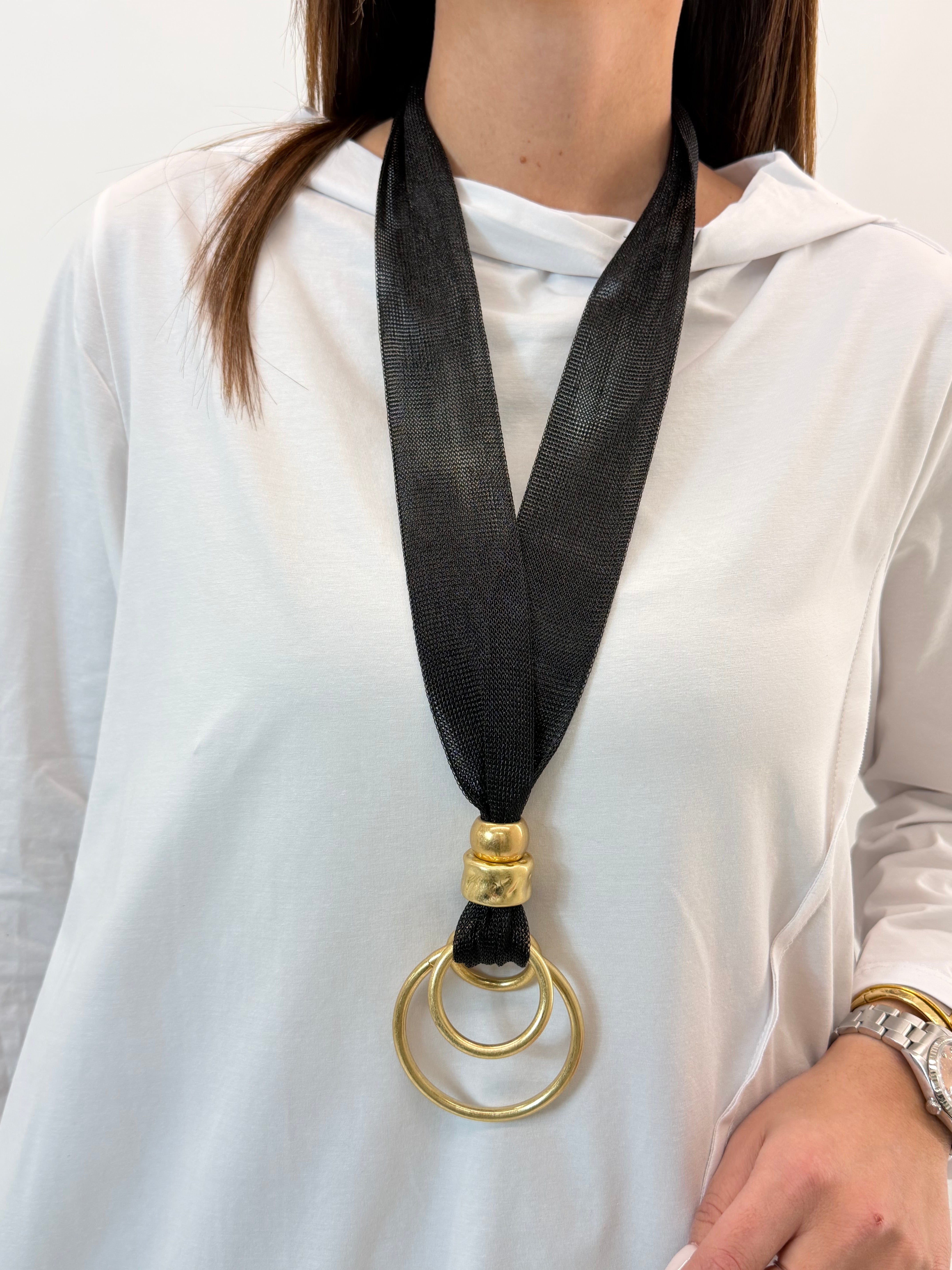 Collana nera con ciondolo gold. Elementi geometrici caratterizzano questa collana dal design fresco e divertente, renderà il tuo outfit ancora più raffinato. Chiusura con gancetto.