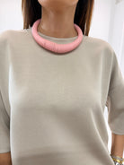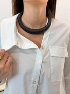 Collana nera in gomma. Questa collana dal design fresco e divertente, renderà il tuo outfit ancora più raffinato. Chiusura con gancetto.