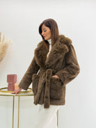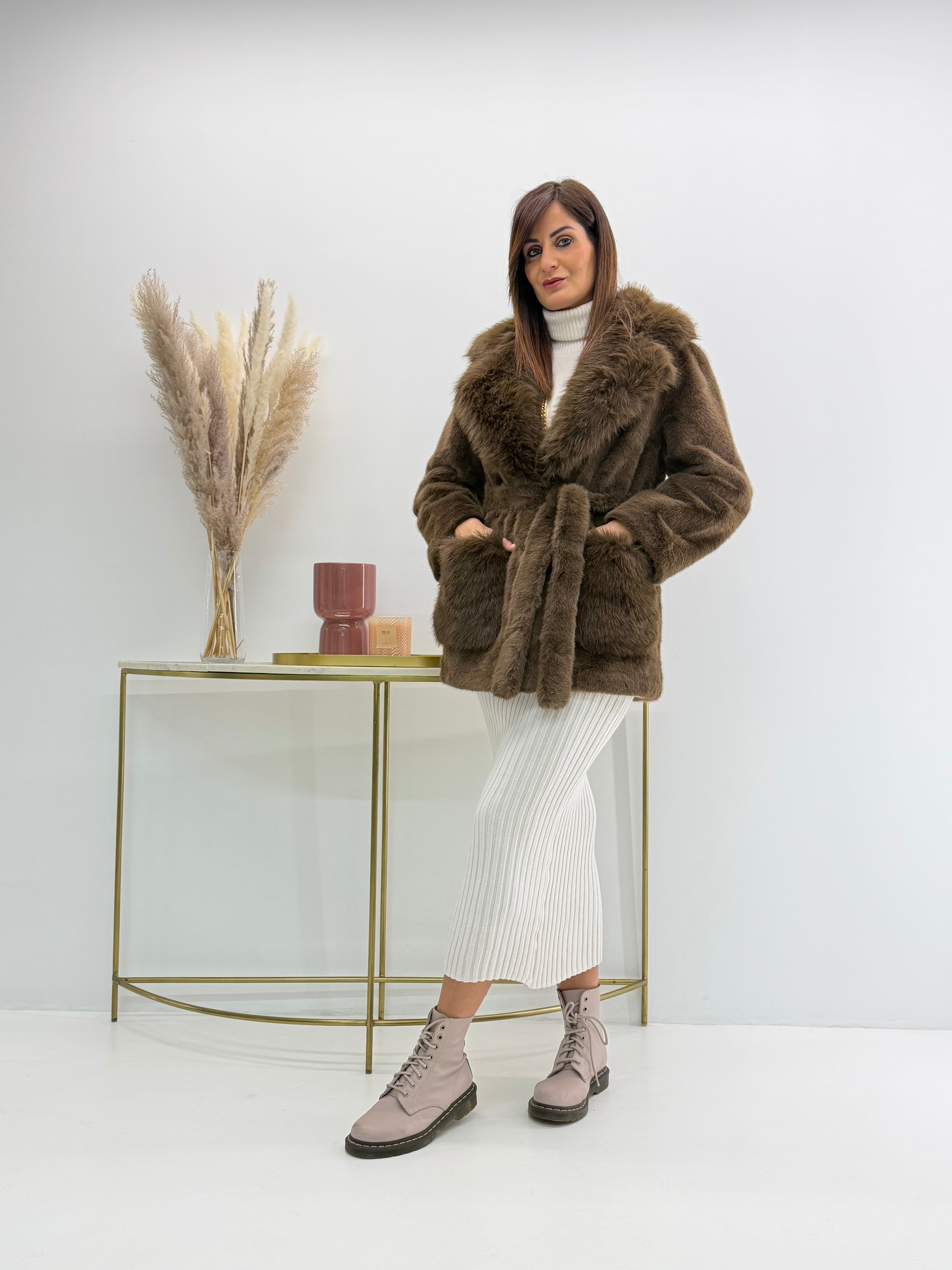 Cappotto con cinturino in pelliccia sintetica. Stile glamour urbano con un equilibrio tra eleganza e modernità.