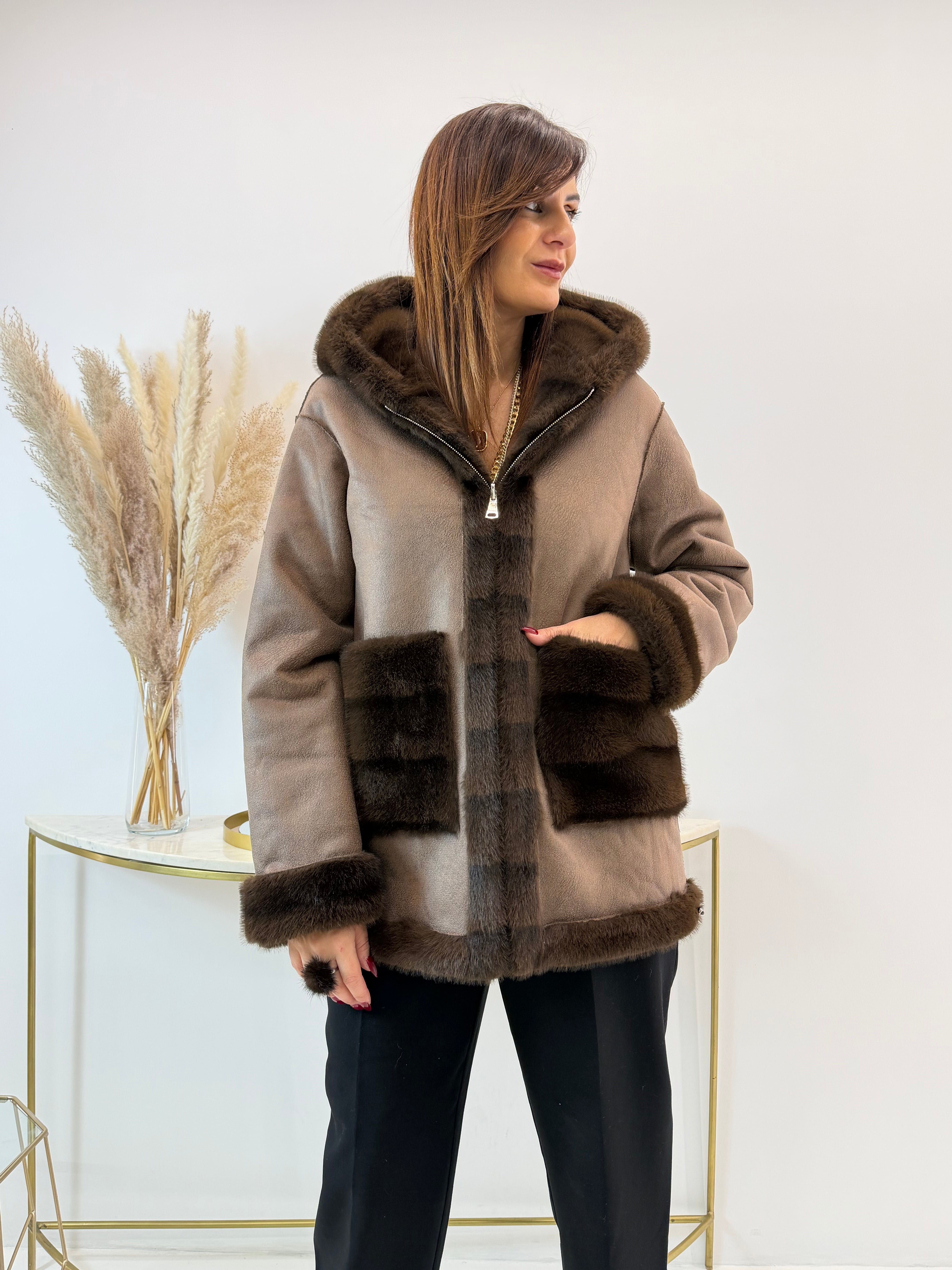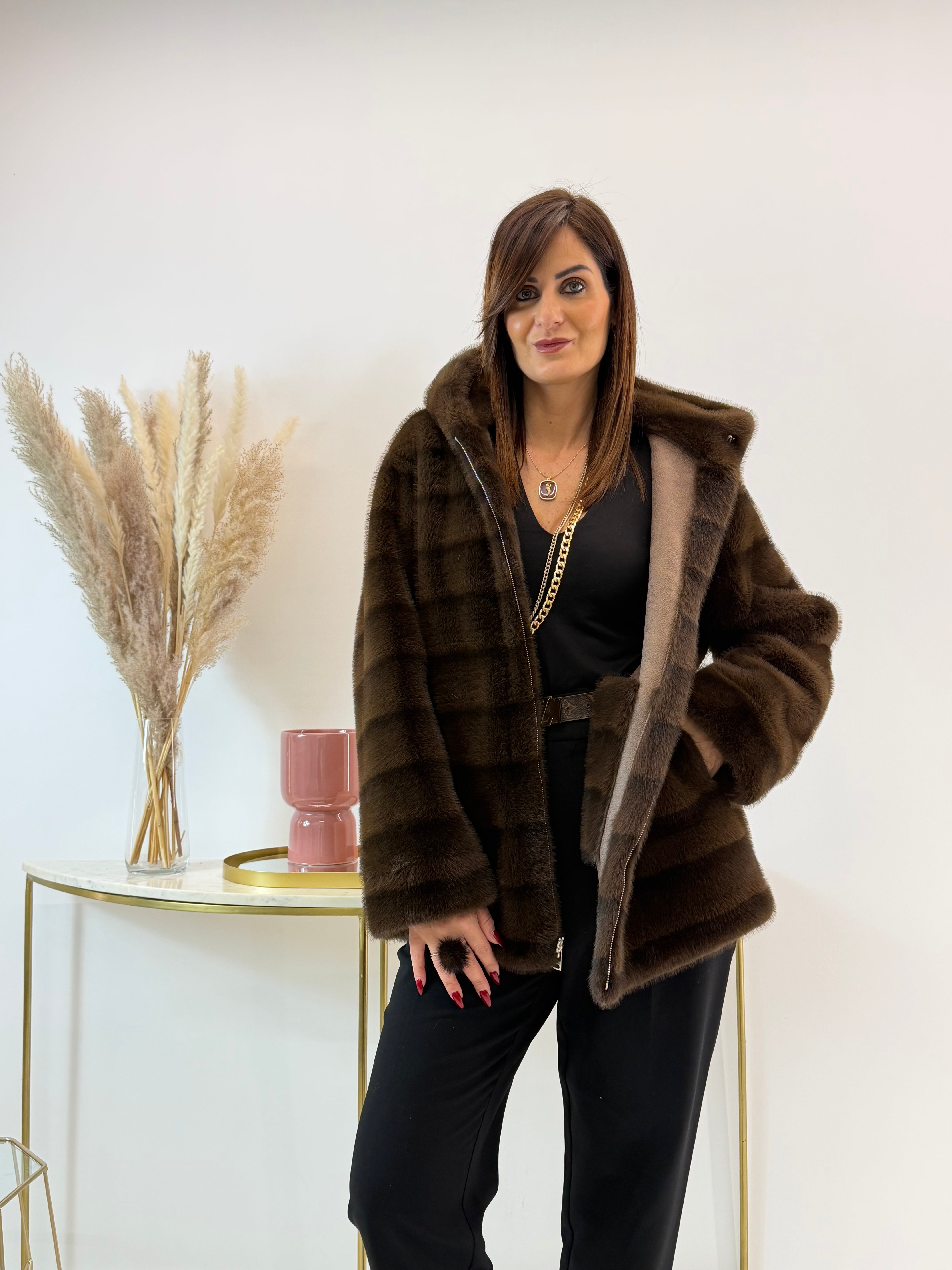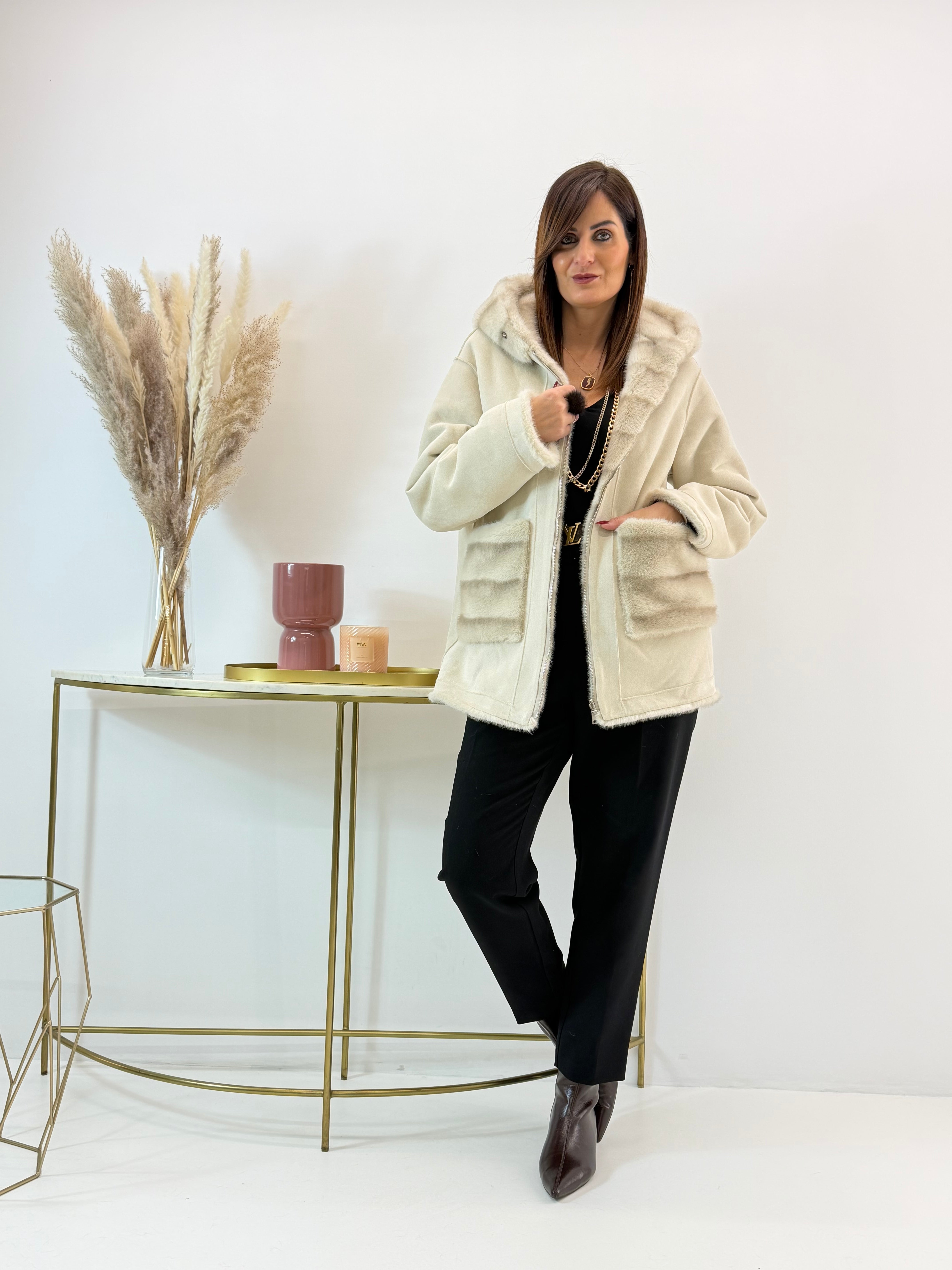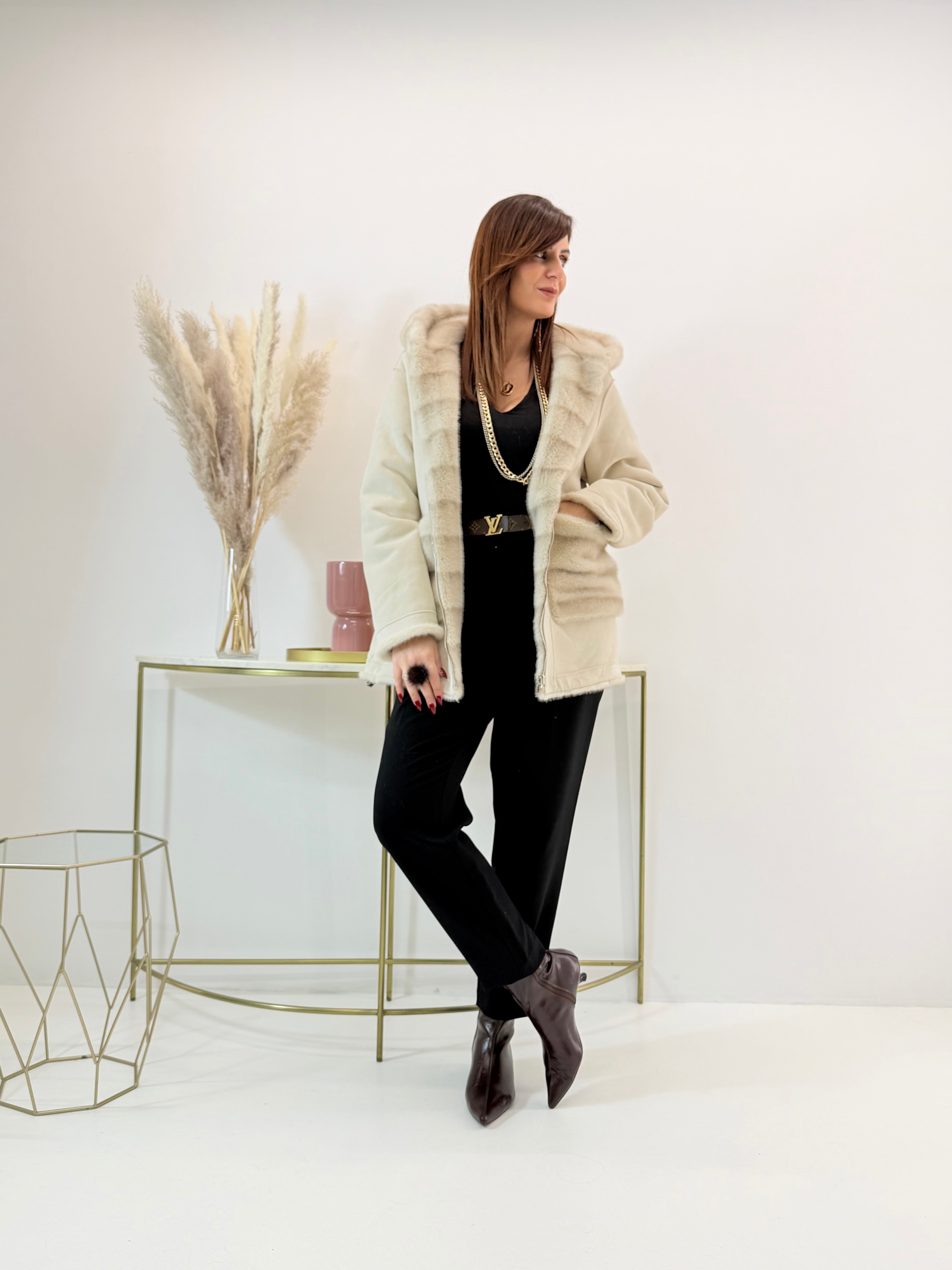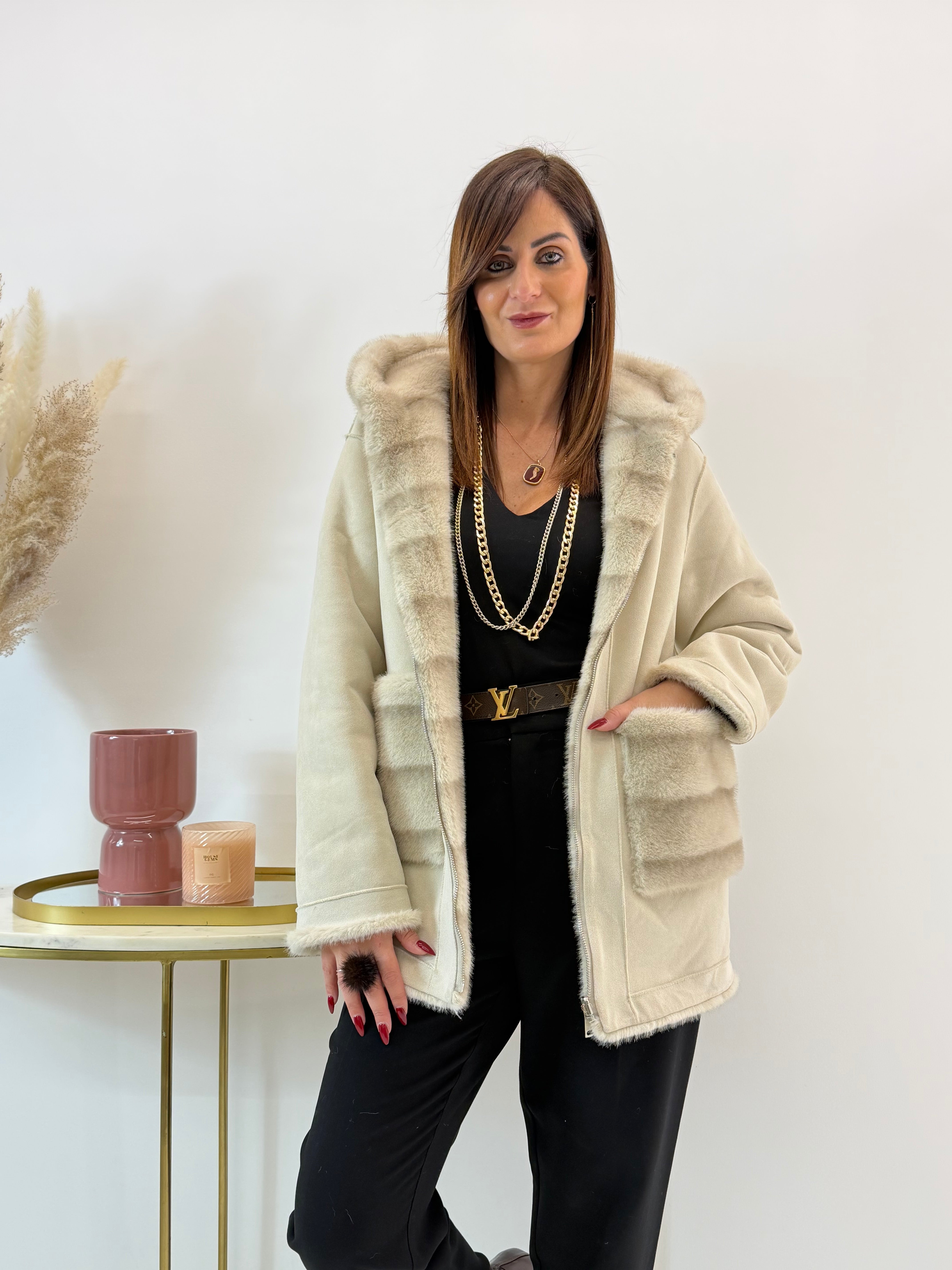 Cappotto corto double-face in pelliccia sintetica con cappuccio voluminoso, che aggiunge un tocco di lusso e calore, due modi per indossarla, uno in morbidissima pelliccetta con tasche a scomparsa, e seconda opzione in eco-montone tono su tono con cappuccio bordi polsini e tasche rifiniti in pelliccia ,stile glamour urbano con un equilibrio tra eleganza e modernità.