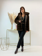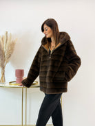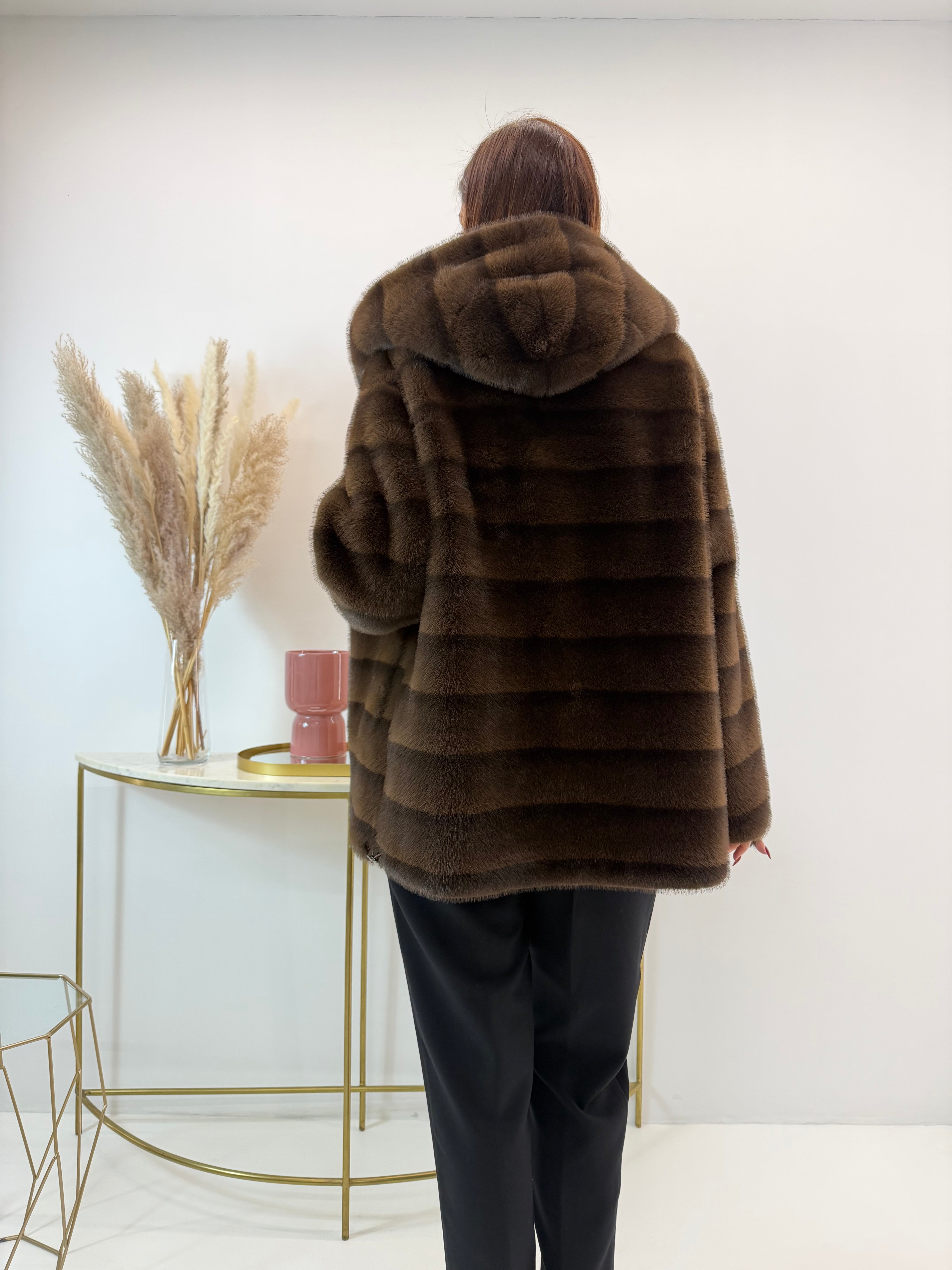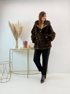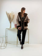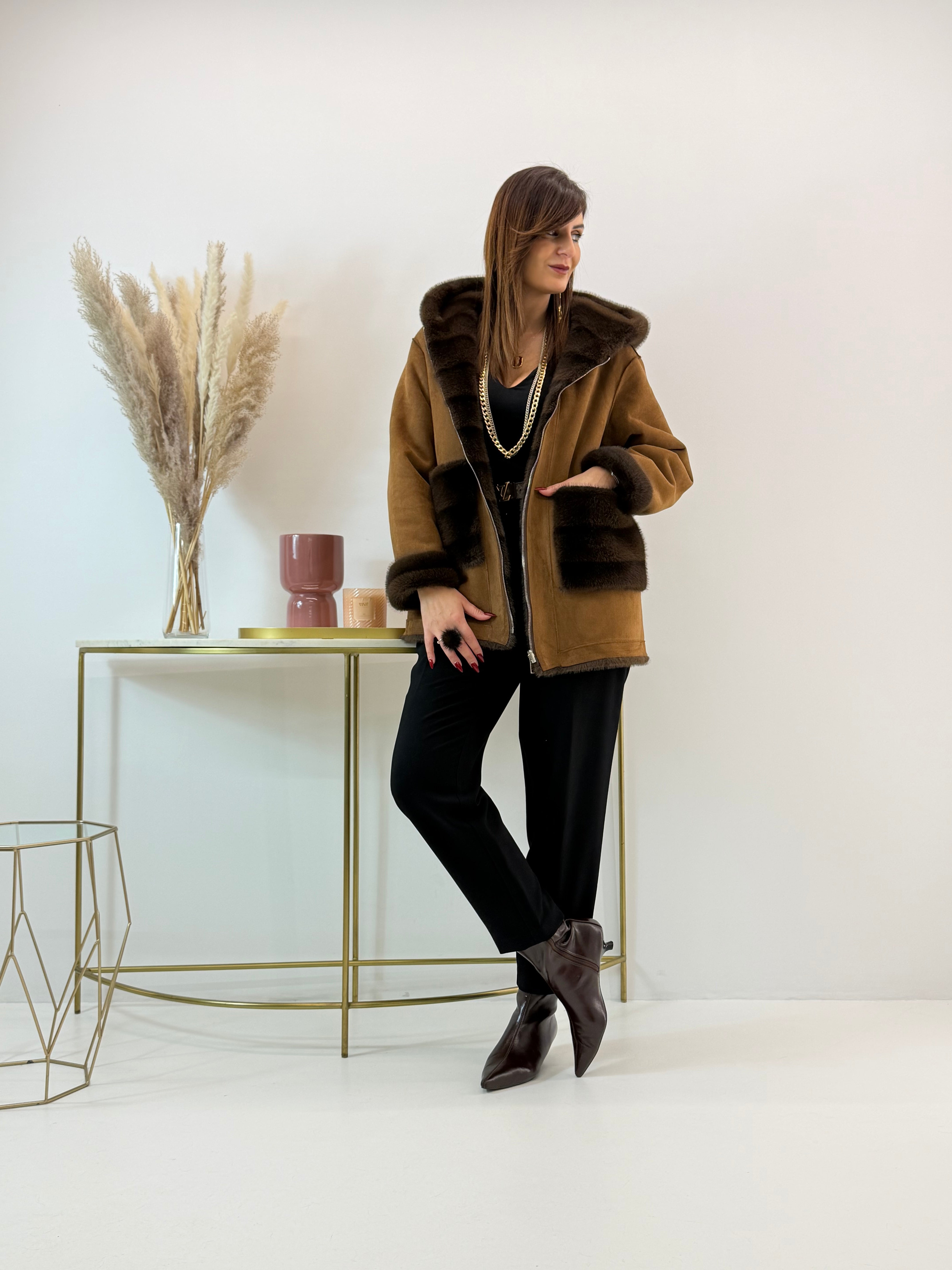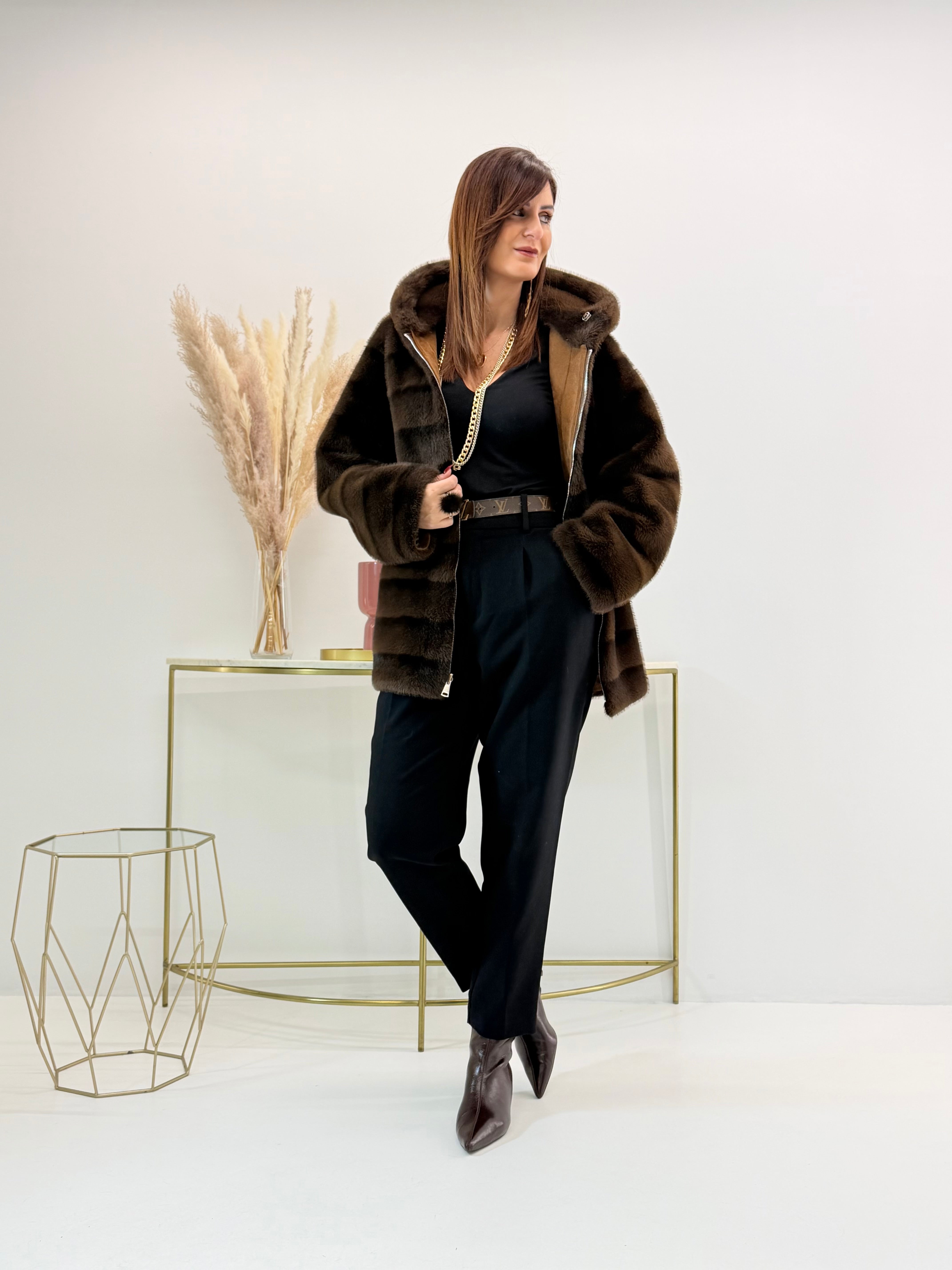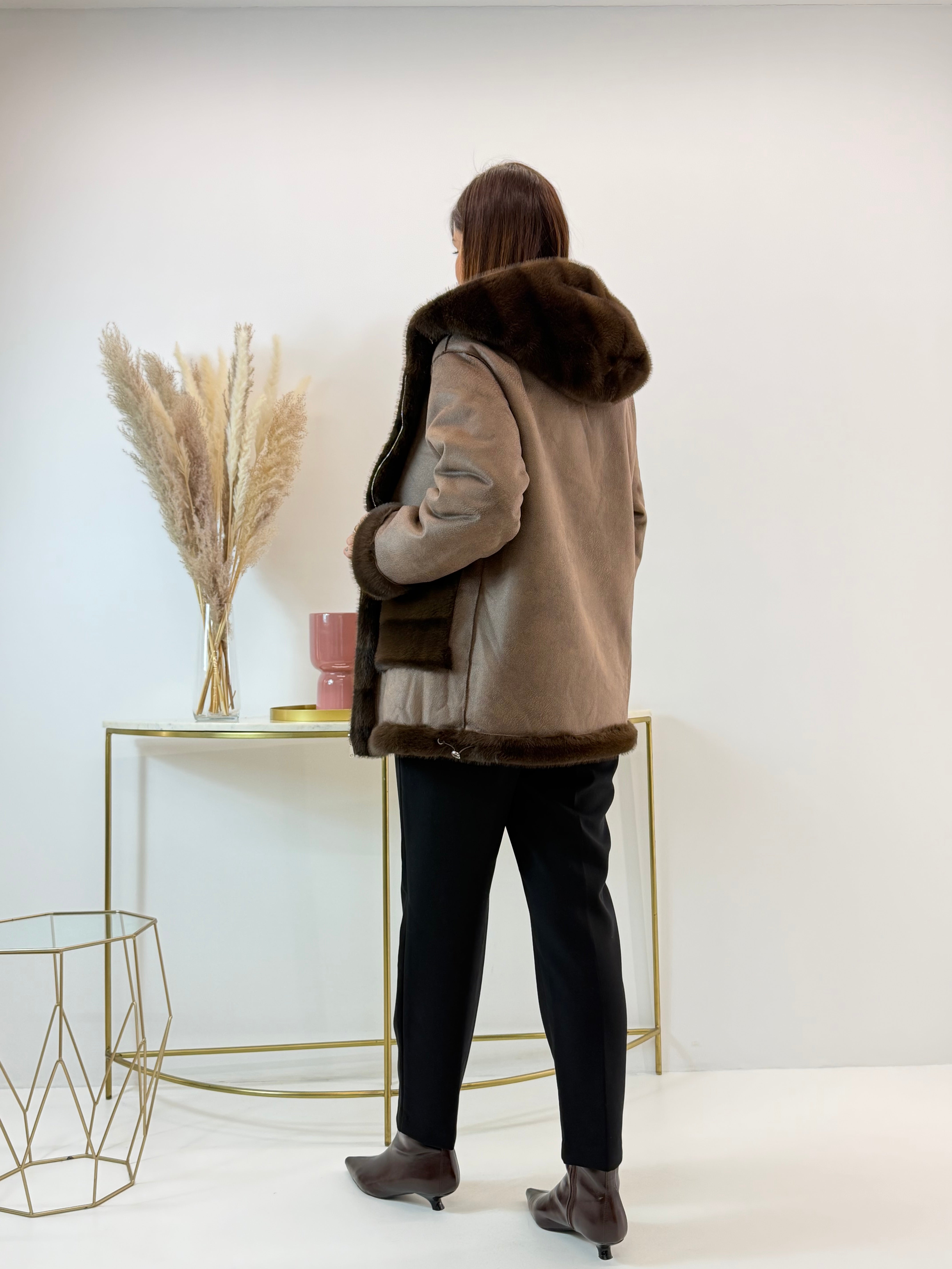 Cappotto corto double-face in pelliccia sintetica con cappuccio voluminoso, che aggiunge un tocco di lusso e calore, due modi per indossarla, uno in morbidissima pelliccetta con tasche a scomparsa, e seconda opzione in eco-montone tono su tono con cappuccio bordi polsini e tasche rifiniti in pelliccia ,stile glamour urbano con un equilibrio tra eleganza e modernità.