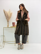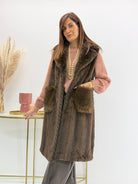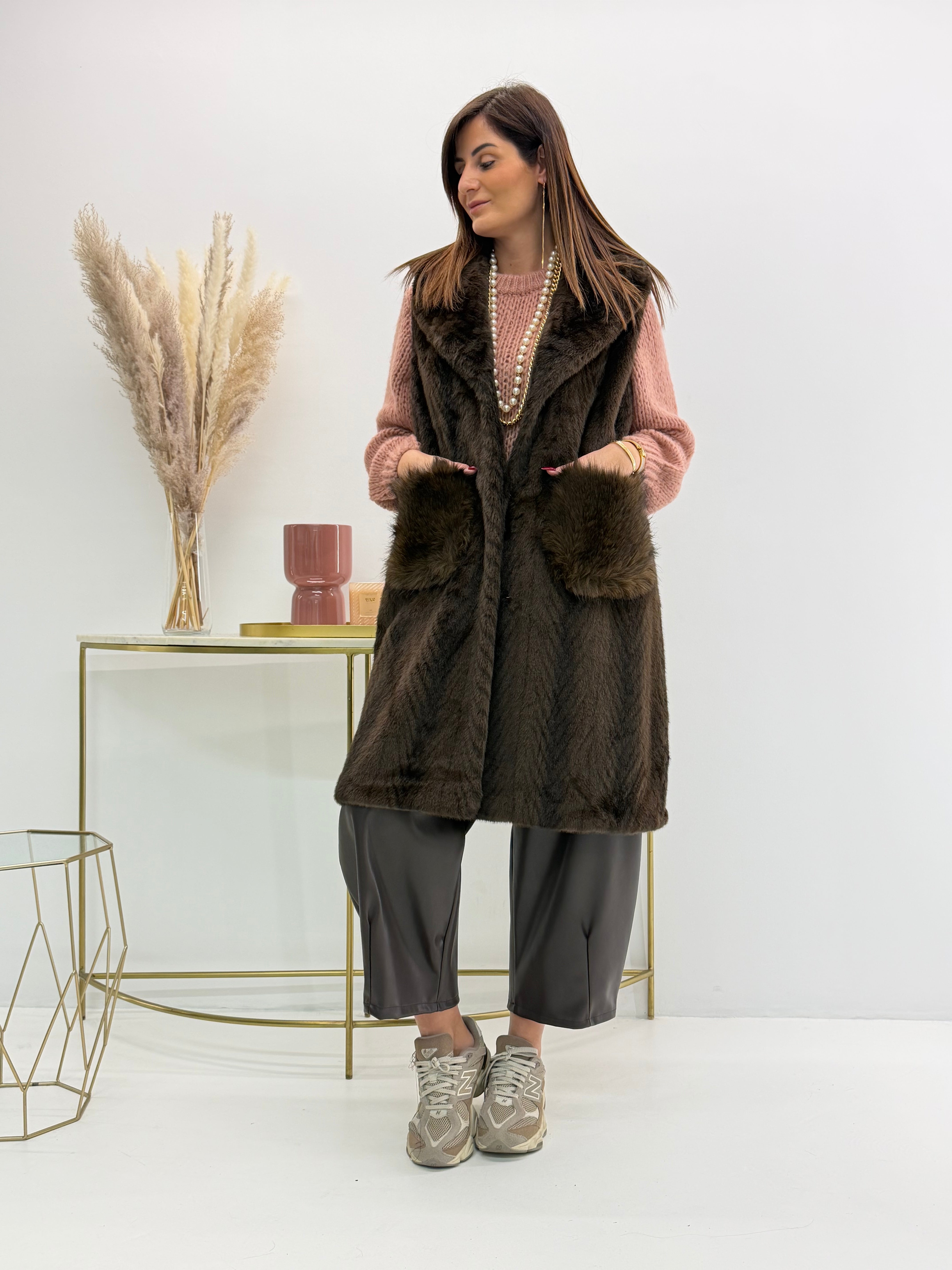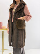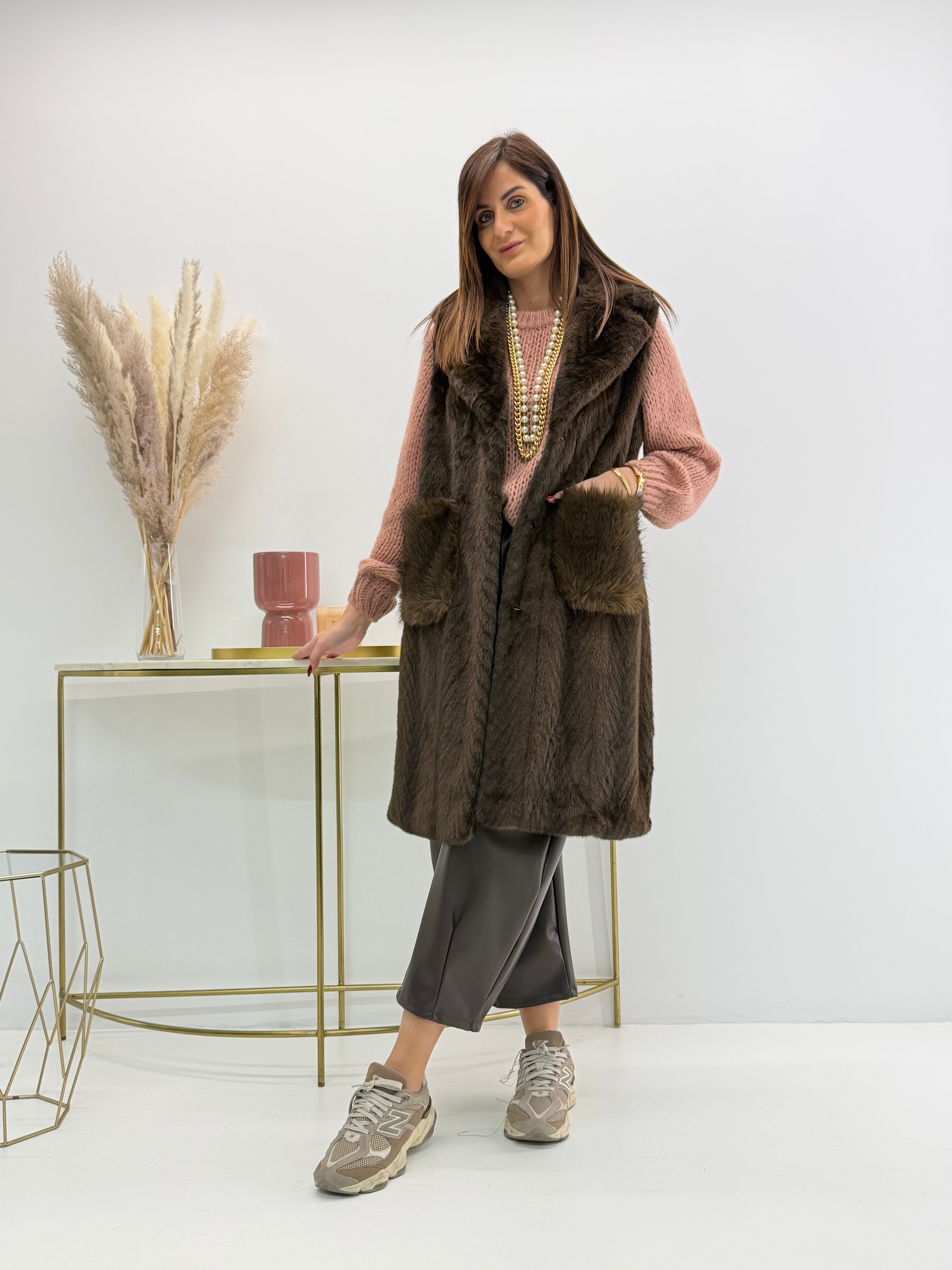 Gilet in morbida eco-pelliccia, fantasia spigata, tasche davanti. Chiusura con gancetti e fodera interna. Versatile e caldo perfetto per look casual ed eleganti.