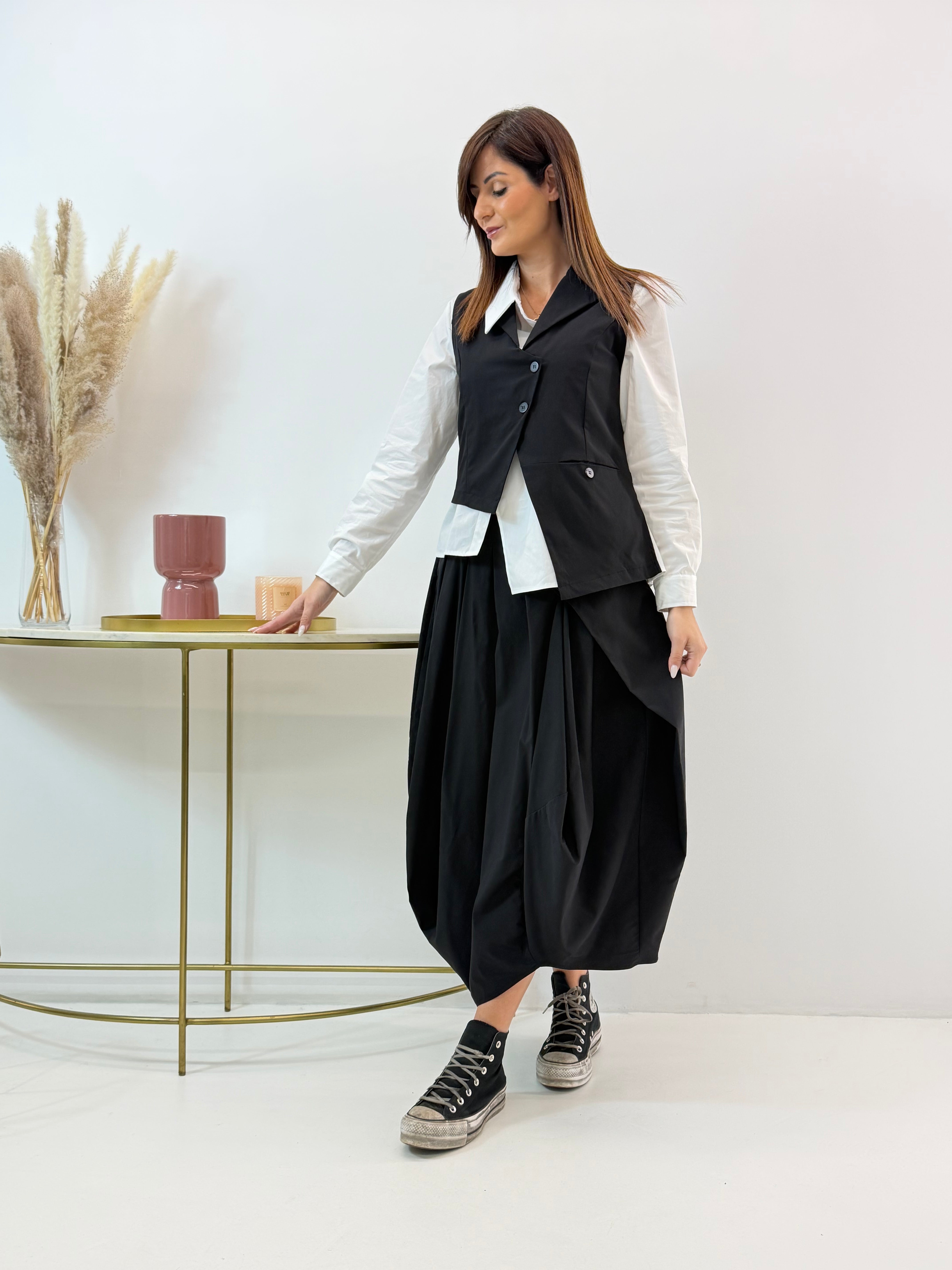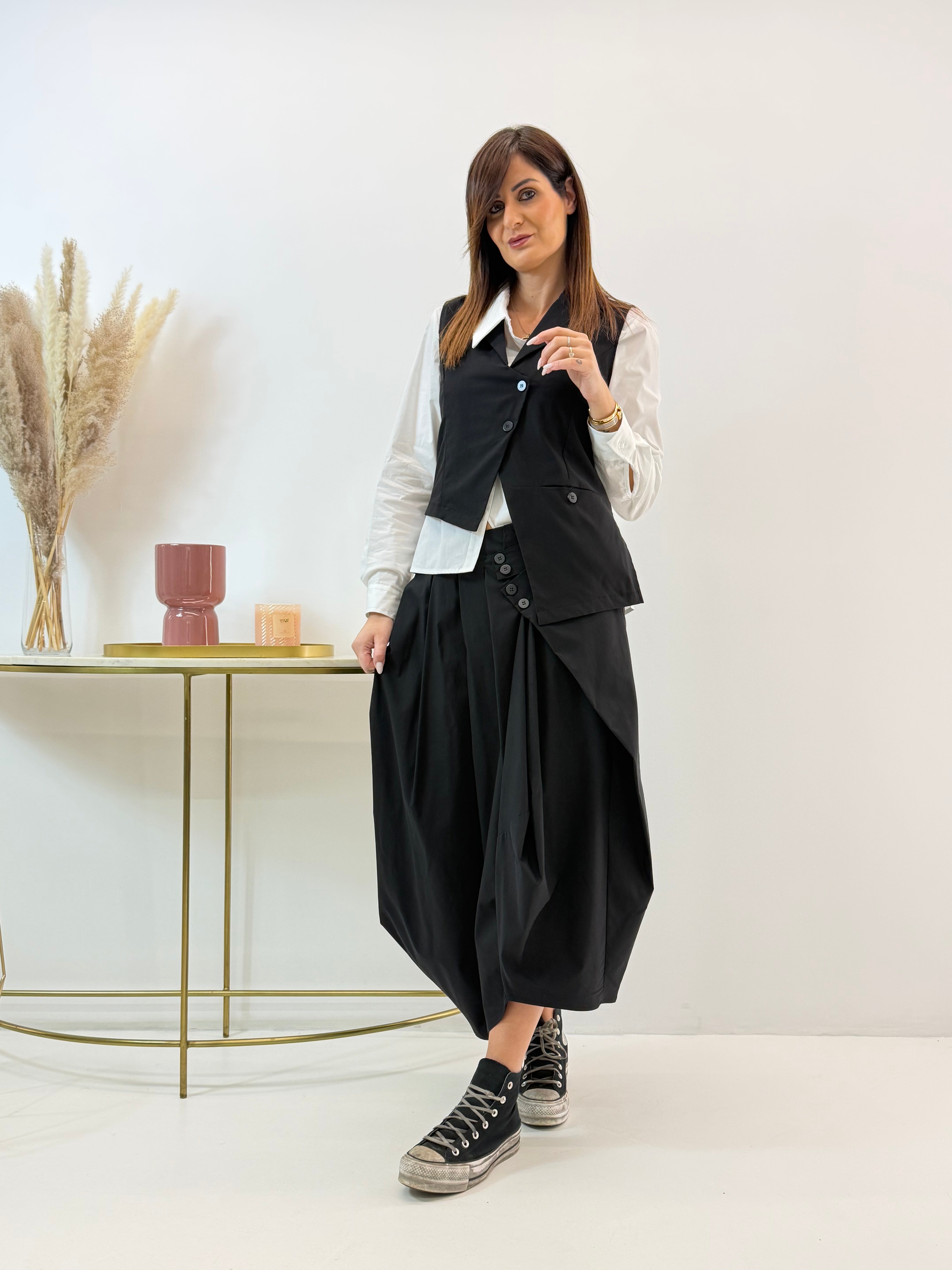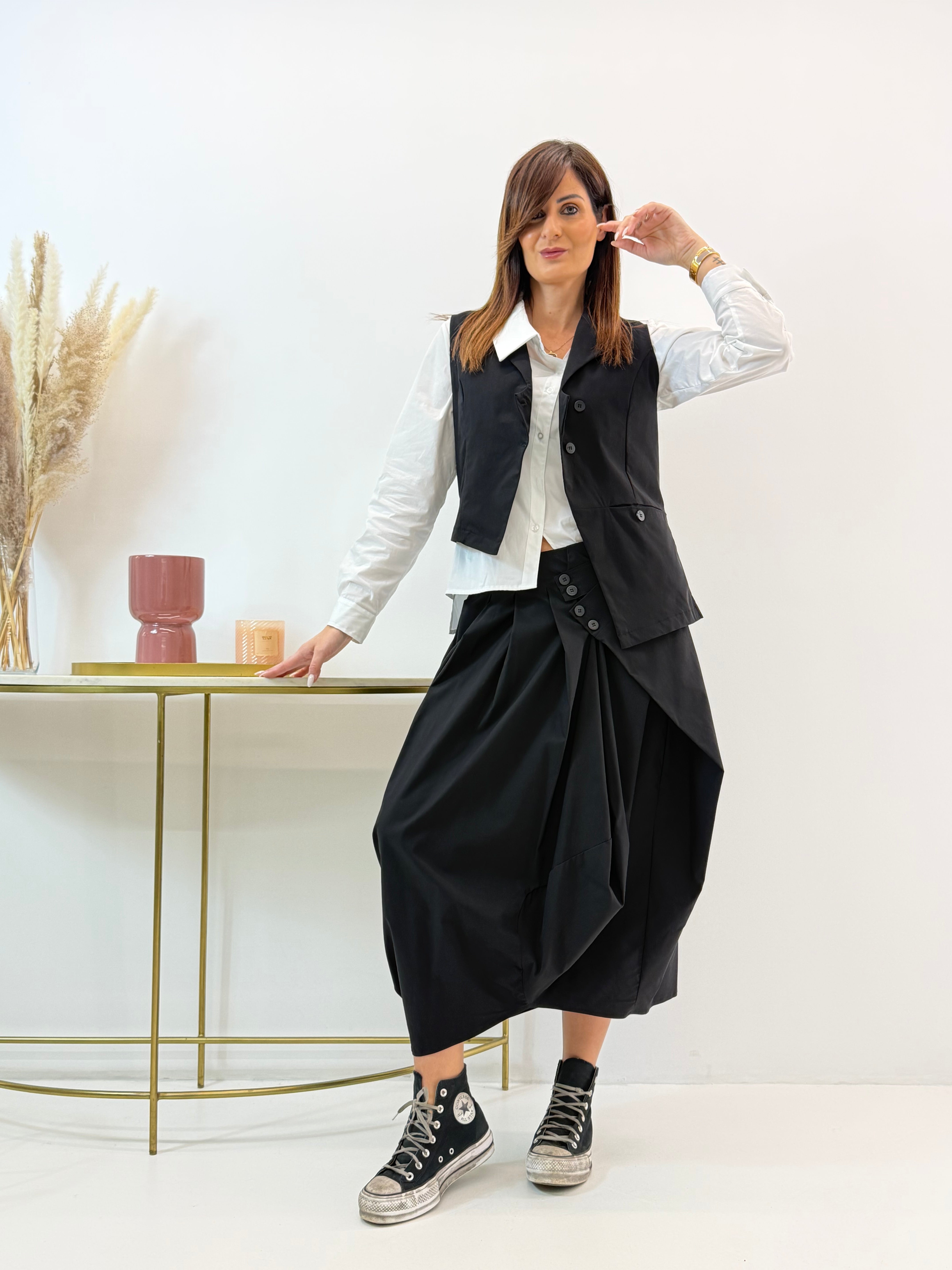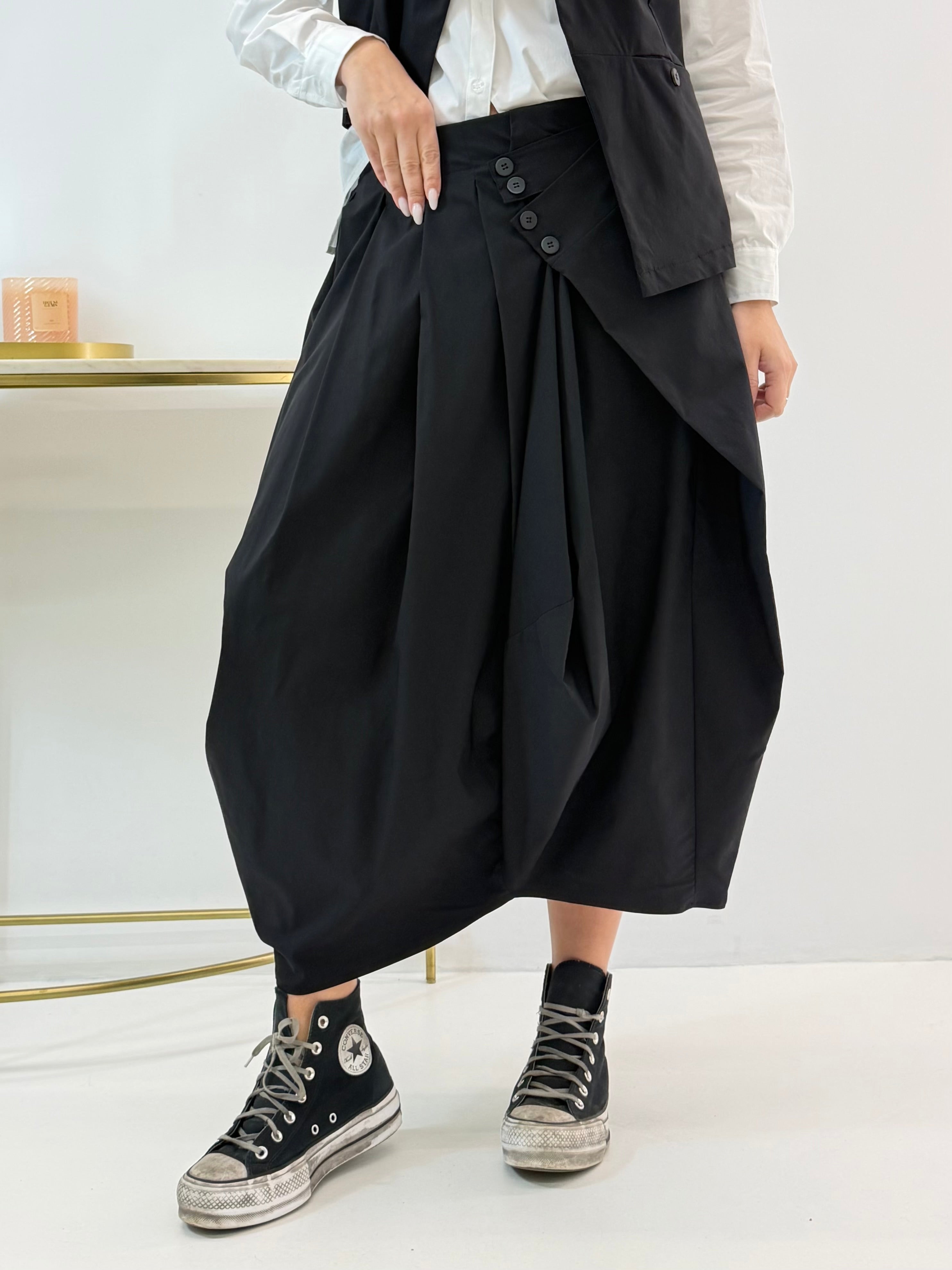 Gonna a palloncino. Fascia elasticizzata in vita dietro, dettaglio di bottoncini sul davanti.