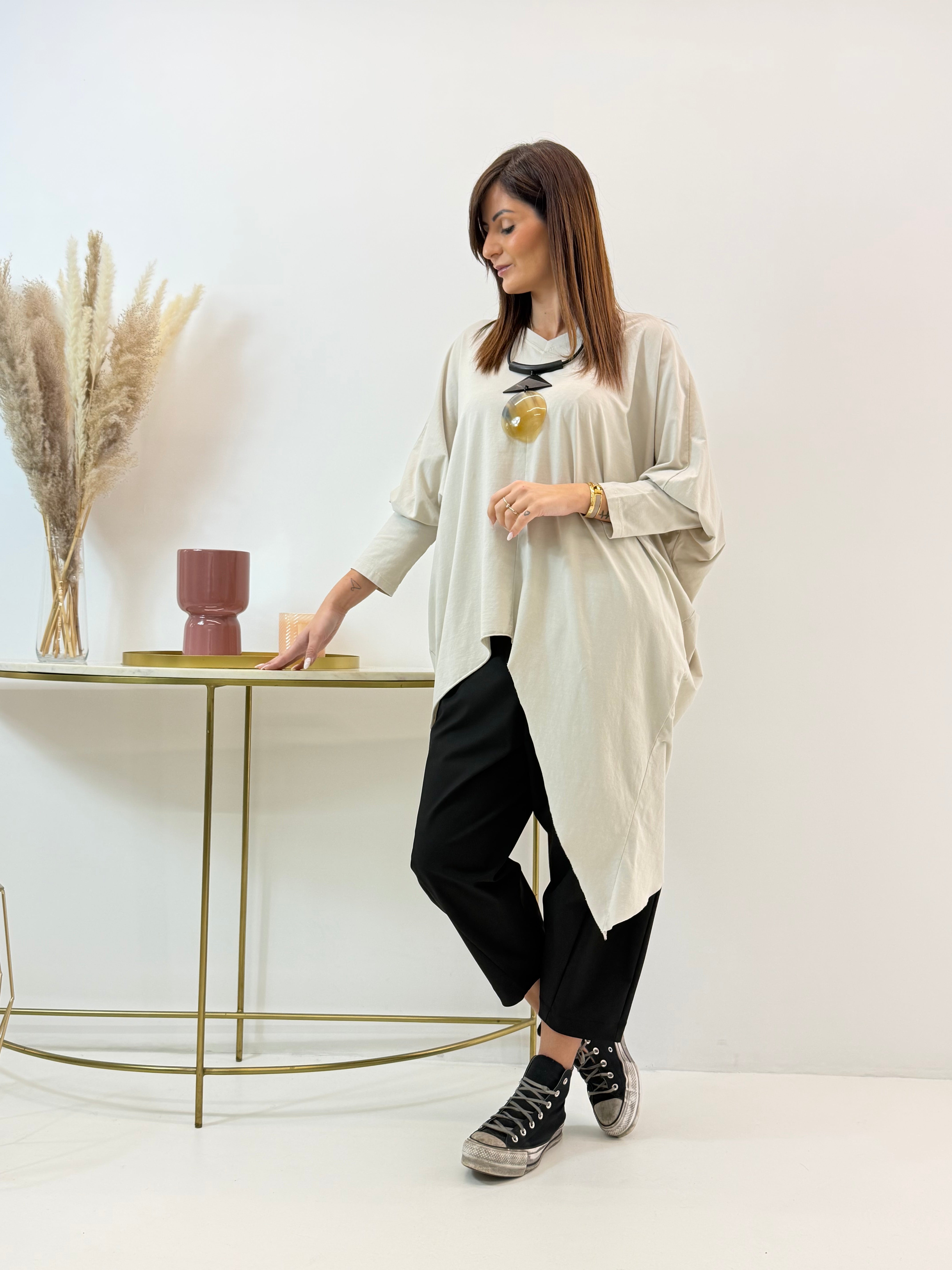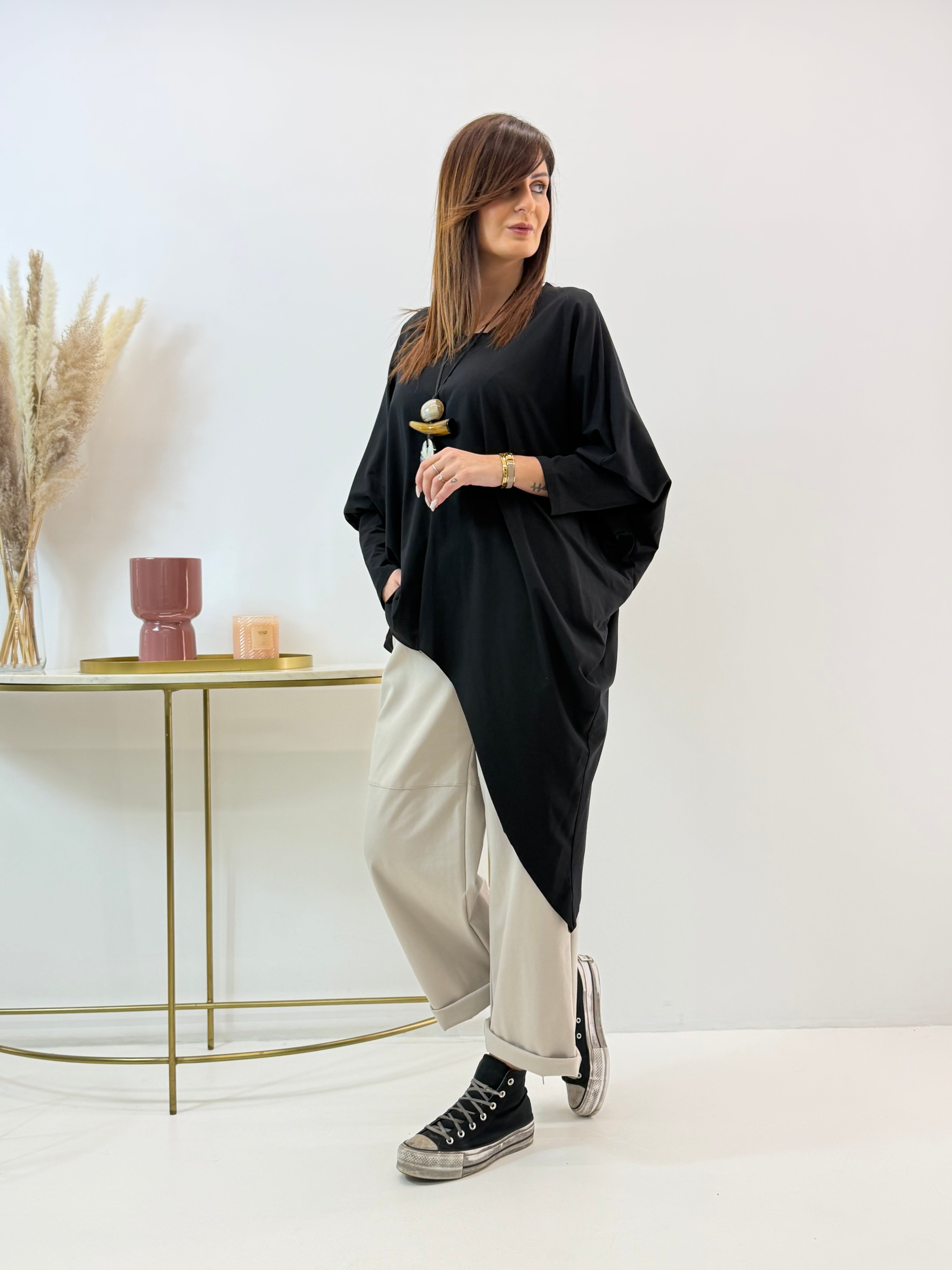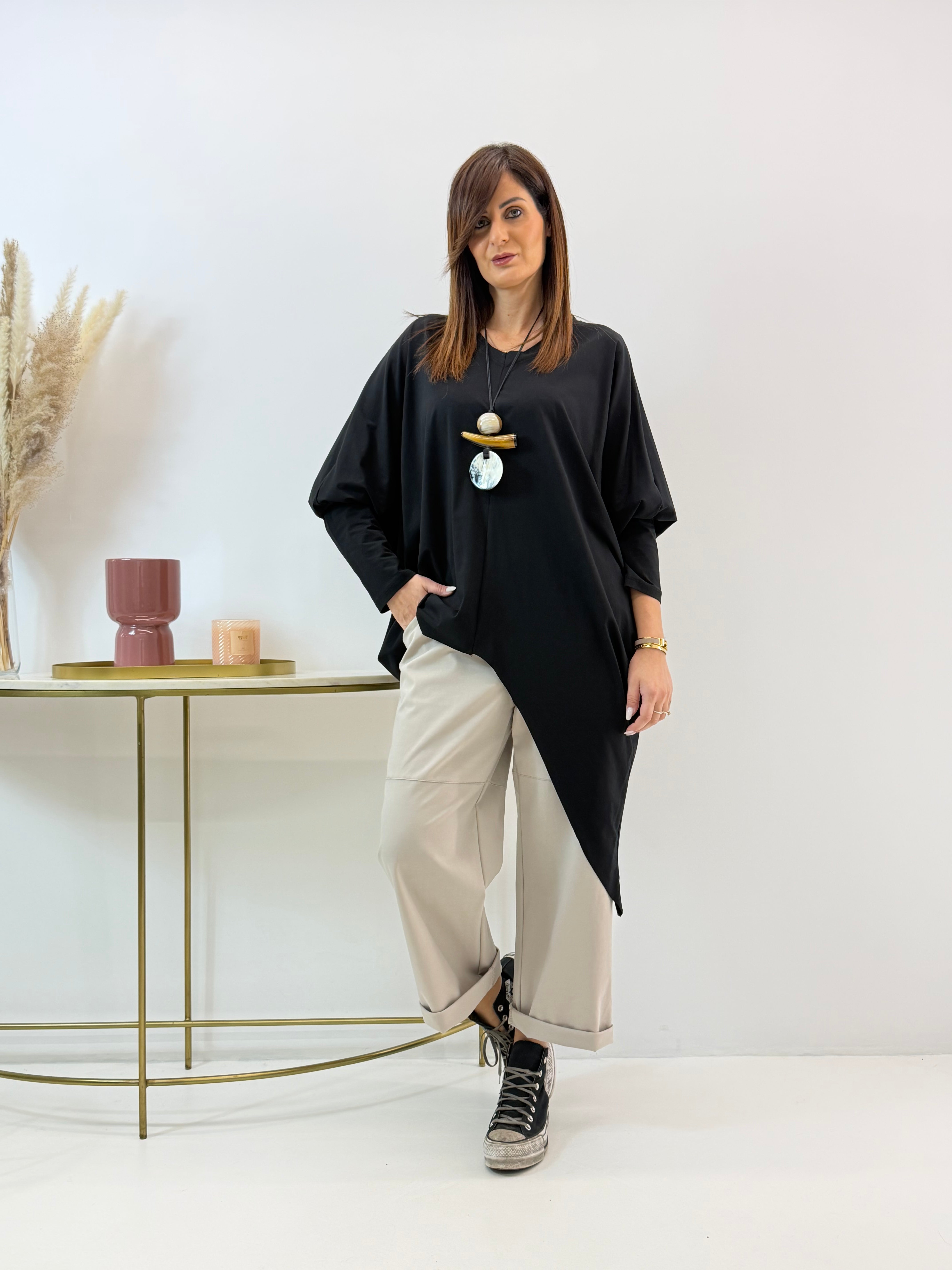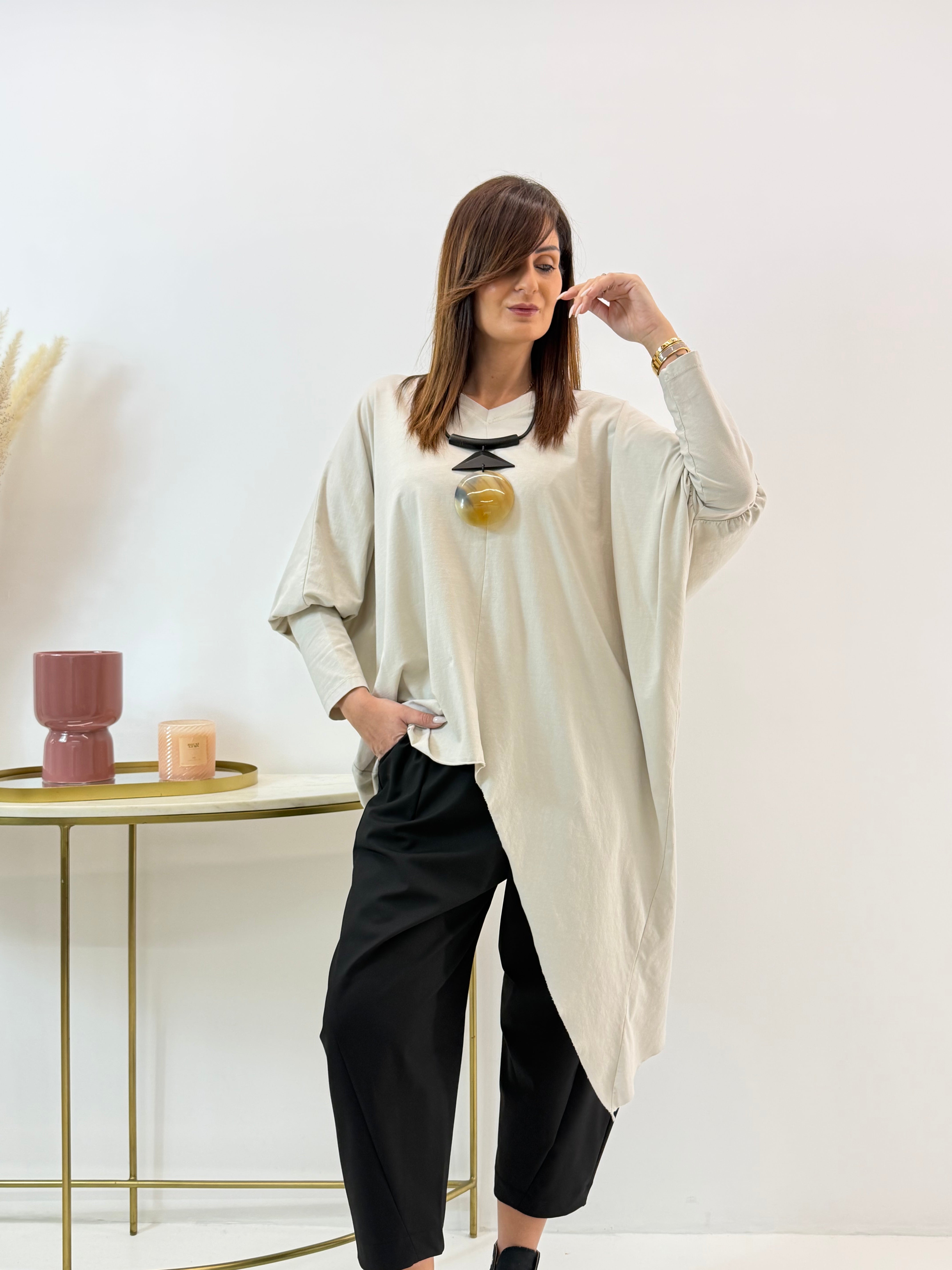 Maglia asimmetrica in cotone, scollo a V, maniche a pipistrello e parte finale con polsino, retro semplice e punta laterale.