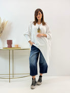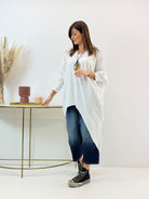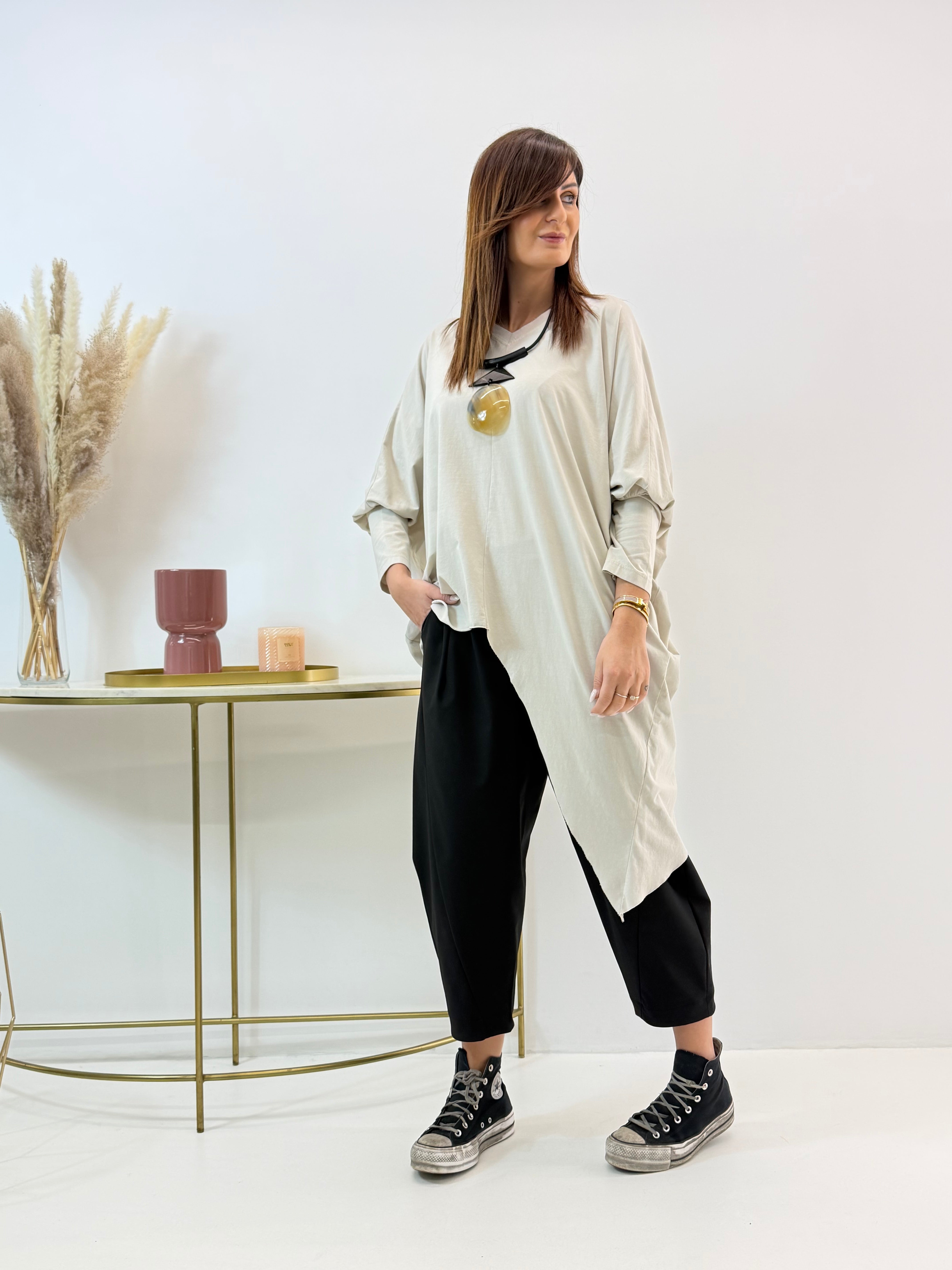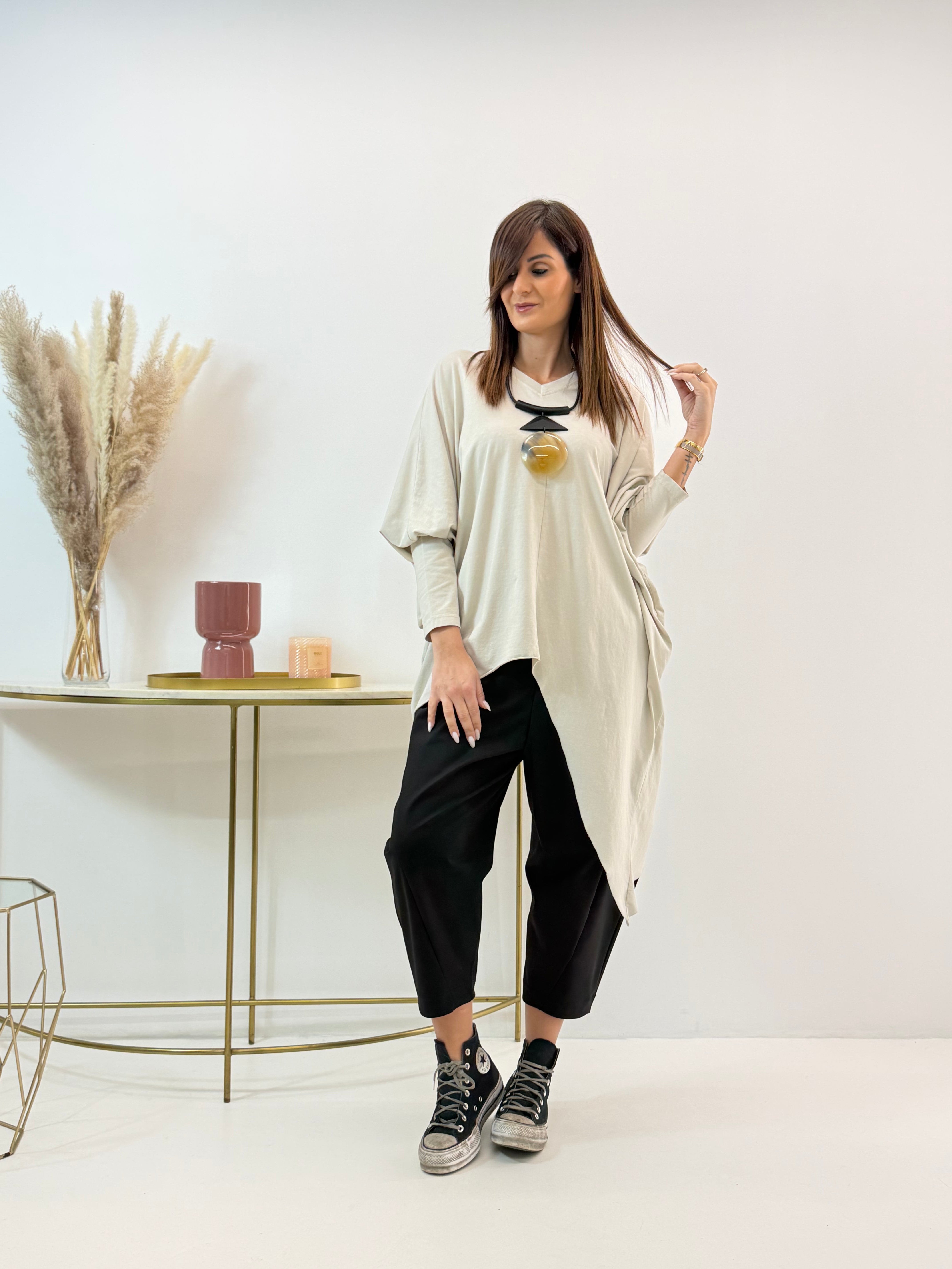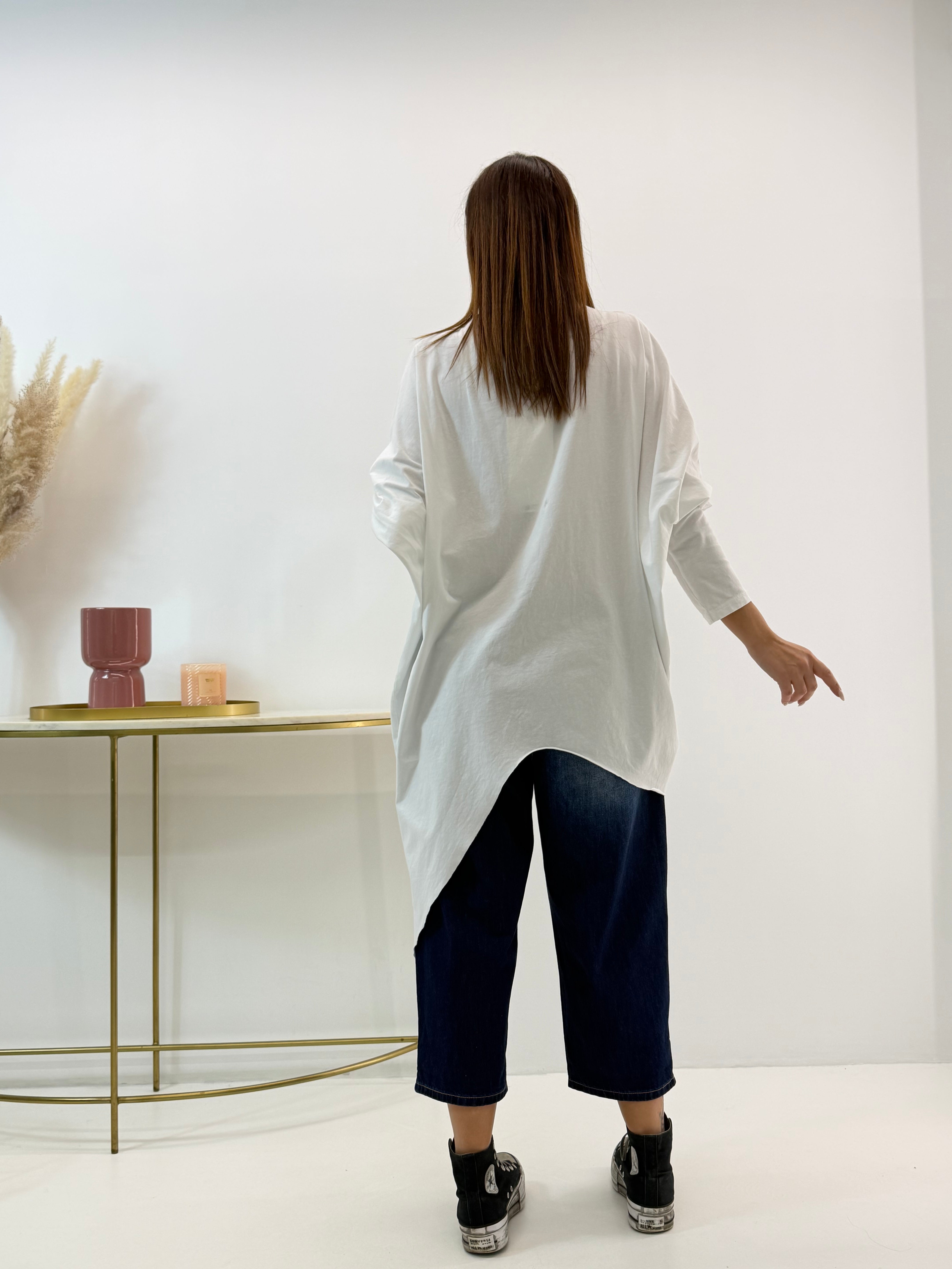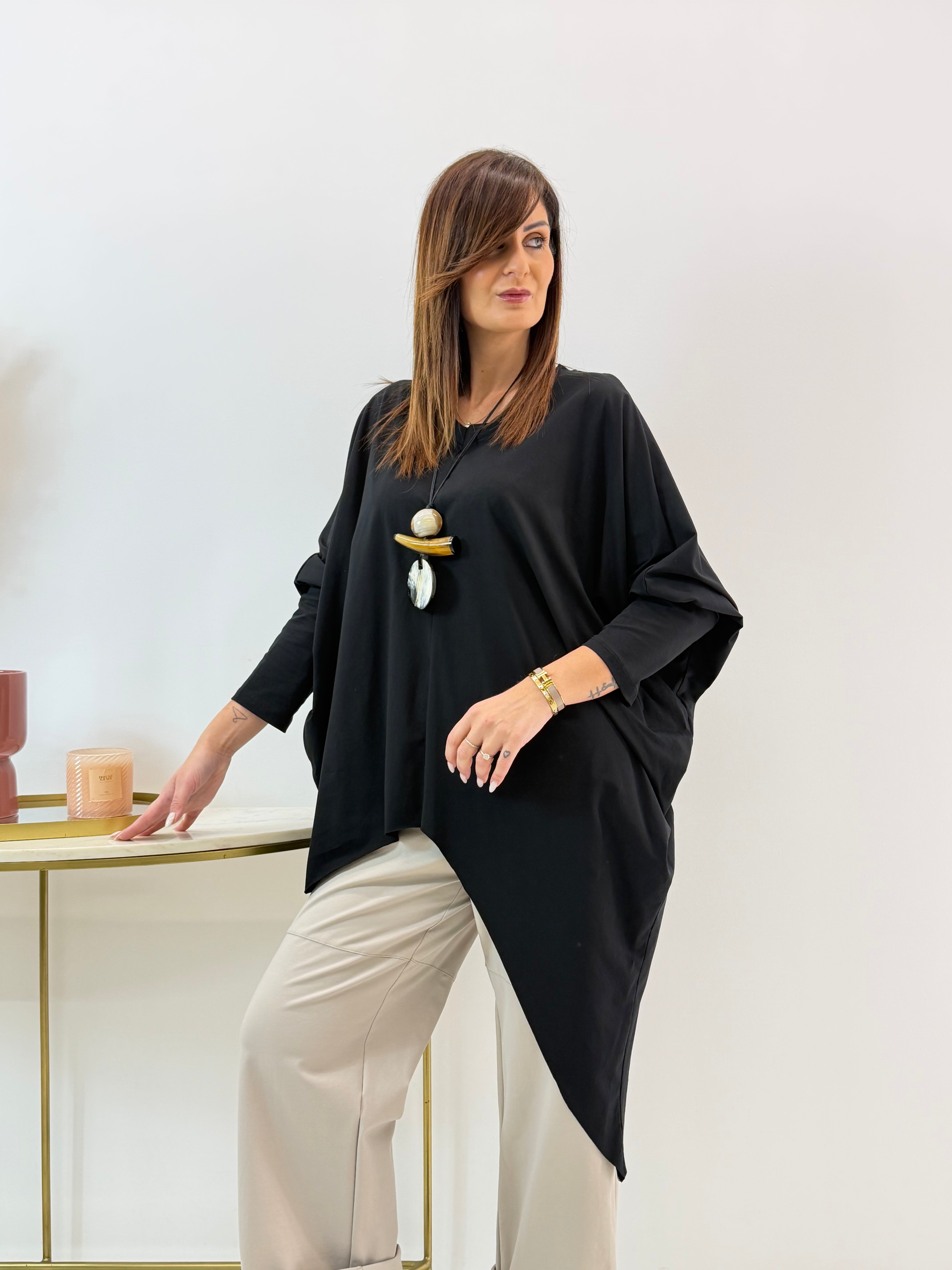 Maglia asimmetrica in cotone, scollo a V, maniche a pipistrello e parte finale con polsino, retro semplice e punta laterale.