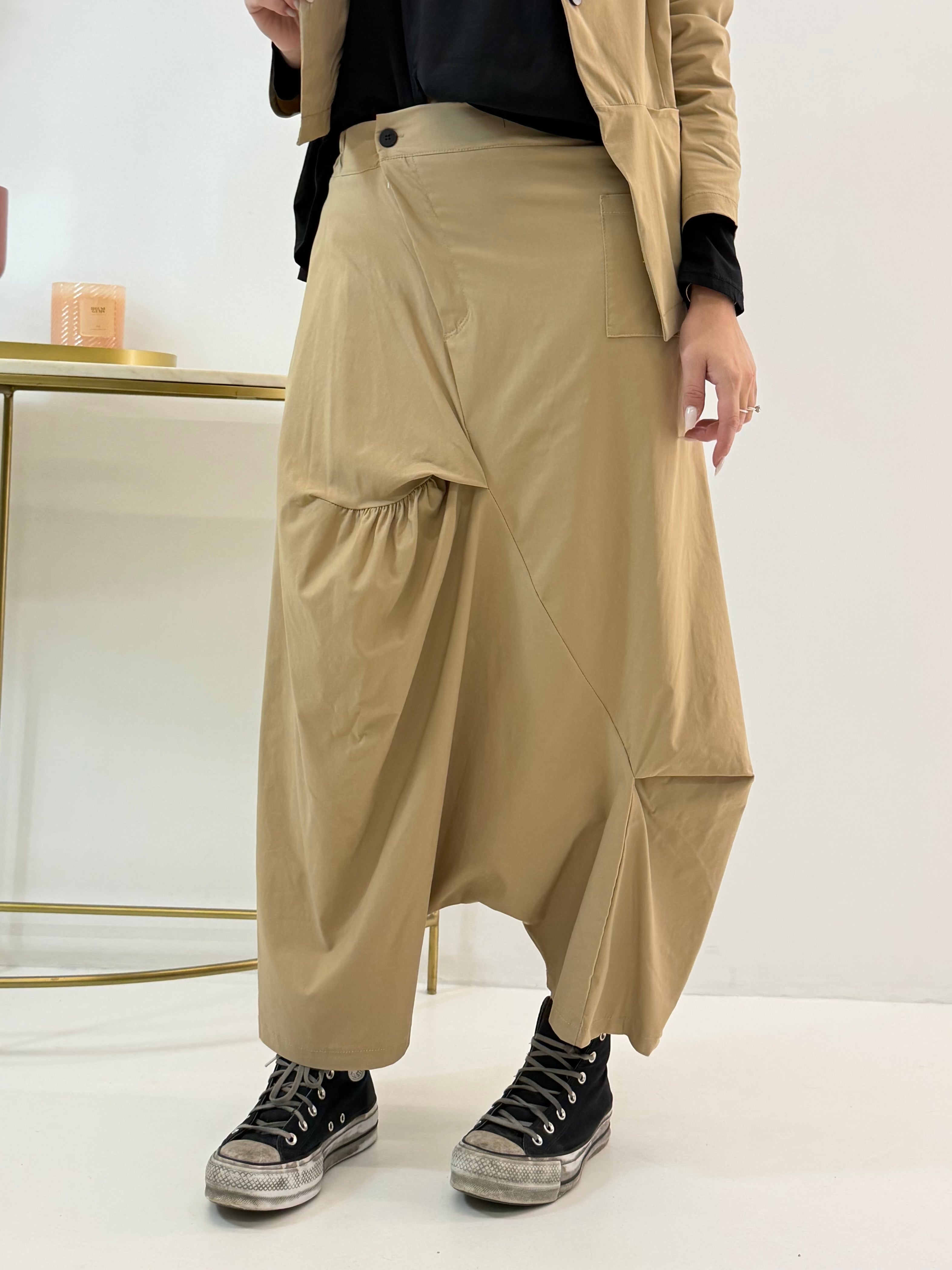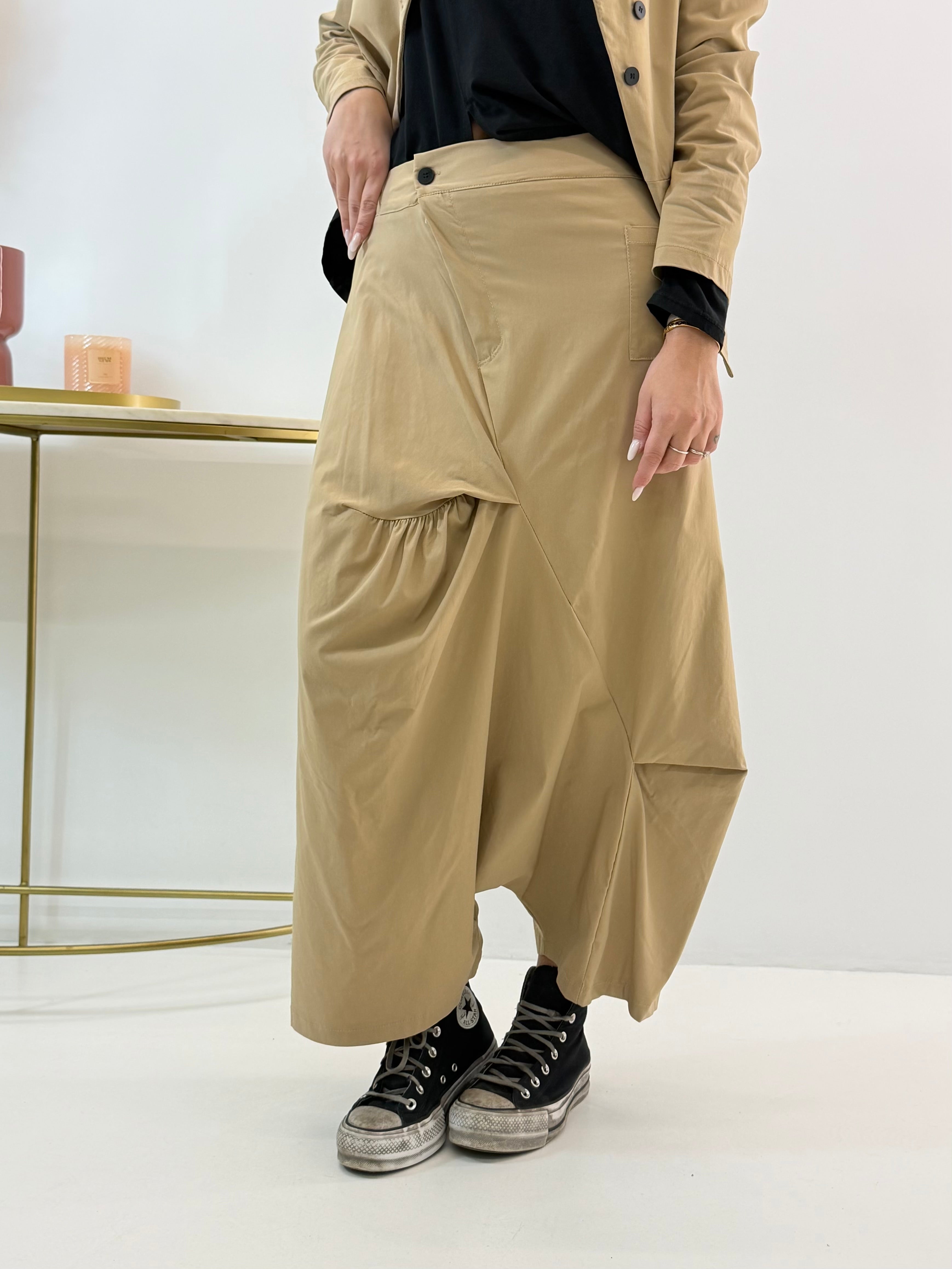 Pantagonna in misto viscosa. Fascia elasticizzata in vita dietro, chiusura con zip e bottone. Cavallo molto basso.