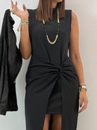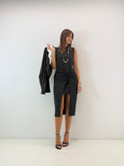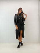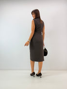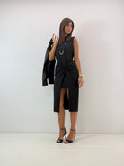 Abito longuette dalla linea sofisticata, impreziosito da un drappeggio laterale che sottolinea delicatamente il punto vita. Lo spacco laterale dona un accento sensuale e dinamico. Zip discreta sul retro per una chiusura pulita e precisa.