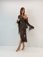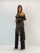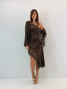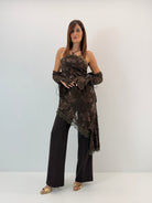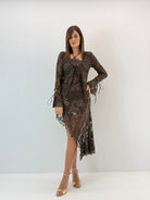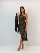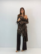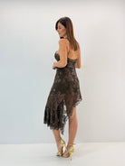 Abito asimmetrico in tulle e applicazione di paillettes, scollo all'americana, spalline sottili, sottoveste interna, applicazione di pizzo sull'orlo.