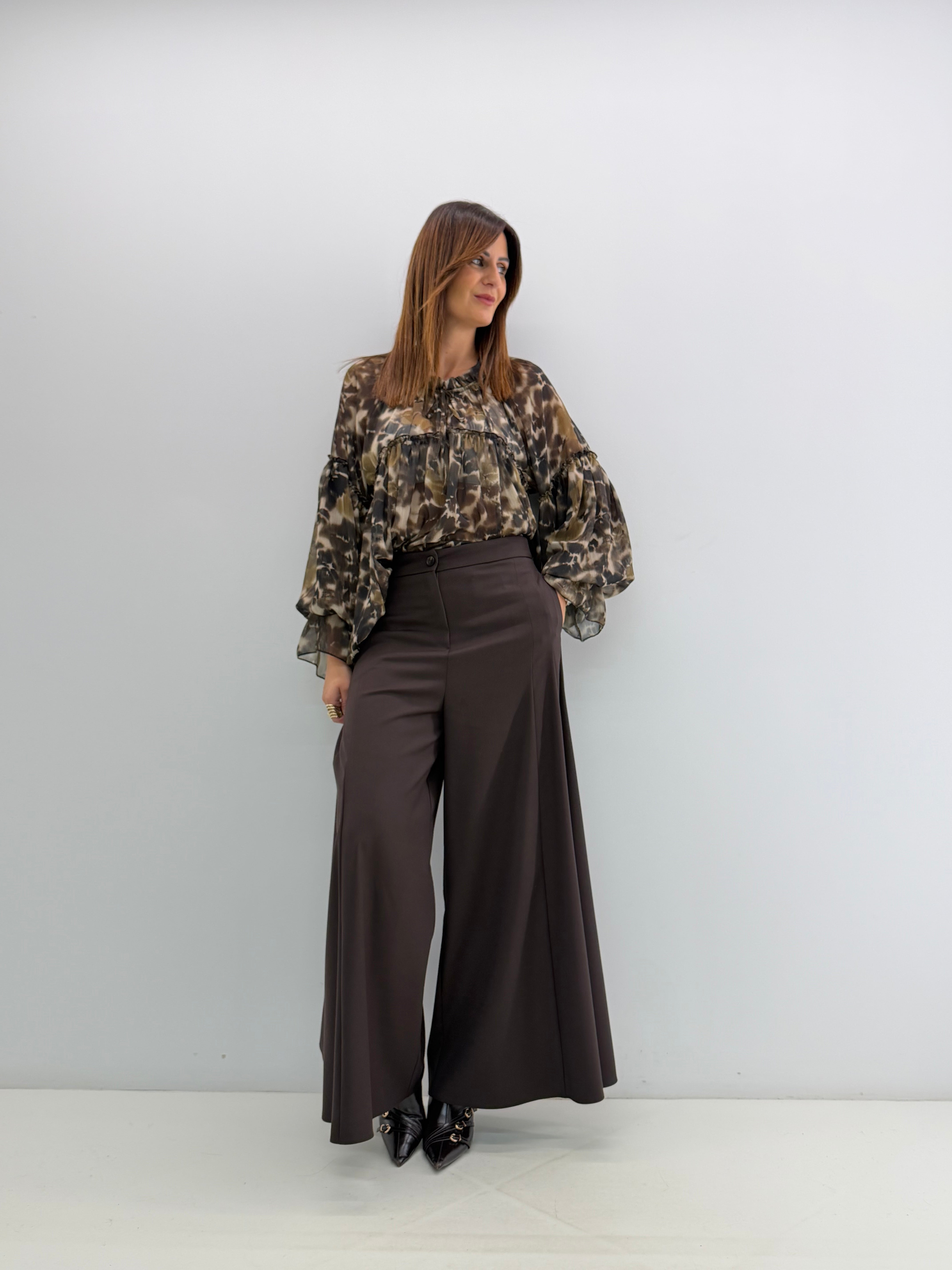 Blusa semi trasparenti, fantasia verde, maniche a sbuffo e polsino elastico. Scollo rotondo arricciato, più lunga dietro.