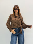 Camicia con fantasia a pois, caratterizzata da un raffinato fiocco al collo. Chiusura con bottoni davanti.  Taglia unica fino alla 46.