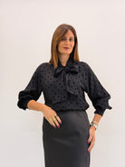 Camicia con fantasia a pois, caratterizzata da un raffinato fiocco al collo. Chiusura con bottoni davanti. Taglia unica fino alla 46.