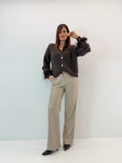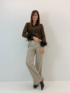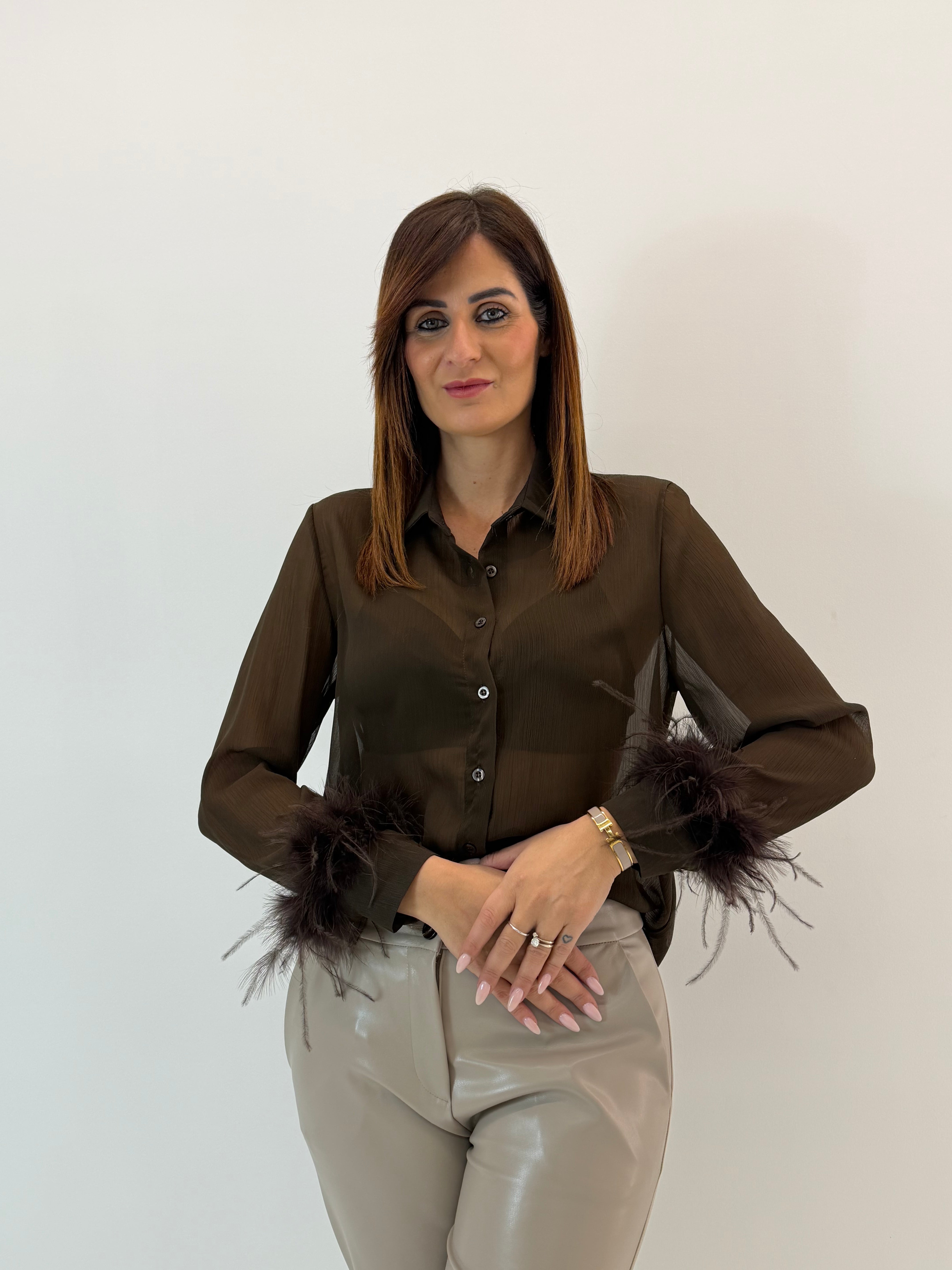Camicia semi trasparente. Chiusura con bottoni davanti, applicazione di piume sul polsino.