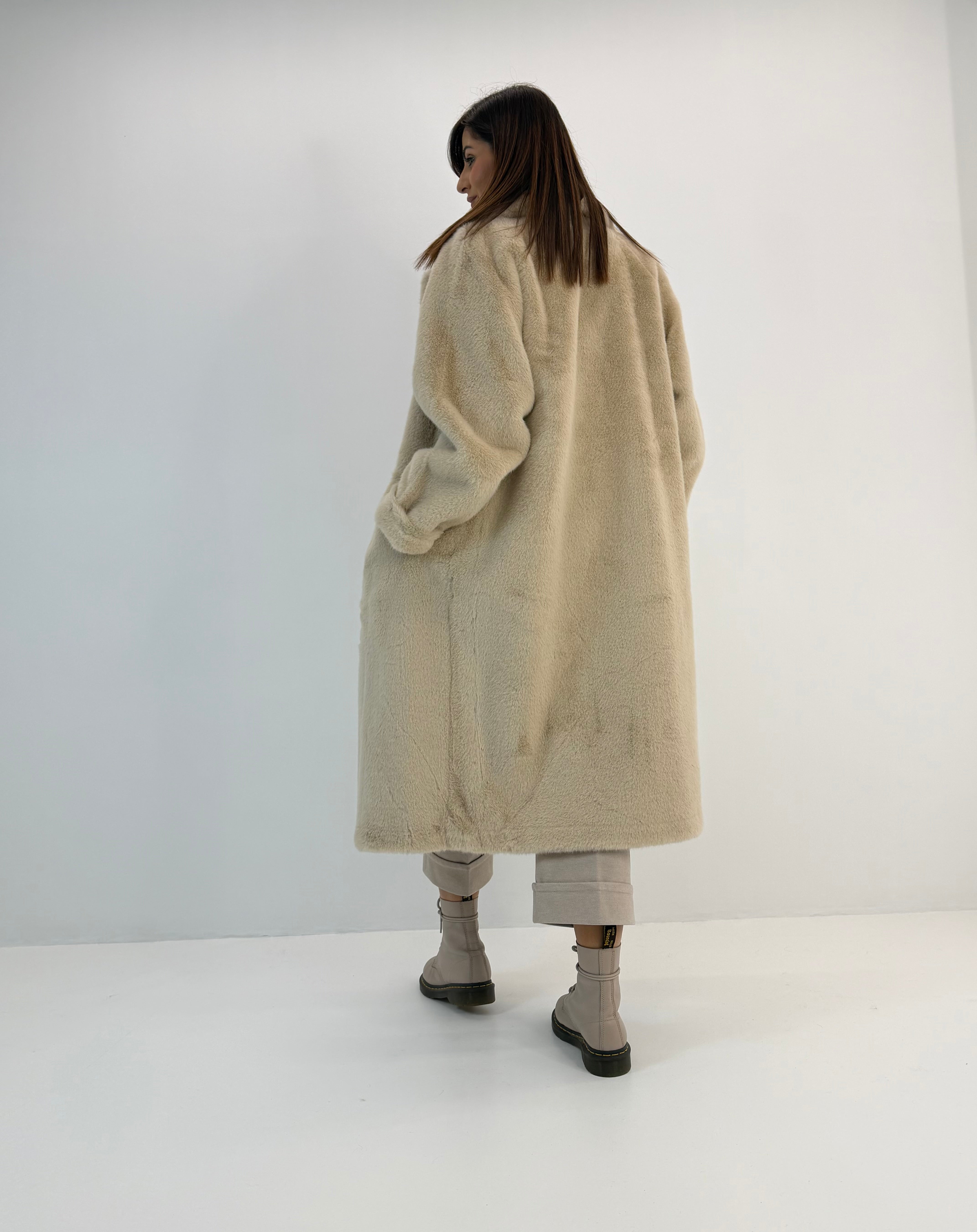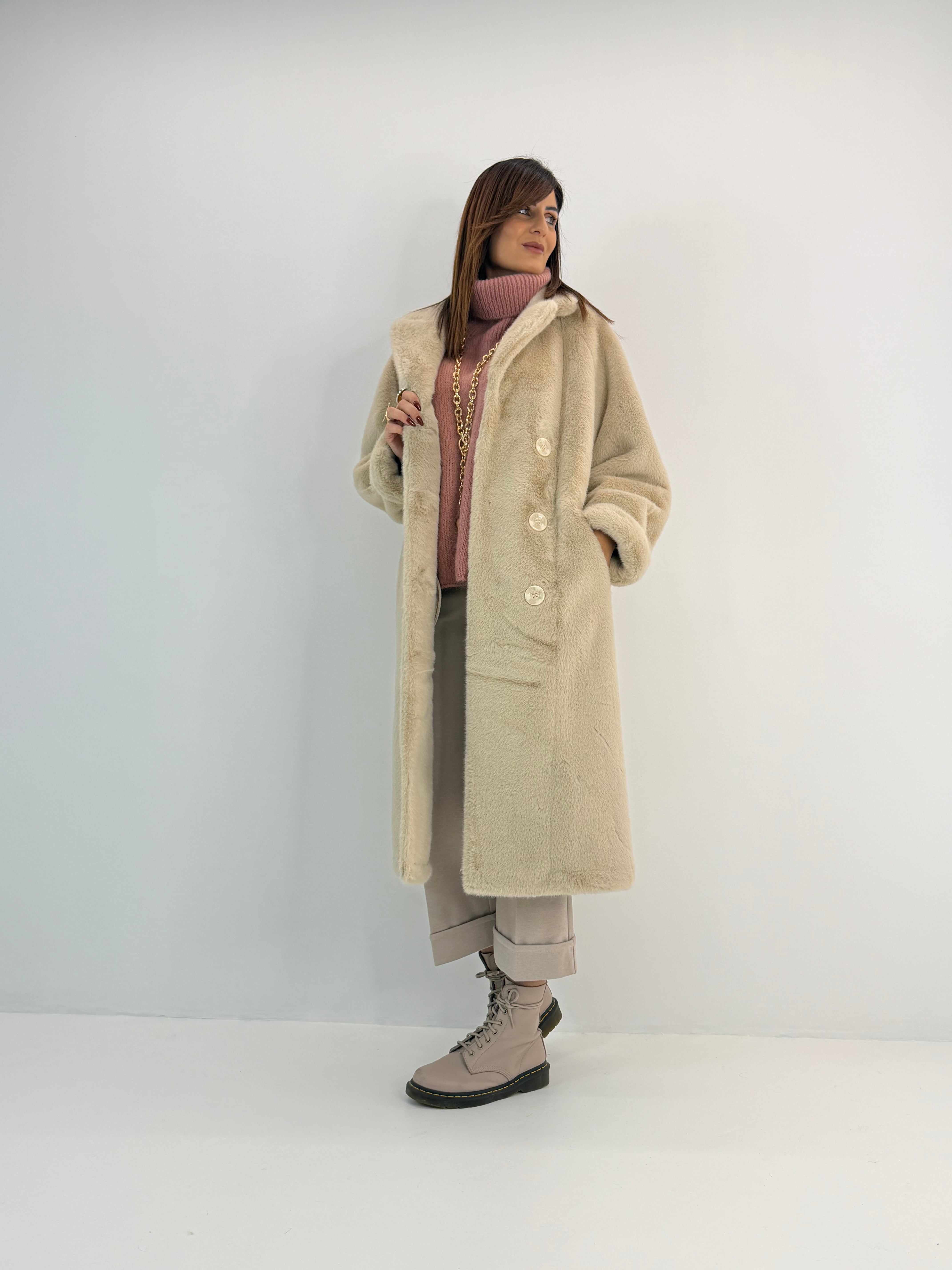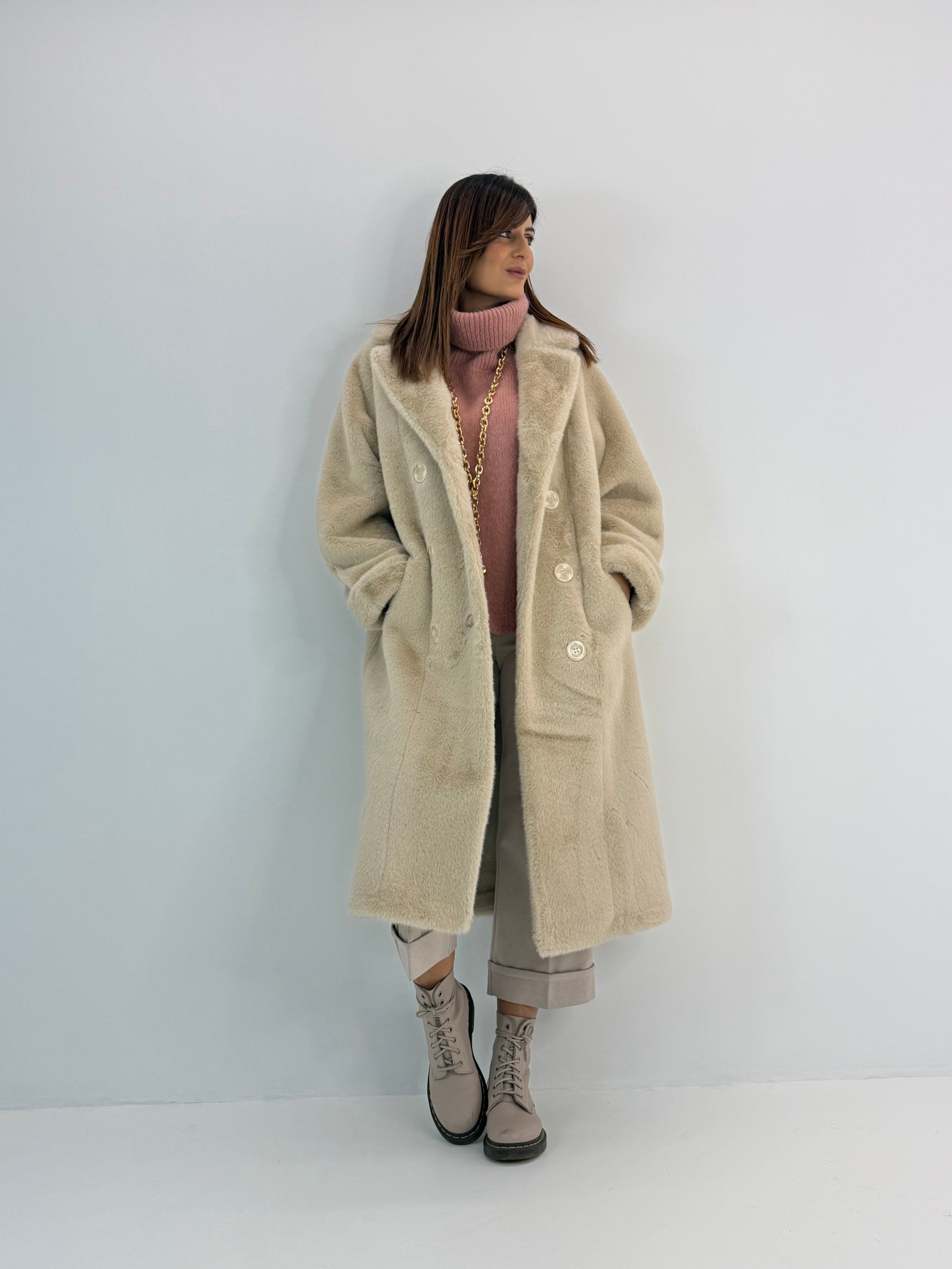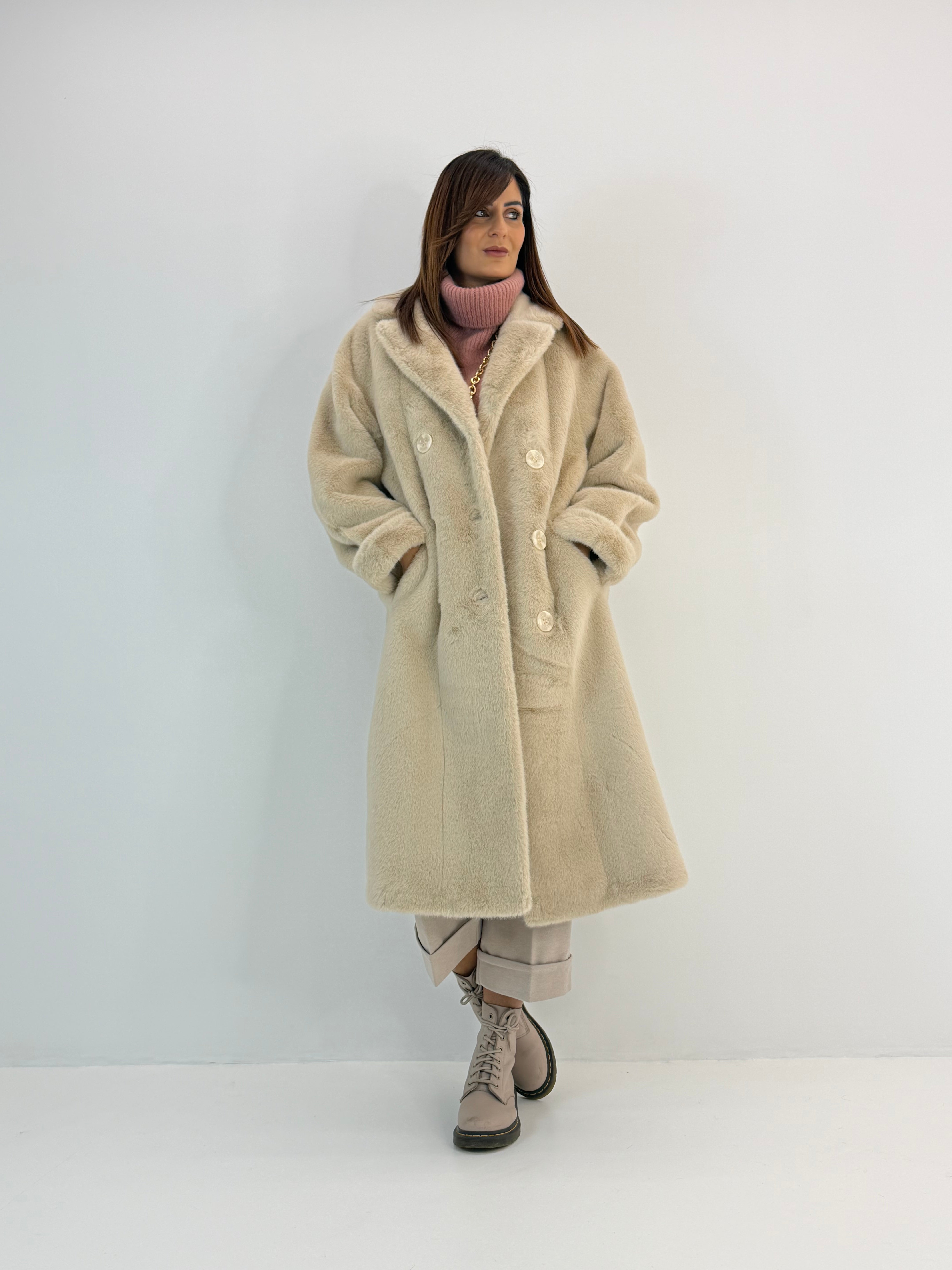 Cappotto lungo a doppiopetto in eco pelliccia, tasche laterali, chiusura con bottoni davanti, vestibilità over.