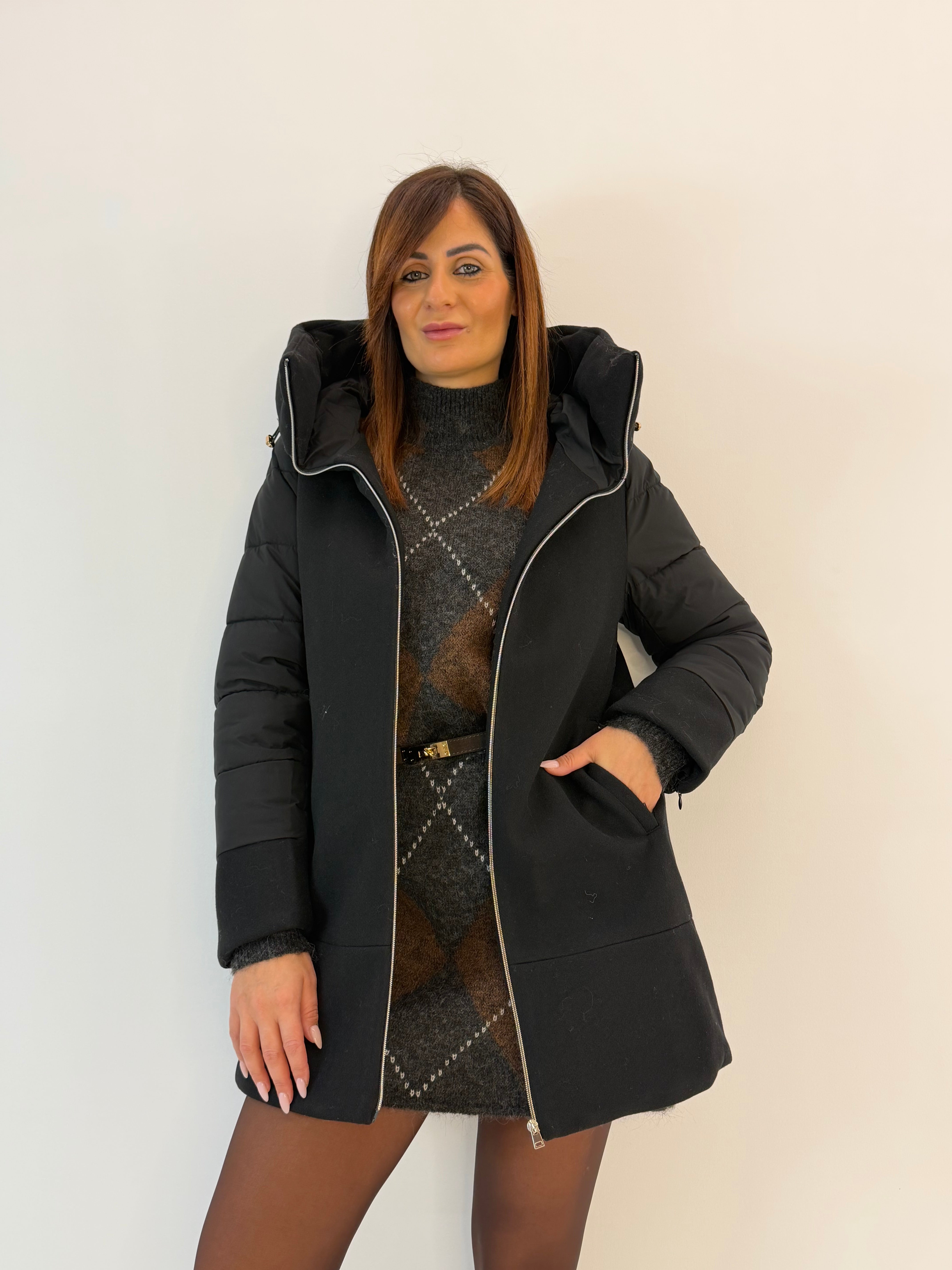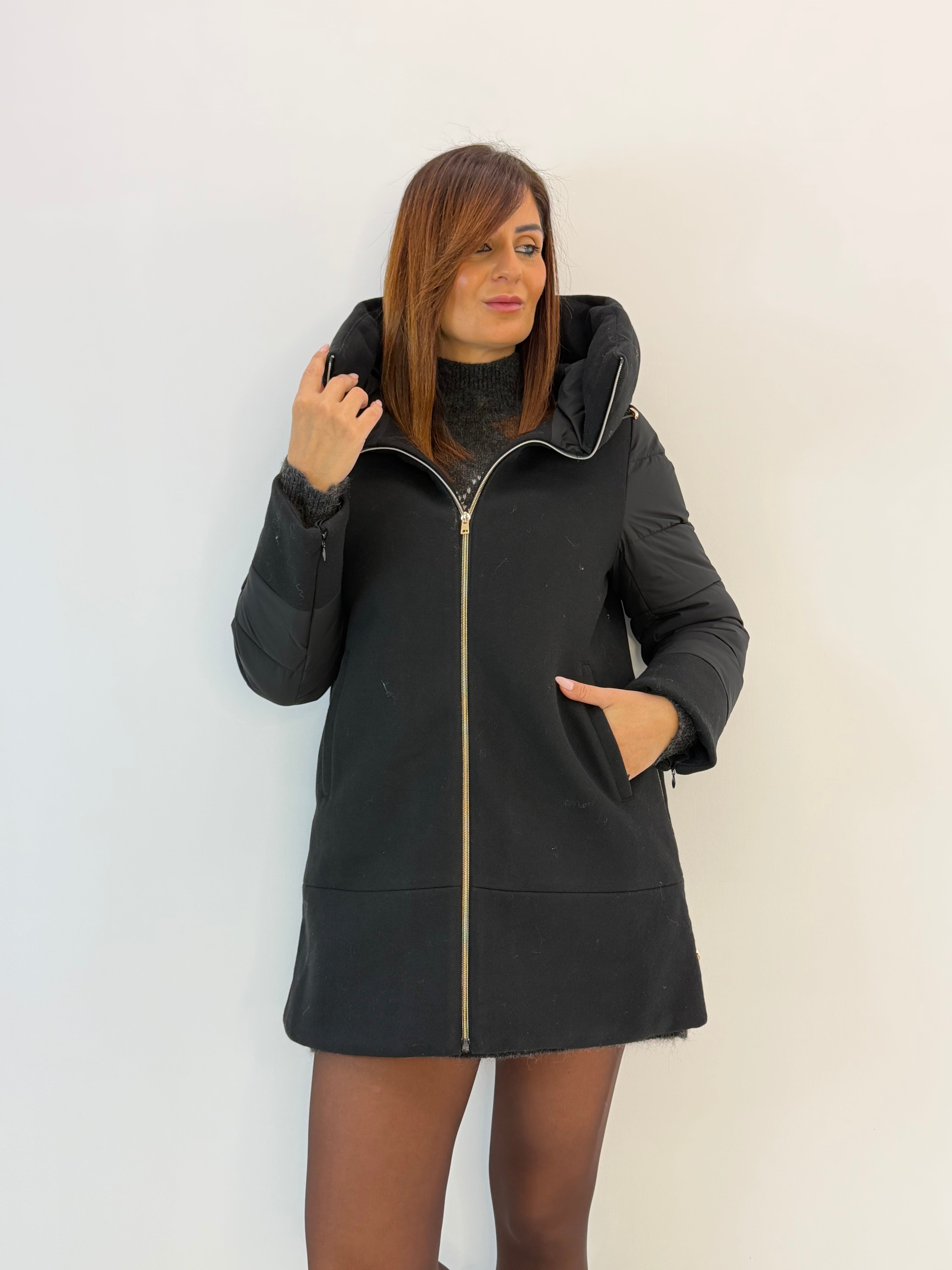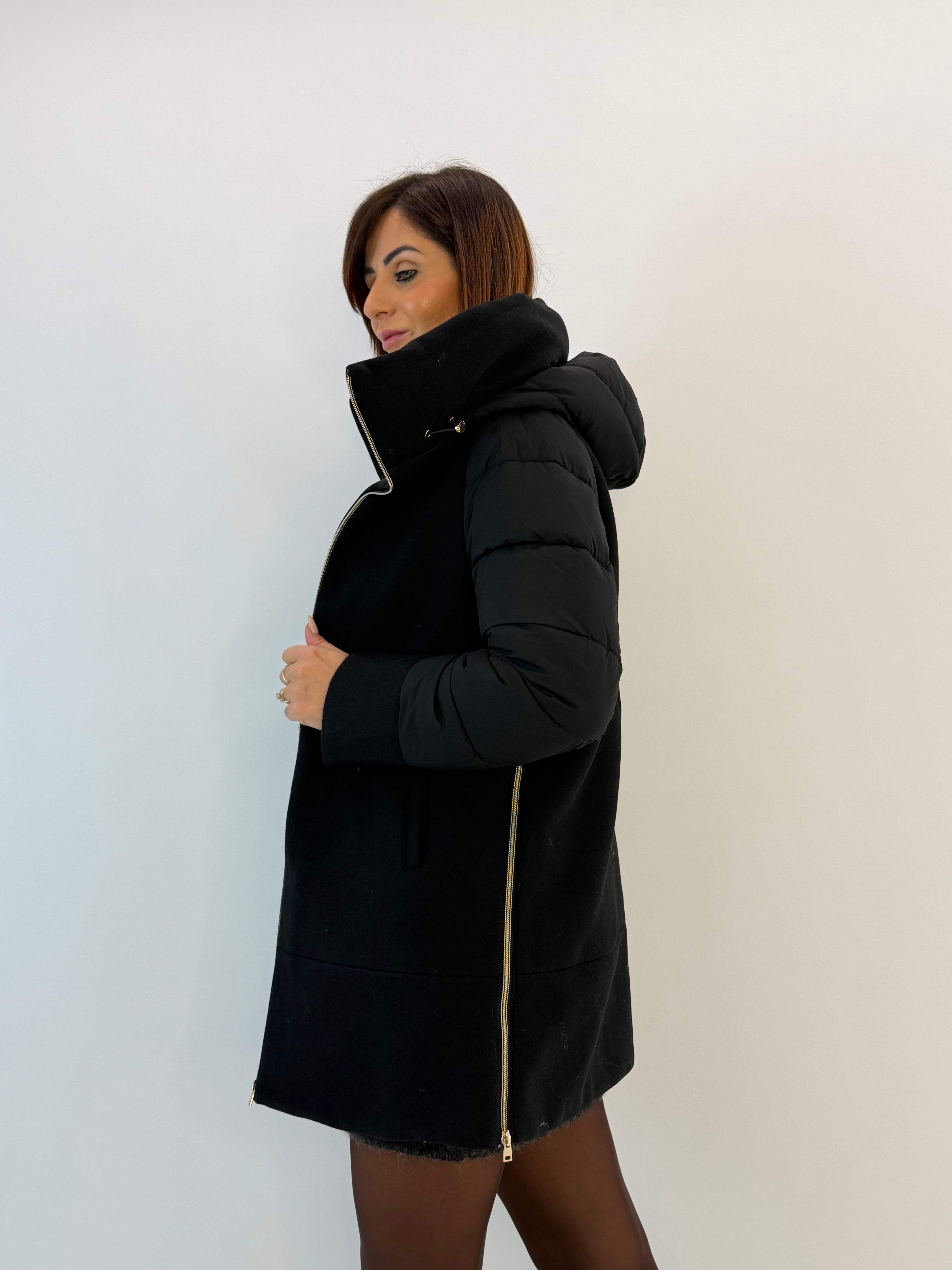 Cappotto piumino in panno con cappuccio, manica in piumino, cerniere laterali e chiusura davanti con zip. Fodera interna, tasche laterali.,