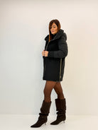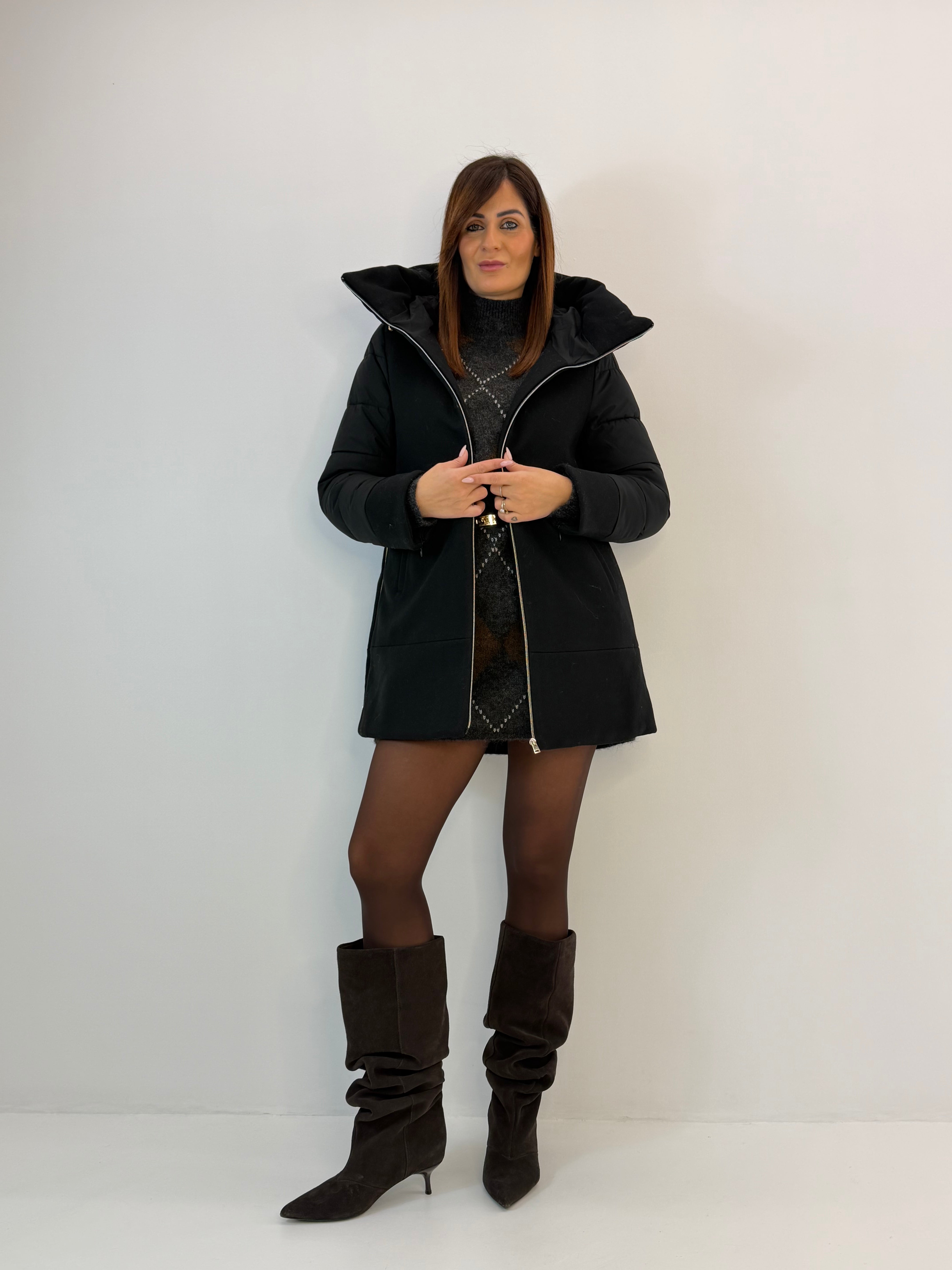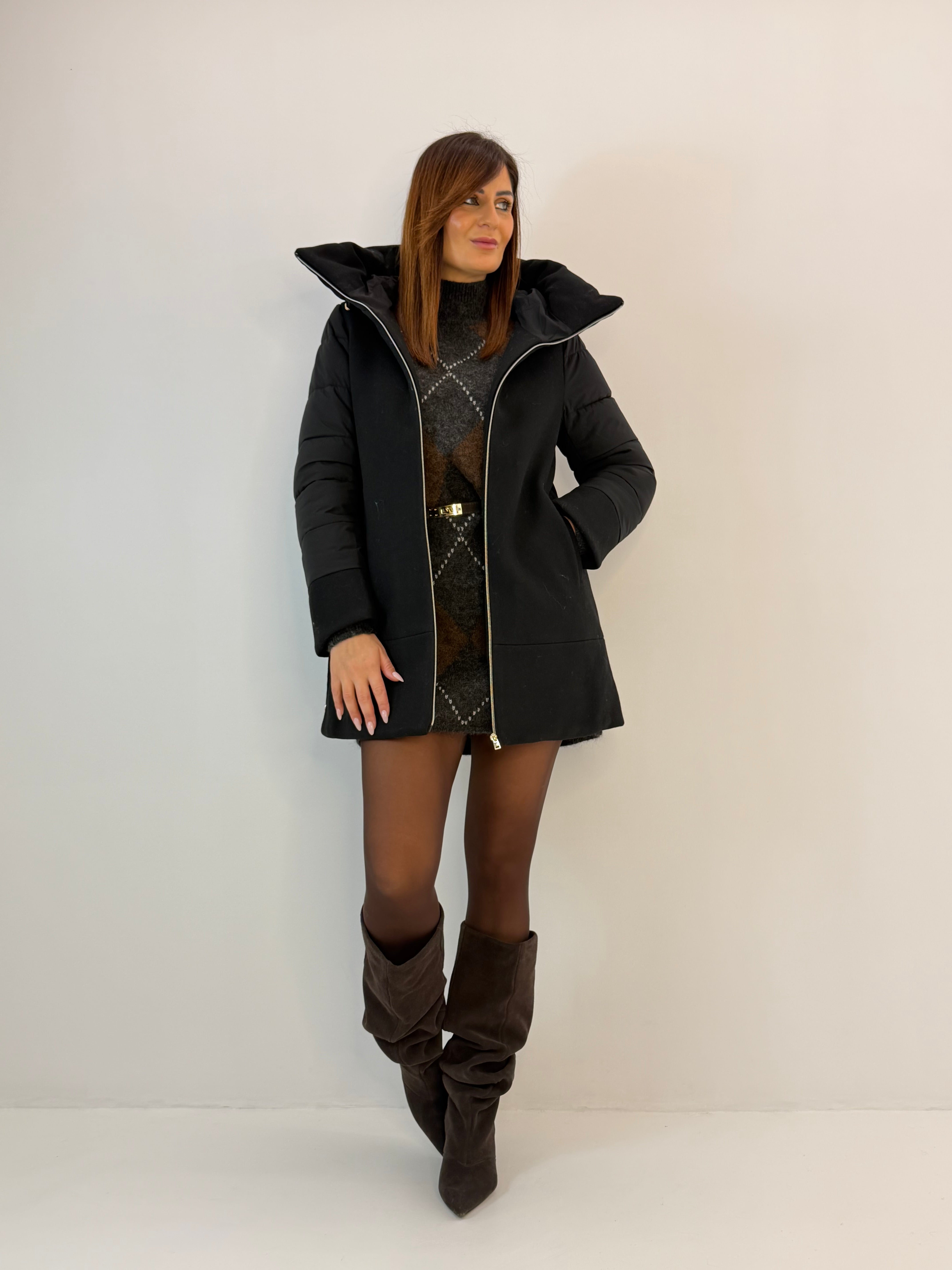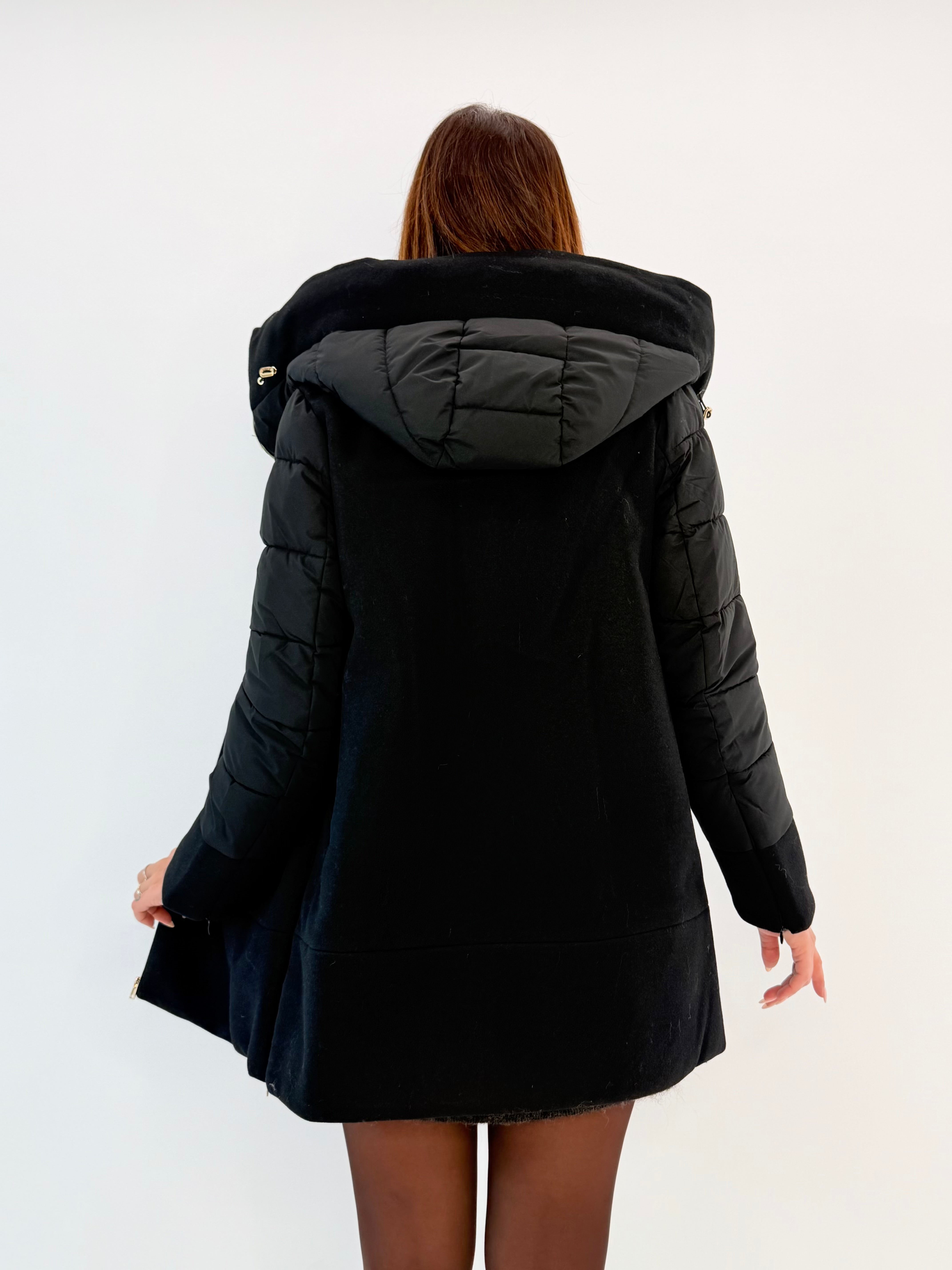 Cappotto piumino in panno con cappuccio, manica in piumino, cerniere laterali e chiusura davanti con zip. Fodera interna, tasche laterali.,
