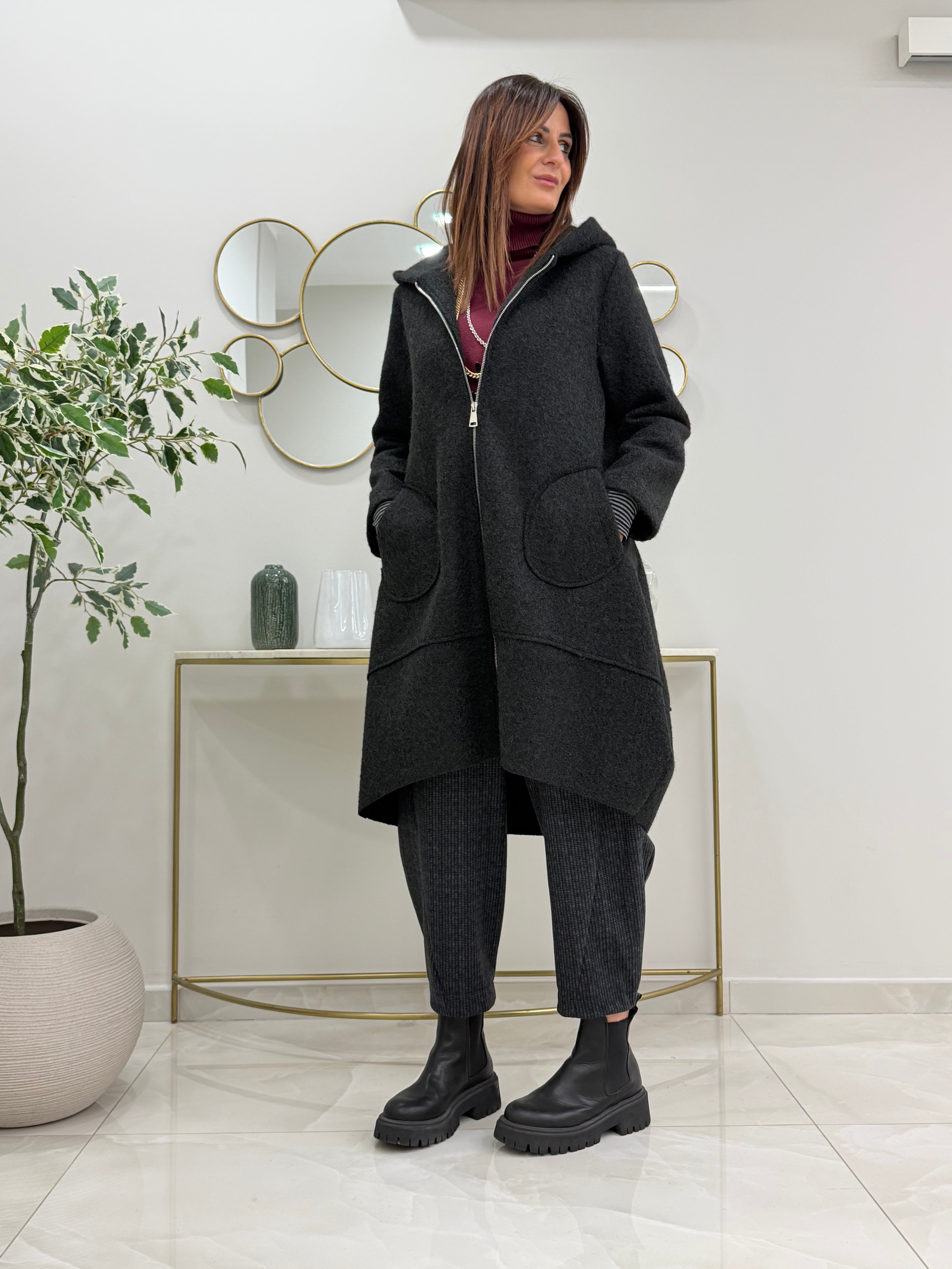 Cappotto in panno con cappuccio, tasche davanti, chiusura con zip davanti. Modello a palloncino, leggermente più lungo dietro.