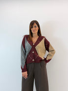 Cardigan in maglia con scollo a V e chiusura con bottoni sul davanti, fondo bordeaux e fantasia a rombi beige e grigio.