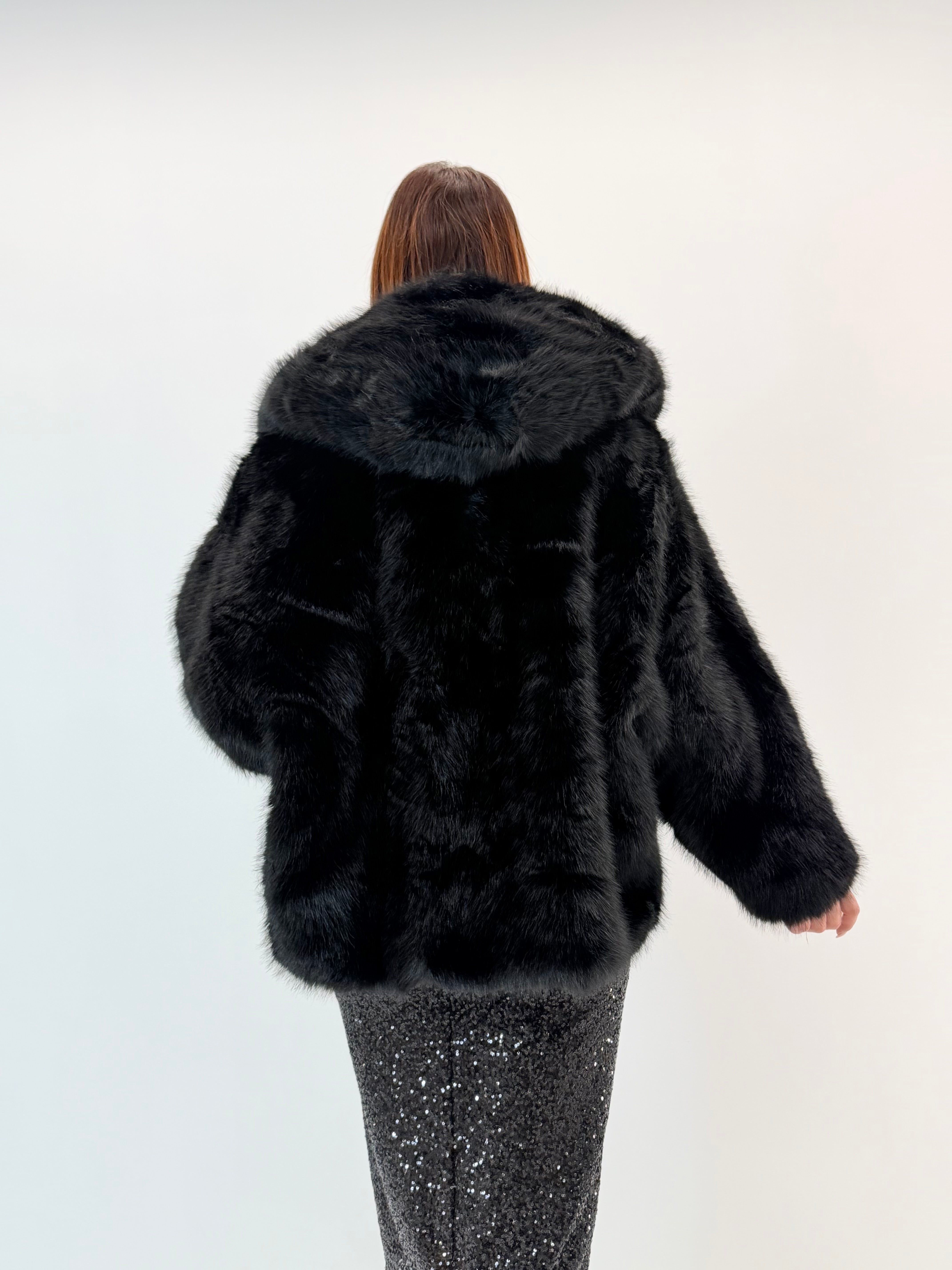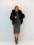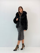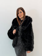 Eco pelliccia con scollo a V, che aggiunge un tocco di lusso e calore, chiusura con gancetto, tasche laterali, stile glamour urbano con un equilibrio tra eleganza e modernità, fodera interna.