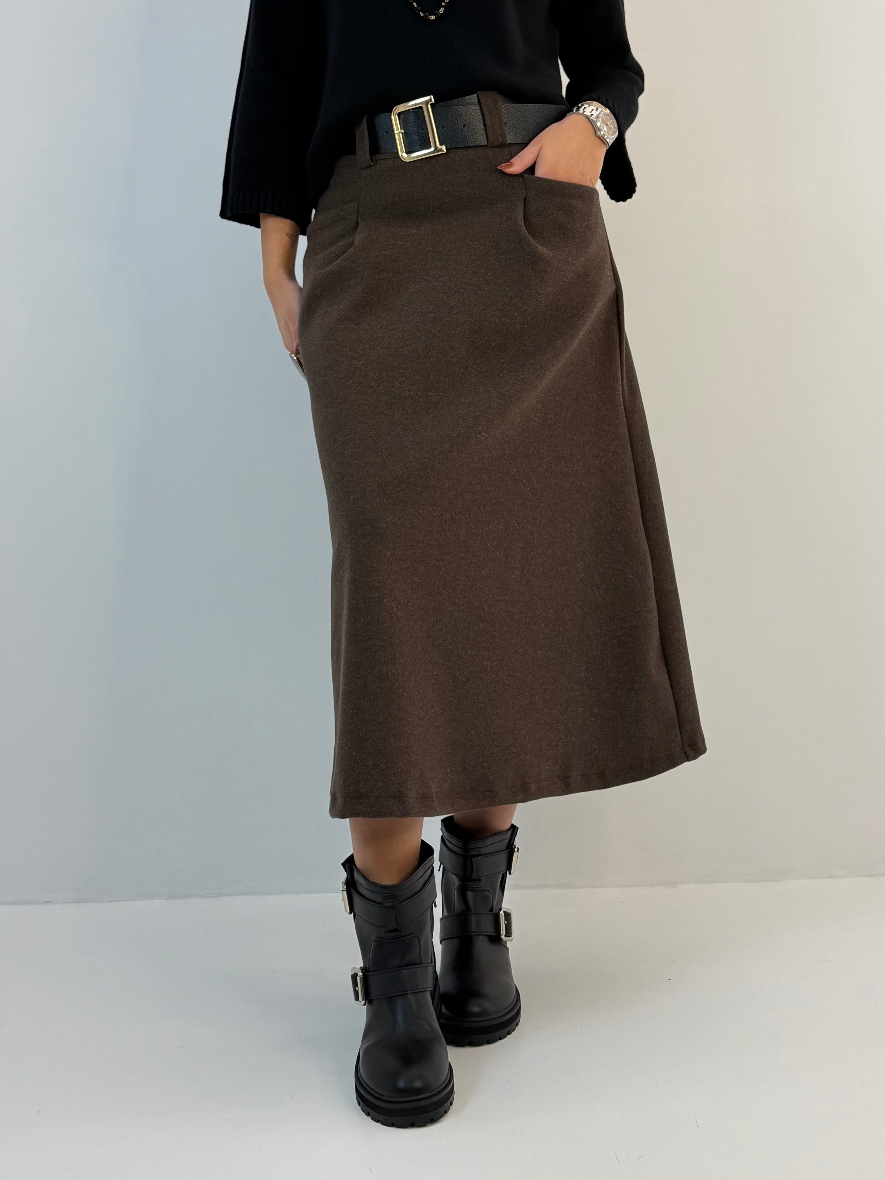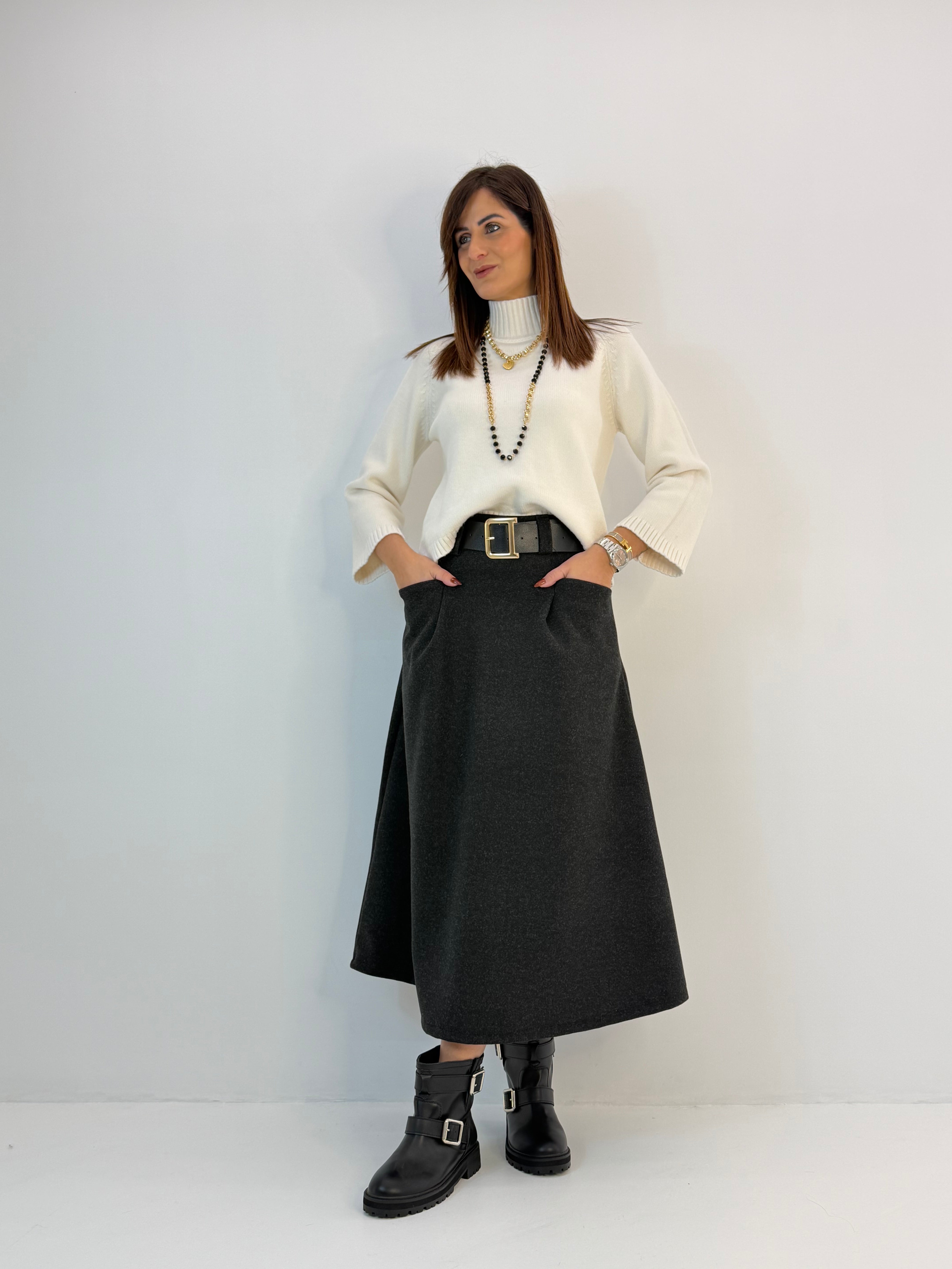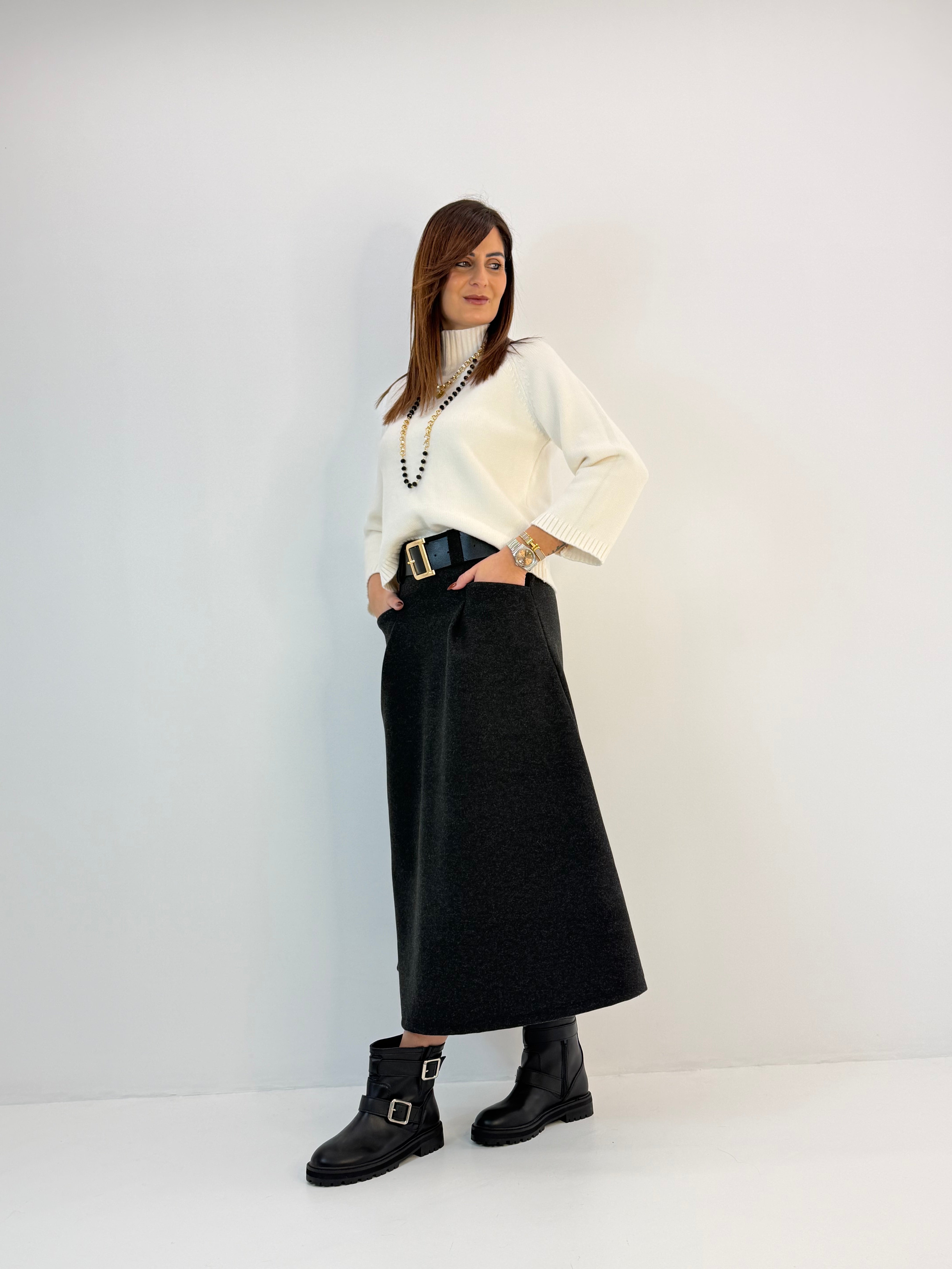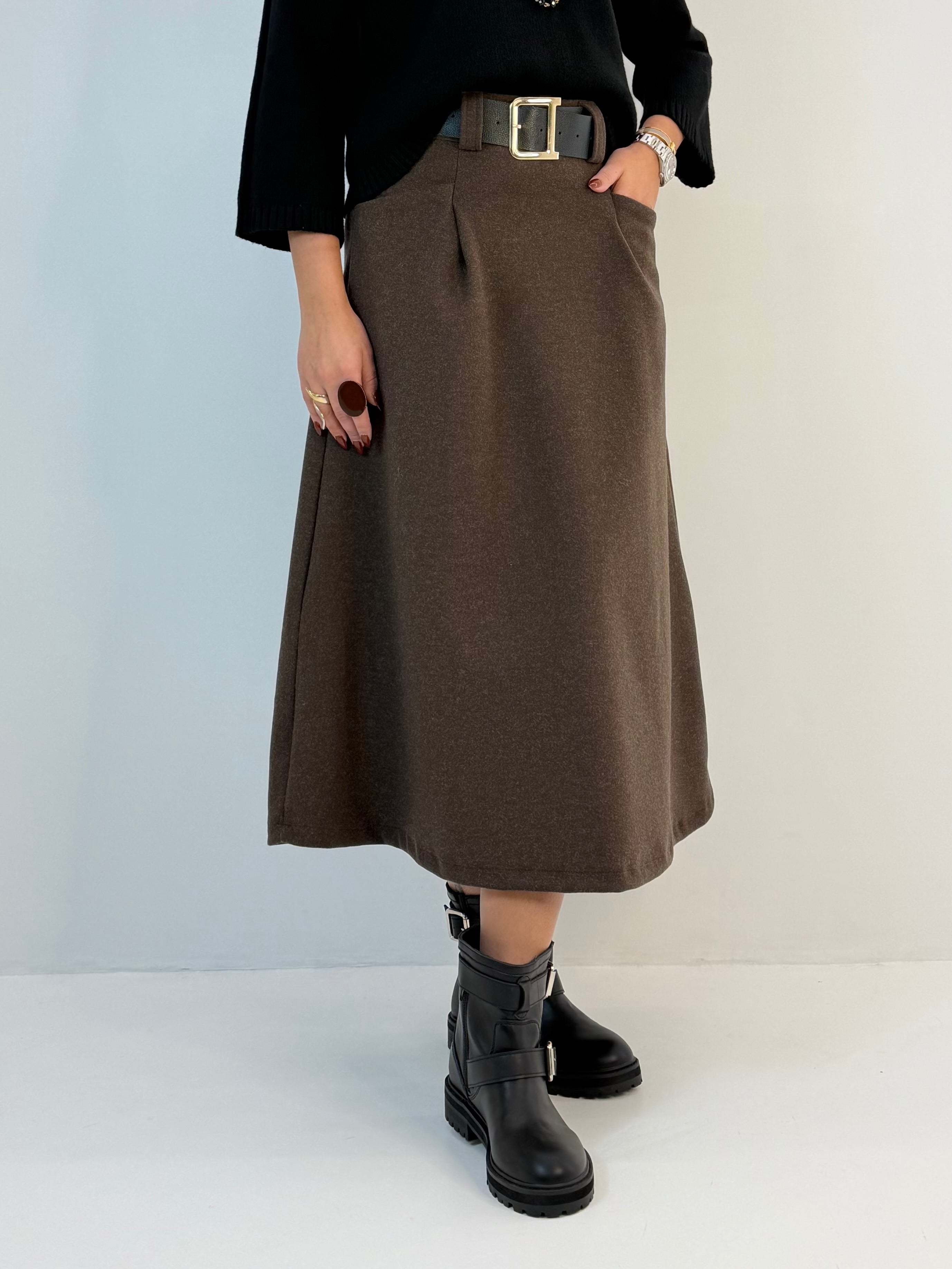 Gonna in panno, modello svasato sul fondo, chiusura dietro con zip. Passanti per cintura, tasche davanti e pinces davanti e dietro.
