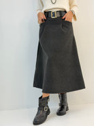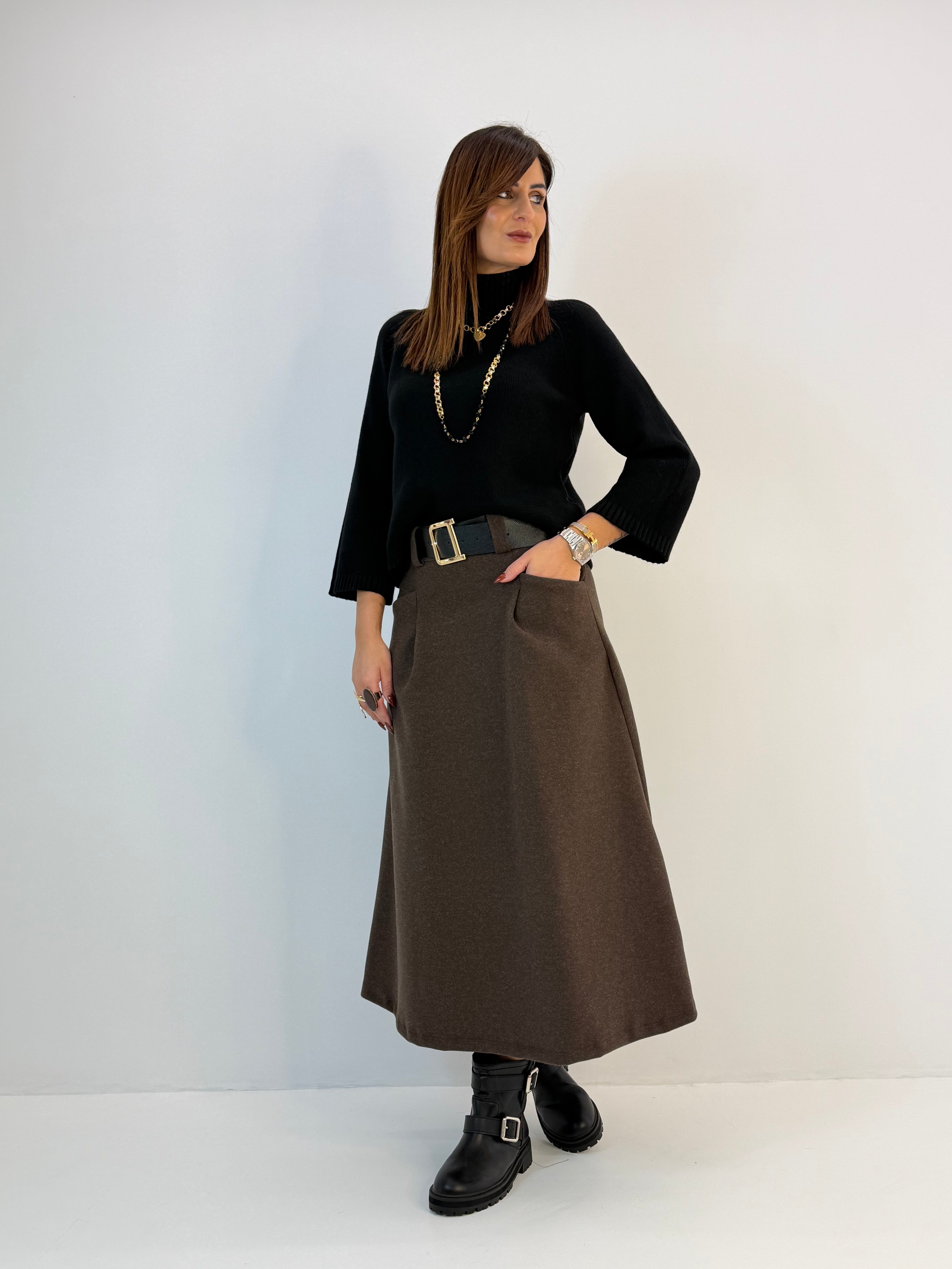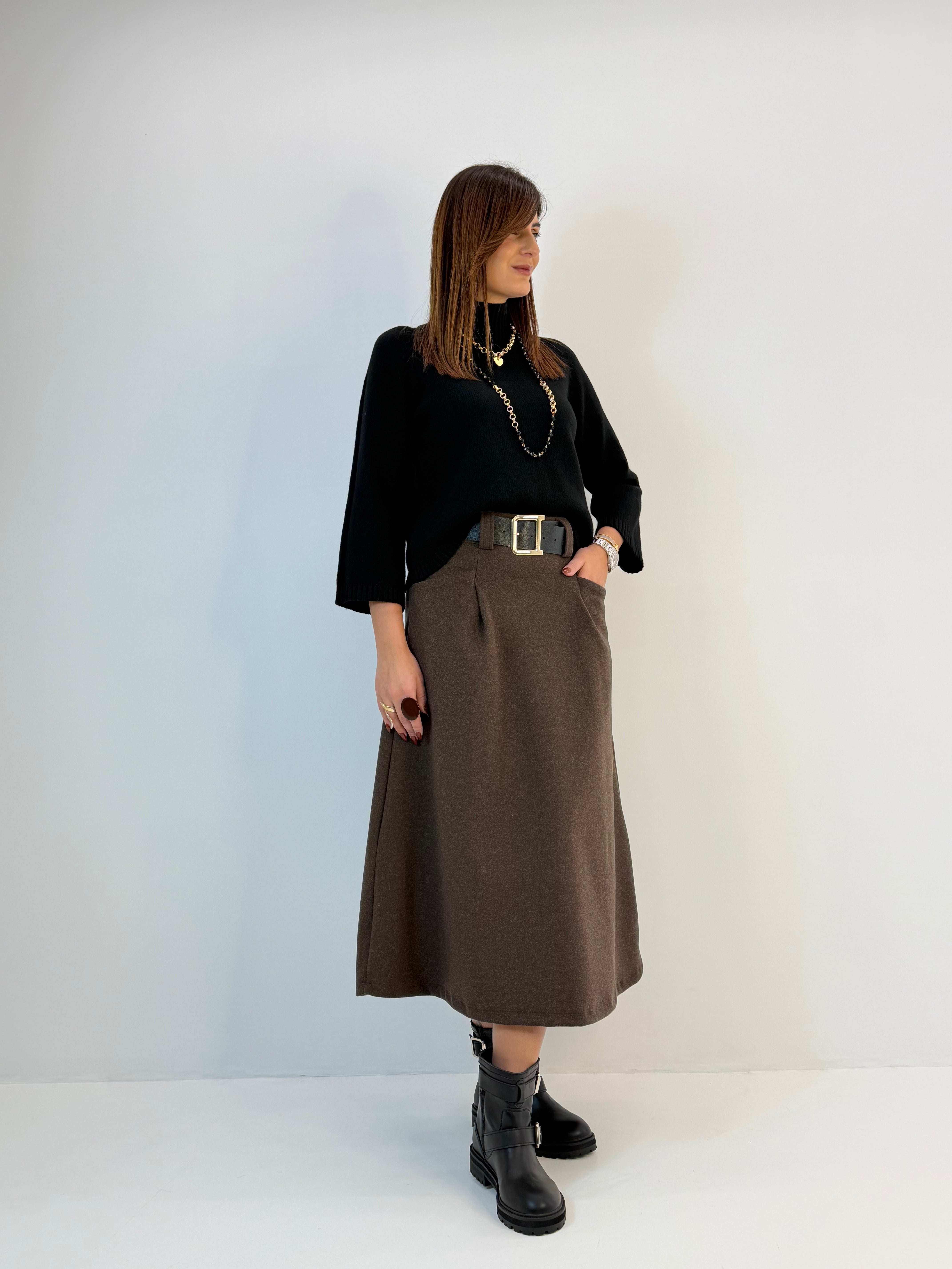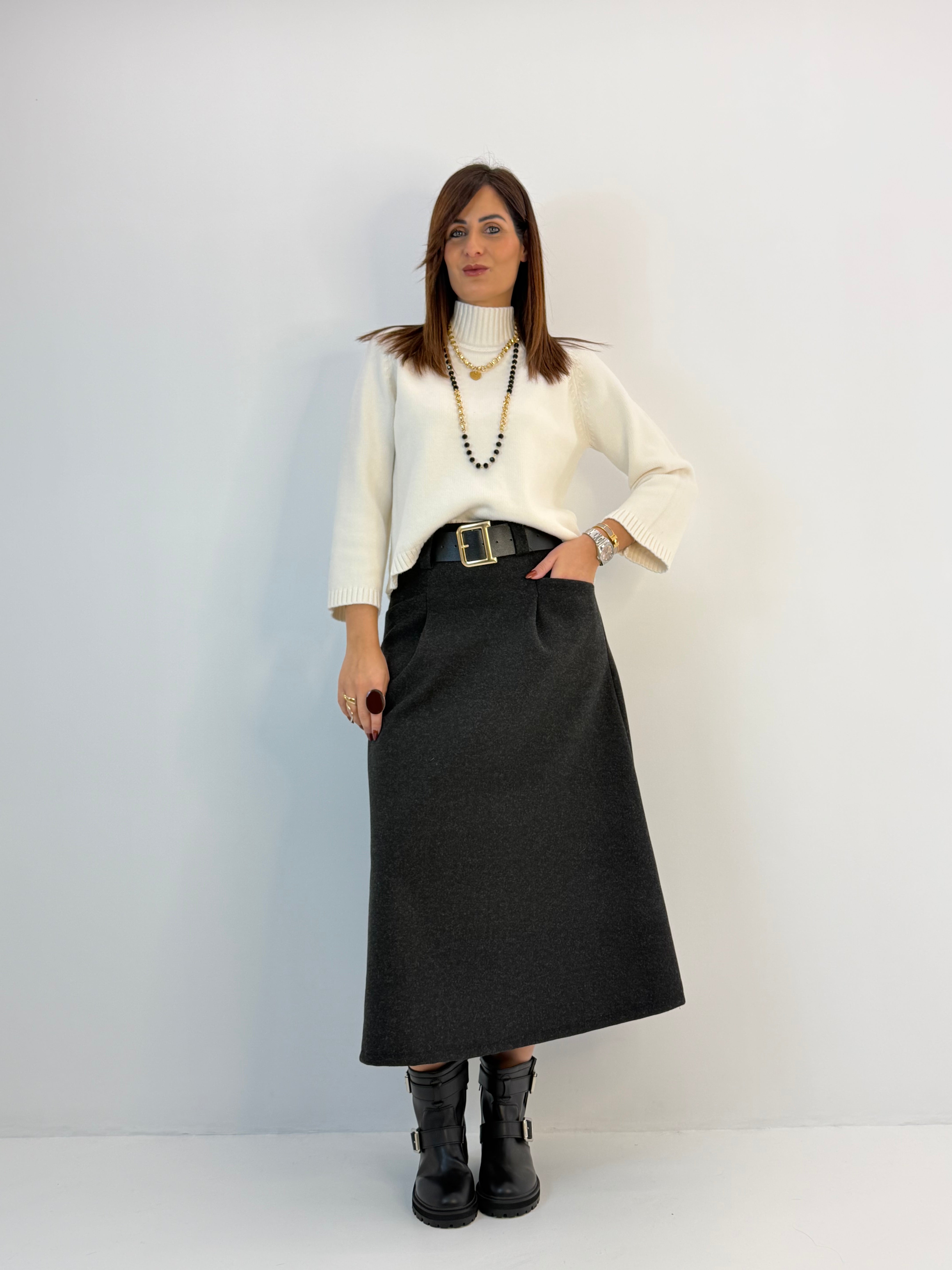 Gonna in panno, modello svasato sul fondo, chiusura dietro con zip. Passanti per cintura, tasche davanti e pinces davanti e dietro.