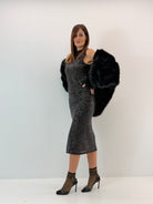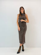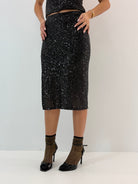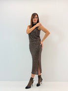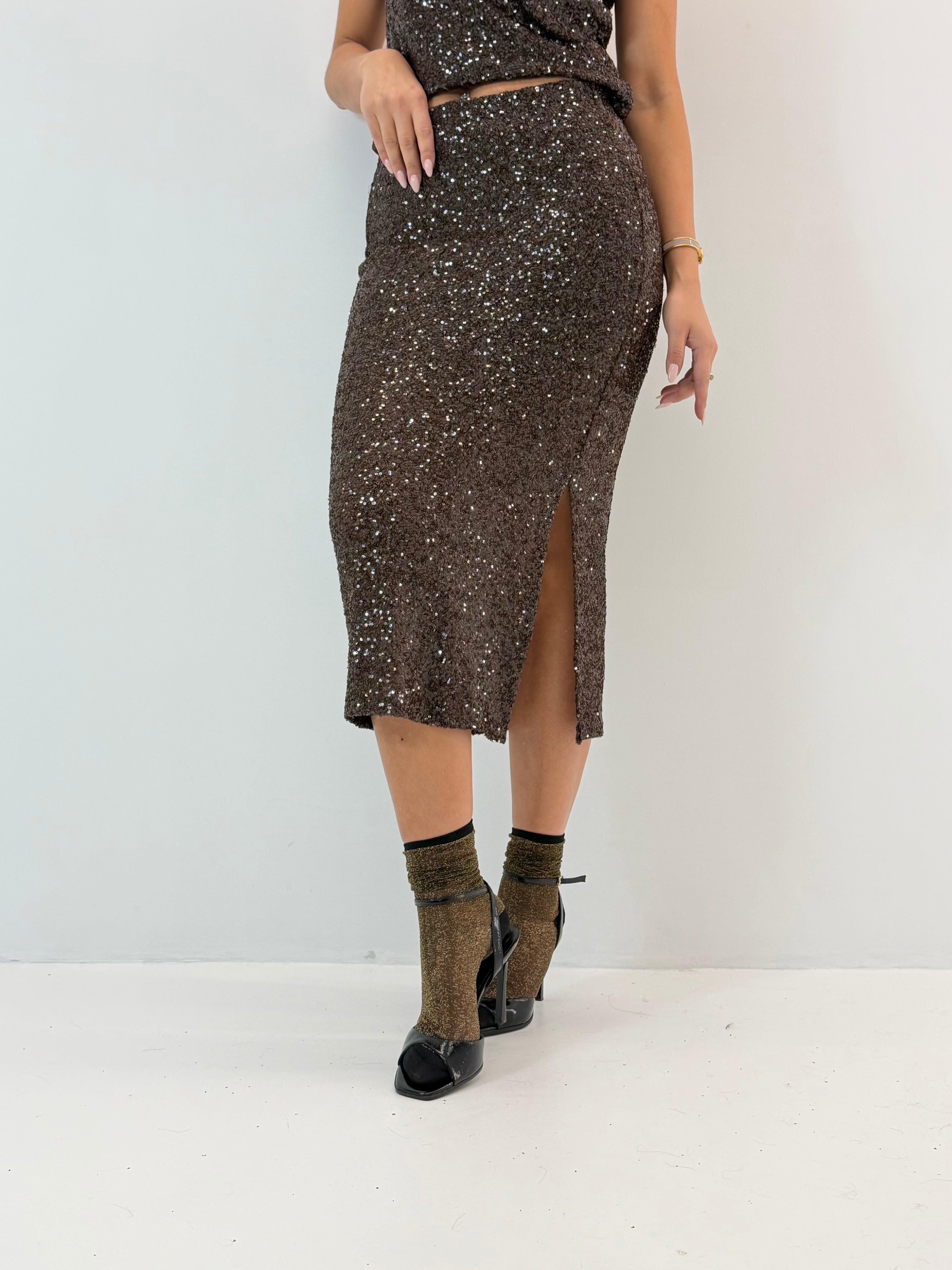 Gonna midi con paillettes, senza chiusure, elastico in vita e spacchetto laterale. Fodera interna.