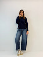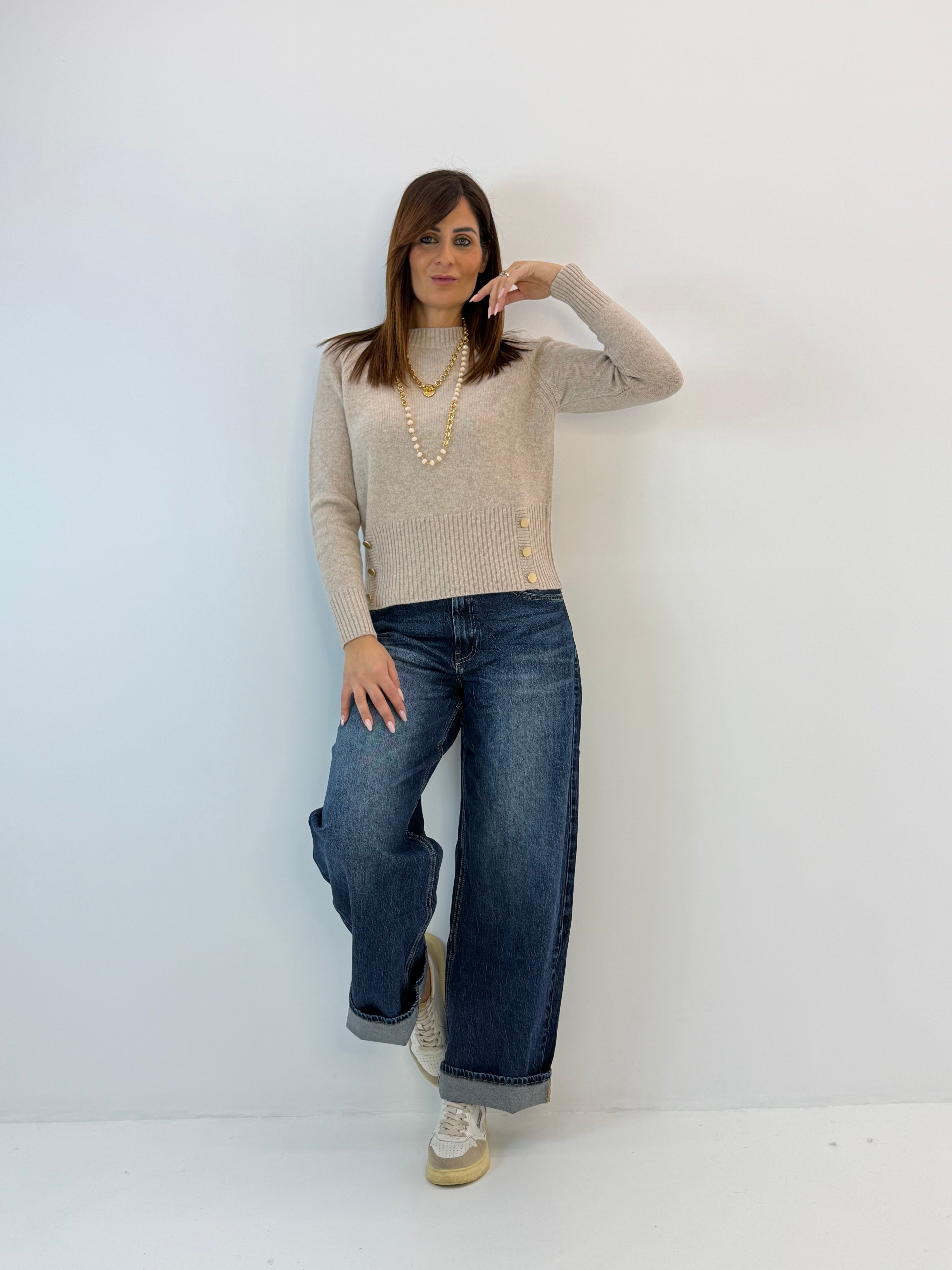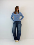 Jeans a vita alta, in cotone, modello a gamba larga. Chiusura frontale con cerniera e bottone, modello a 5 tasche. Vestibilità a taglie.