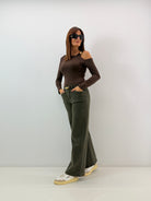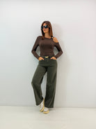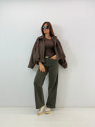 la modella in foto è alta 171 cm veste una 42 e indossa la tg S