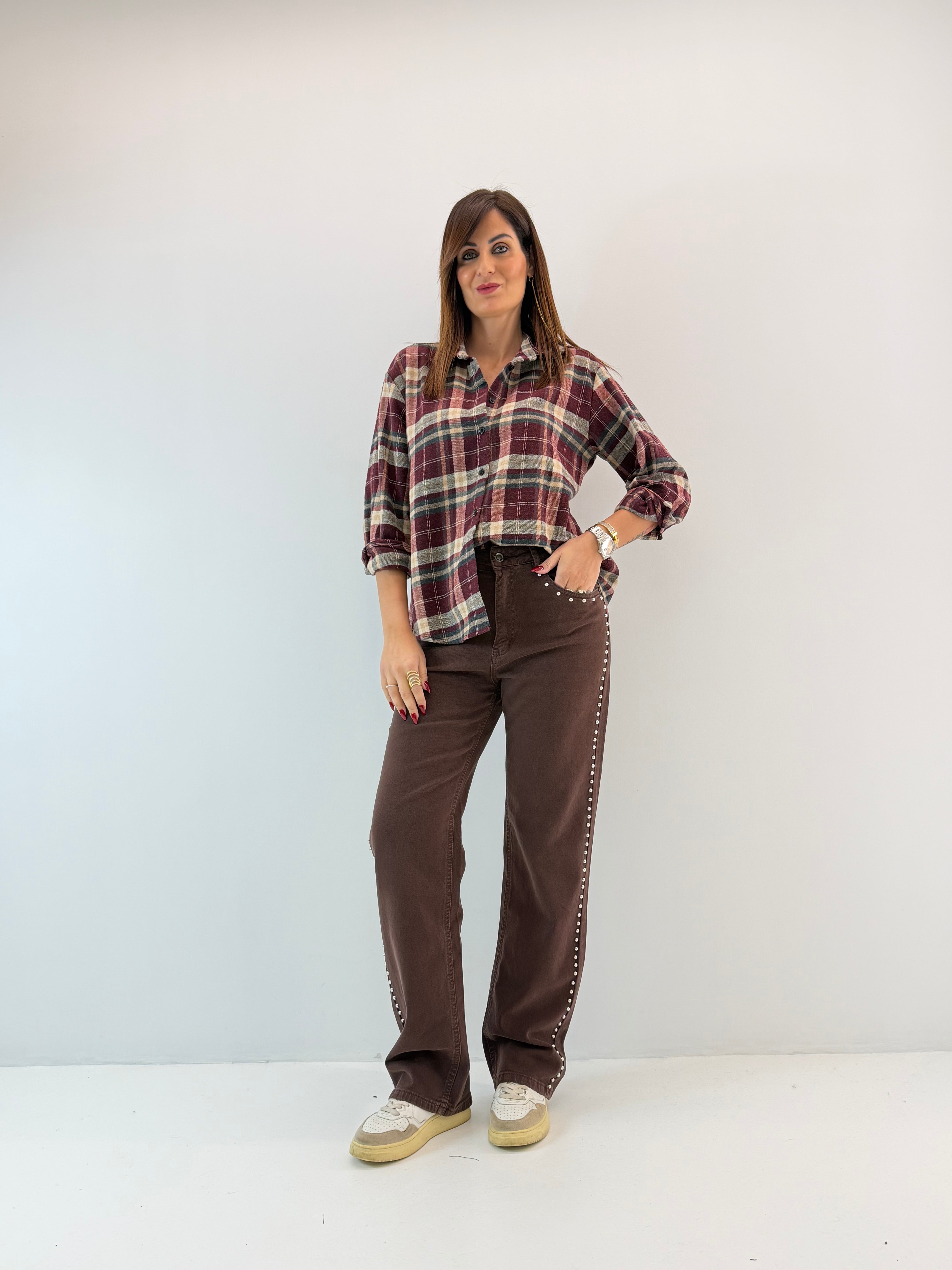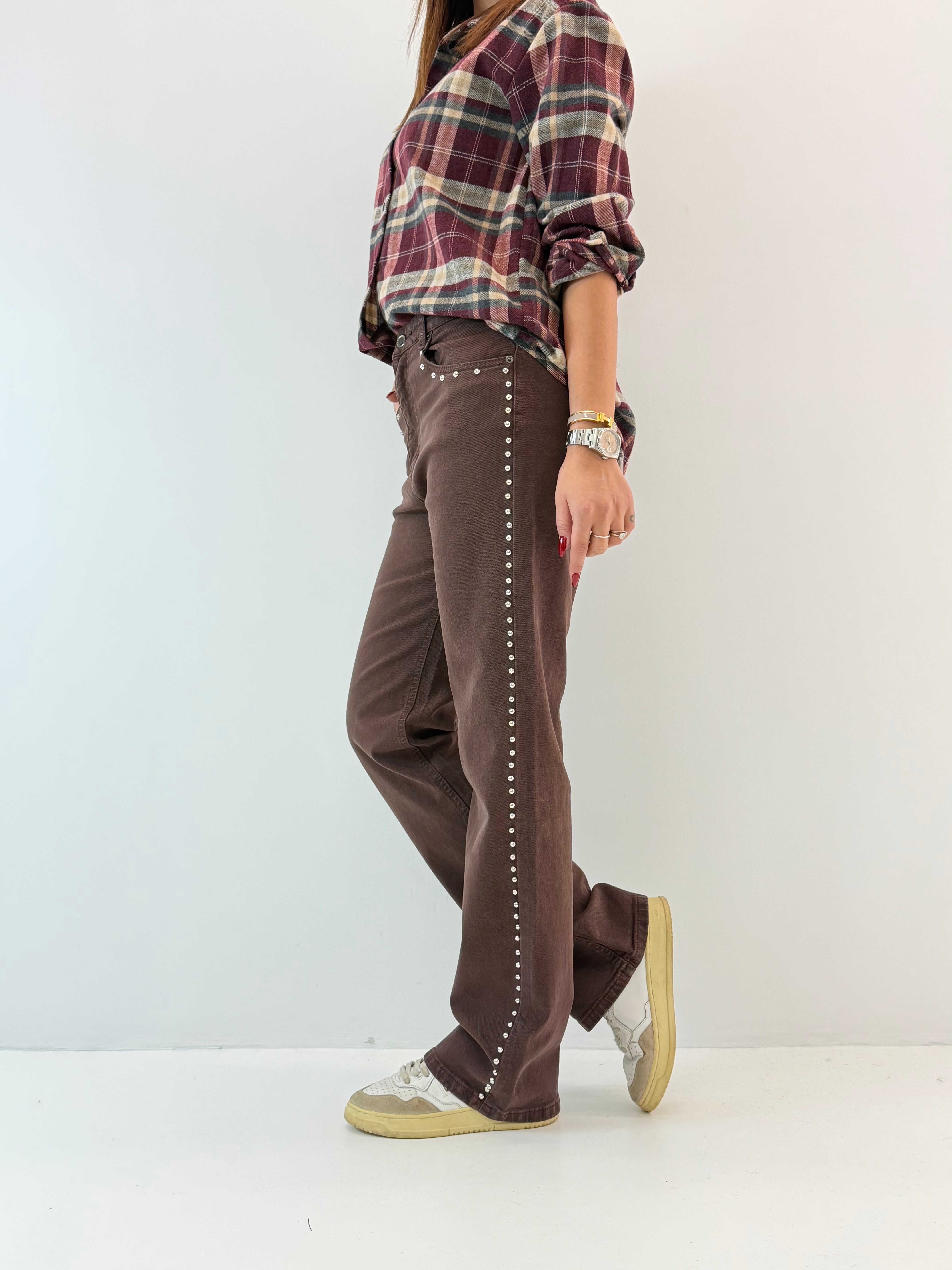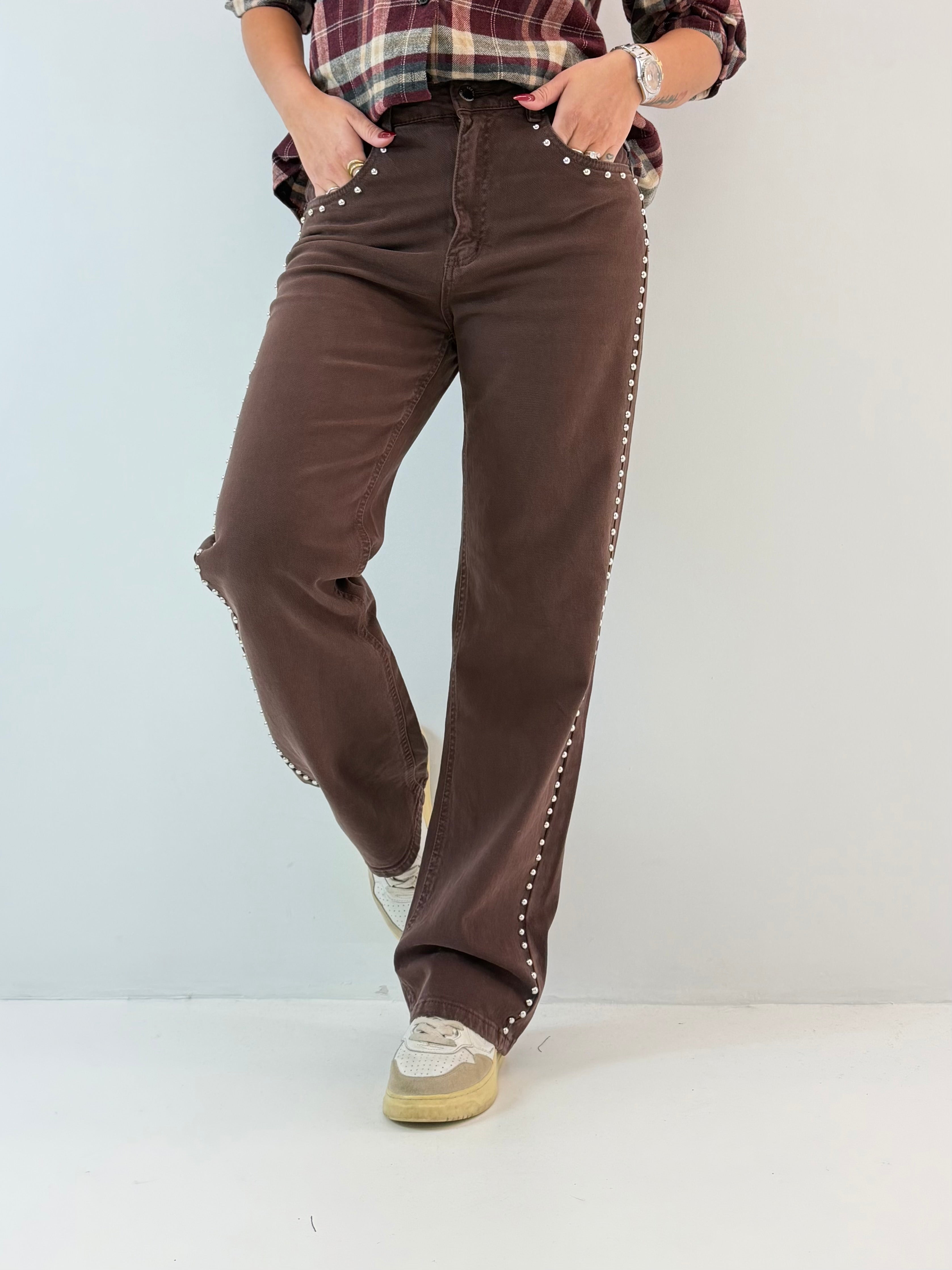 Jeans a vita alta, in cotone, modello regular con applicazioni di borchie laterali sulla gamba. Chiusura frontale con cerniera e bottone, tasche davanti