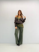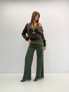 la modella in foto è alta 171 cm veste una 42 e indossa la tg S