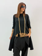 Maglia in cotone, scollo rotondo e spalla morbida. Maniche lunghe. Taglio morbido e leggermente svasato, più lunga dietro e orlo stondato sul davanti. Senza chiusure. Comoda vestibilità.