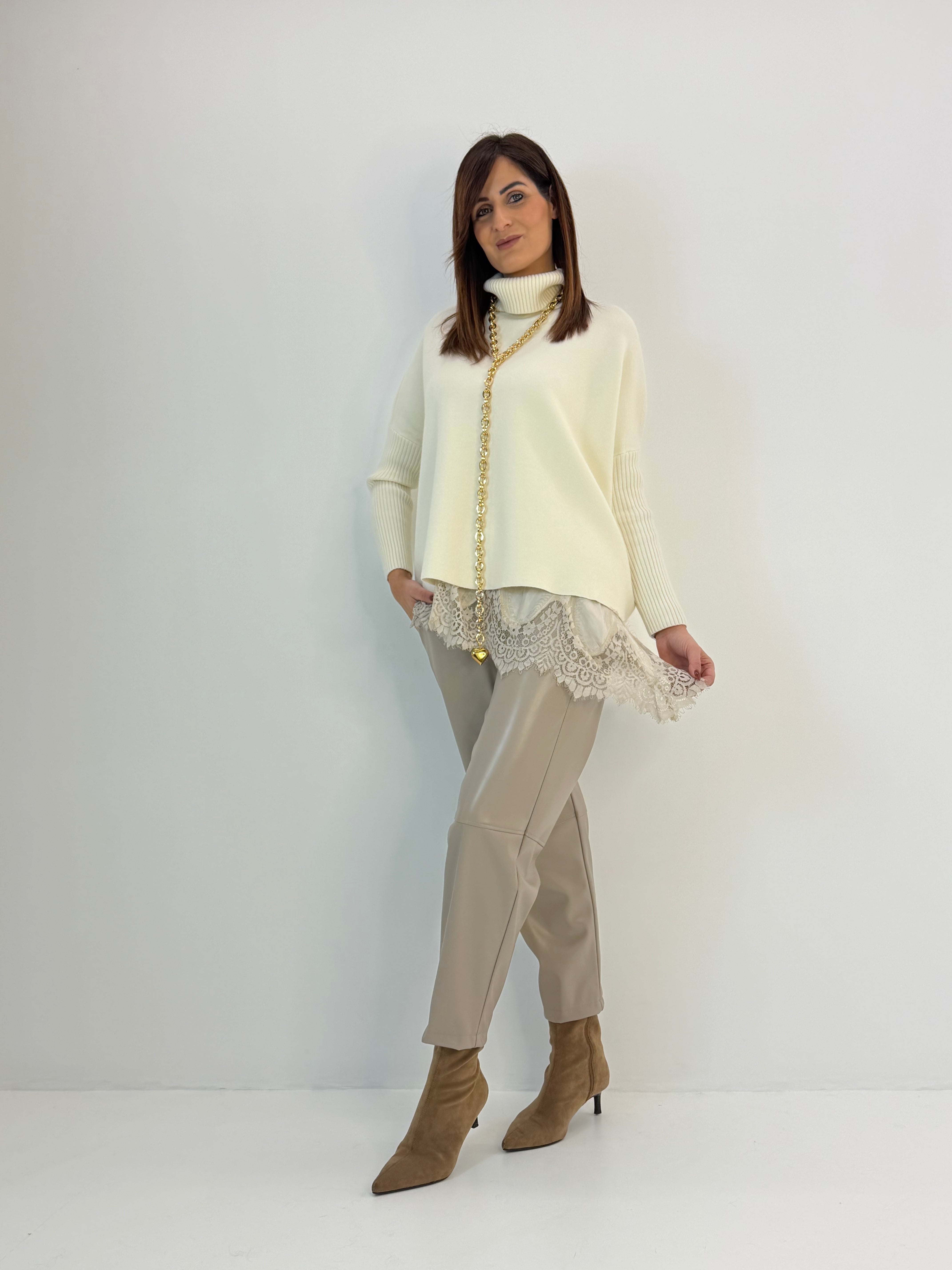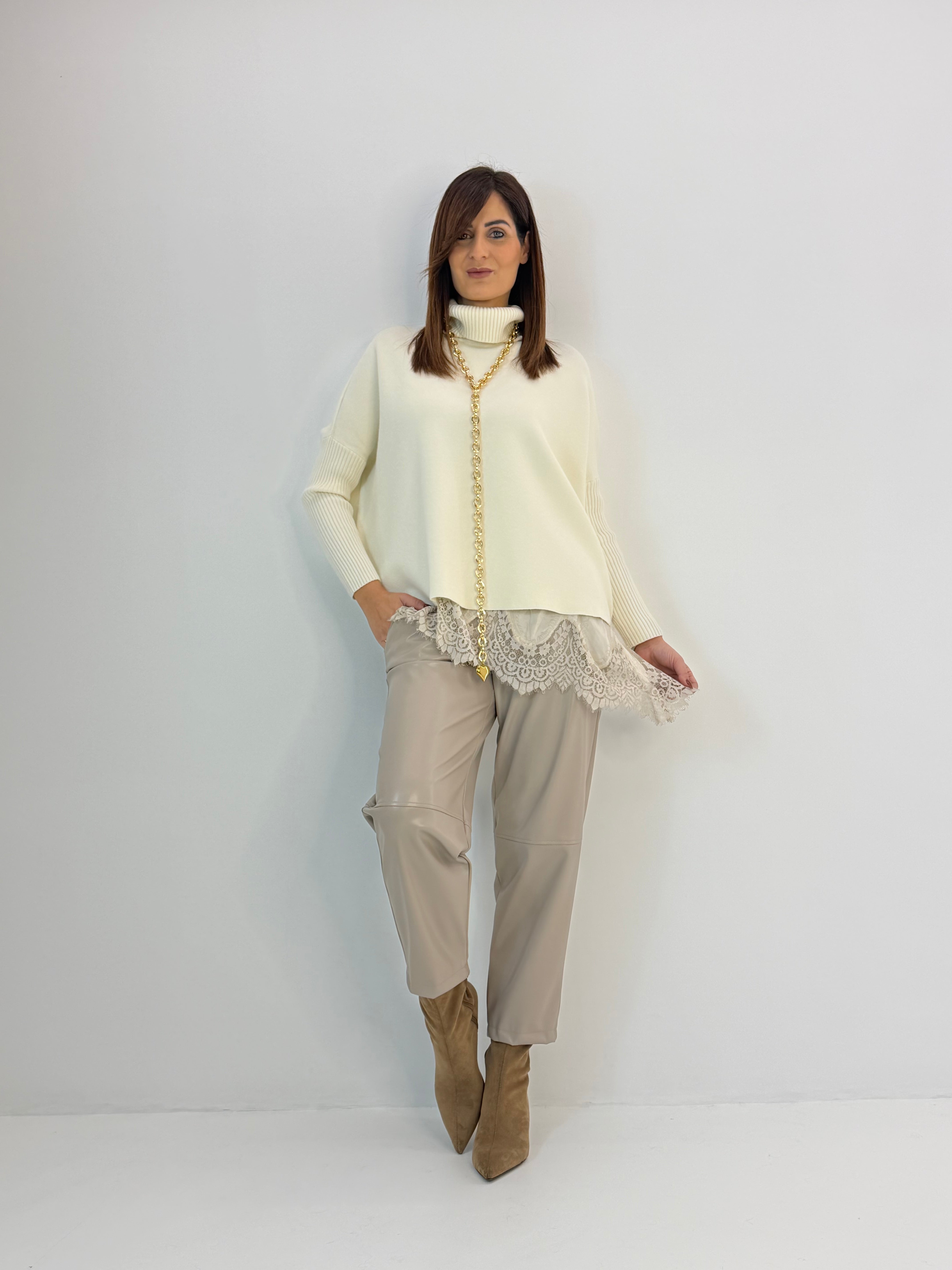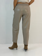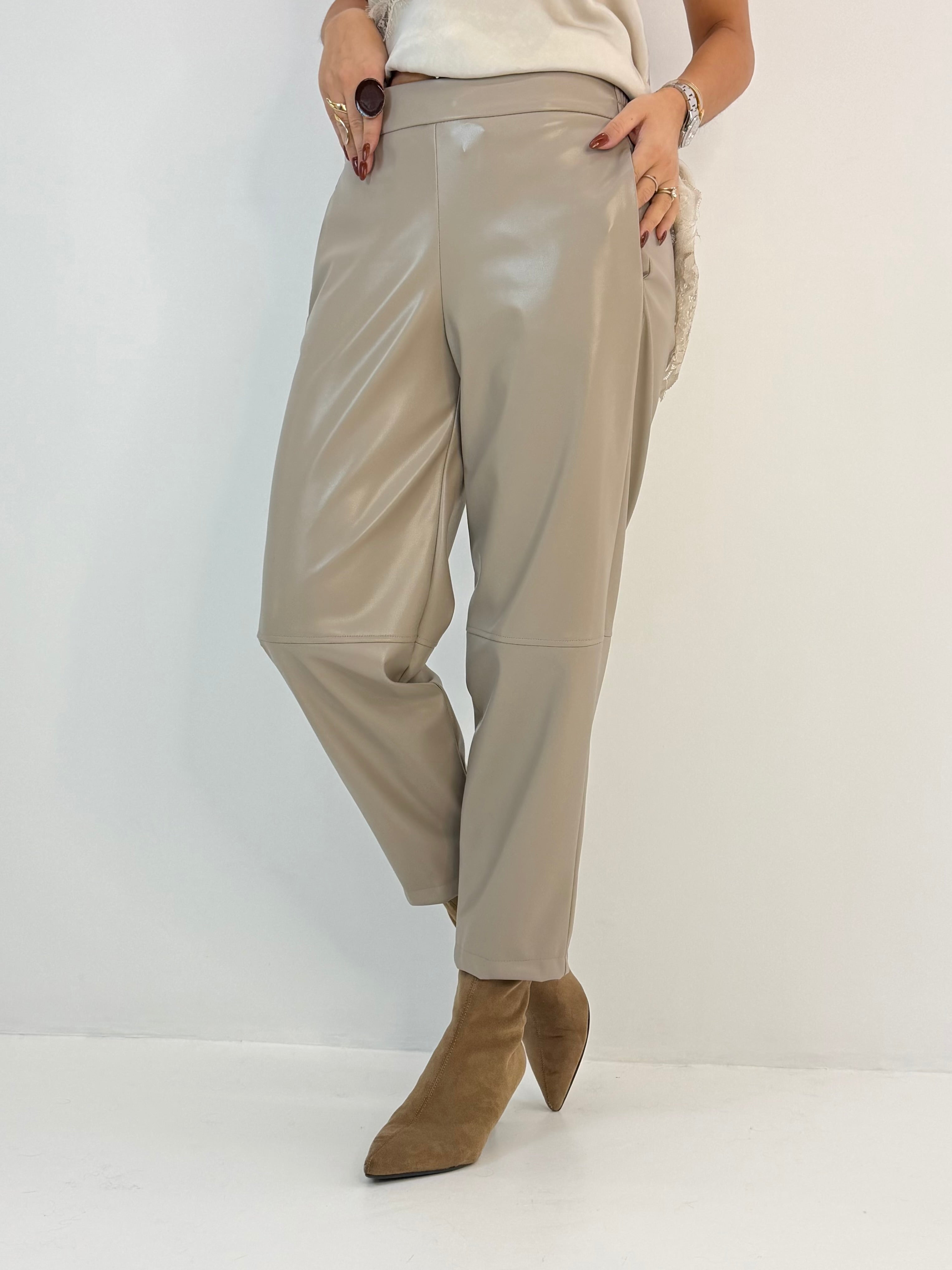 Pantalone in ecopelle. Tasche laterali a scomparsa, senza chiusura, elastico in vita dietro, cuciture a vista sul ginocchio. Vestibilità a taglie.