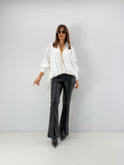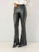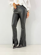 Pantalone in ecopelle, chiusura con zip laterale, spacchetto centrale finale. Vestibilità a taglie.