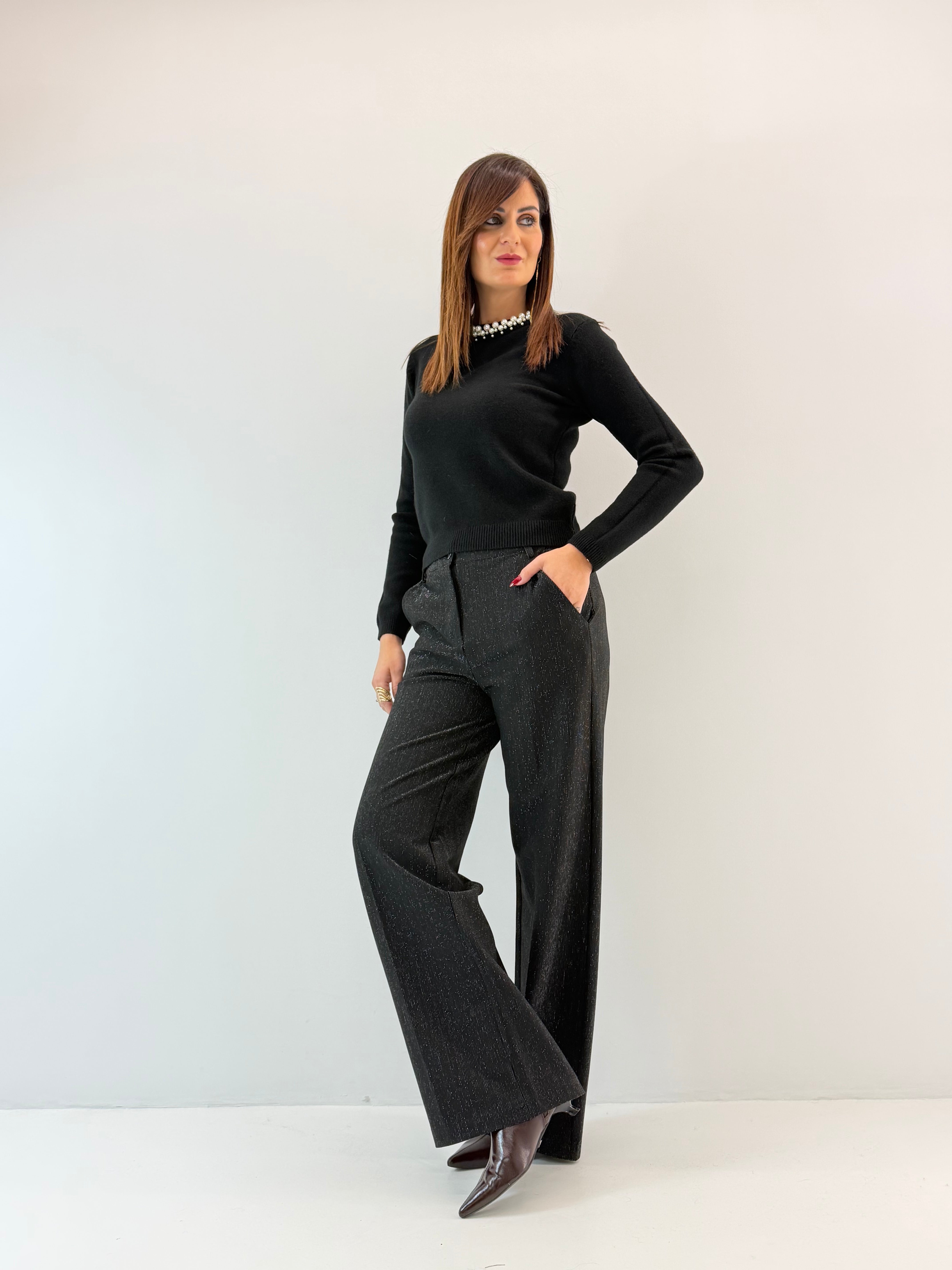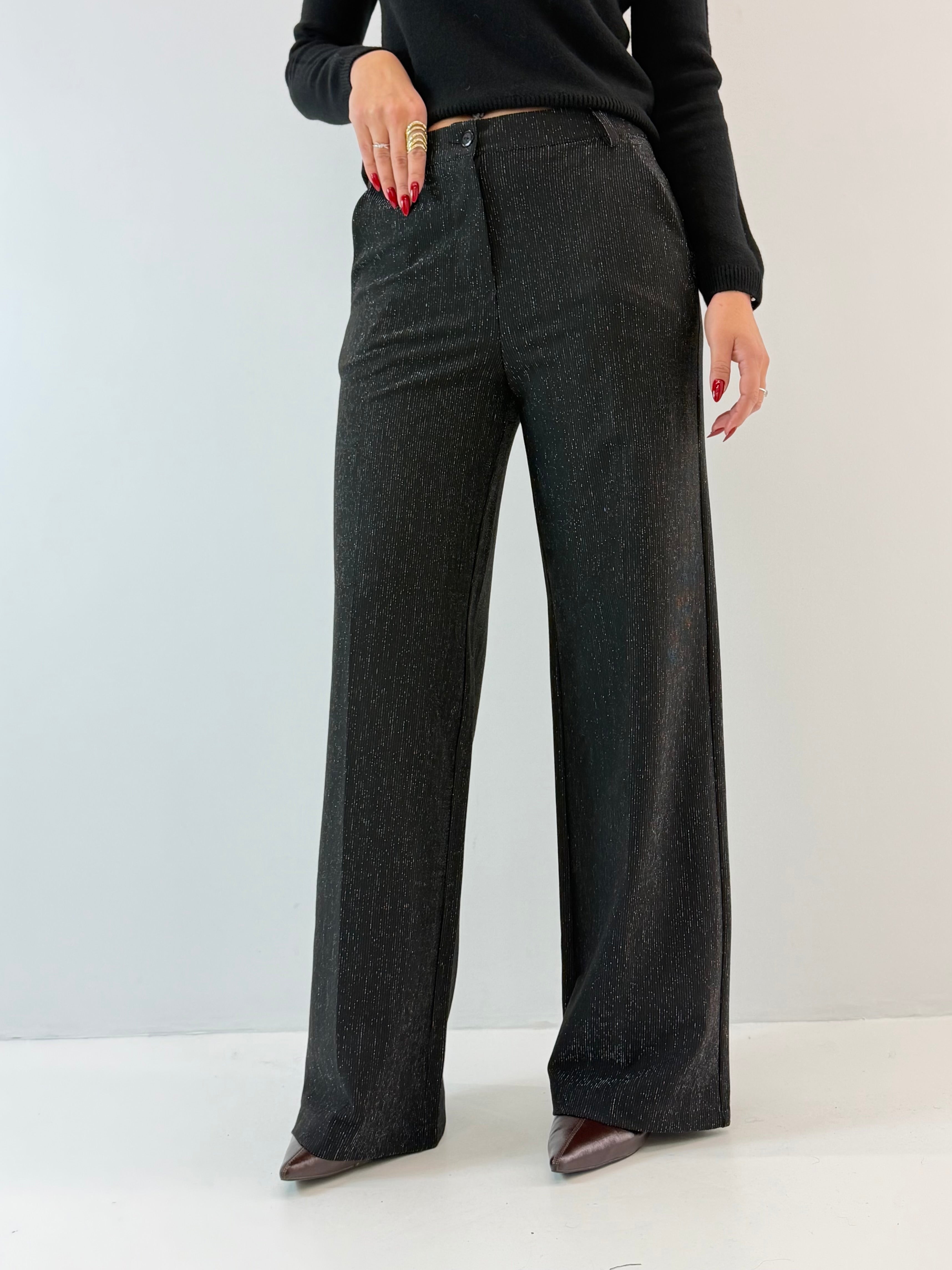 Pantalone palazzo tinta unita con micro lurex, tasche laterali a lunetta, chiusura con bottone e zip. Vestibilità a taglie.